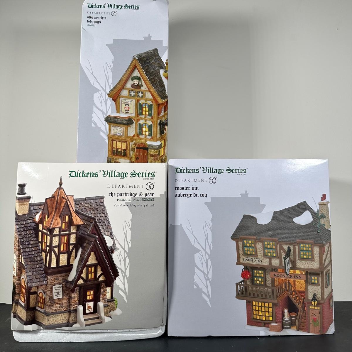 LOT 185U: Department 56 Dickens Village Series - The Partridge & Pear, Rooster Inn & Olde Pearly’s Toby Jugs