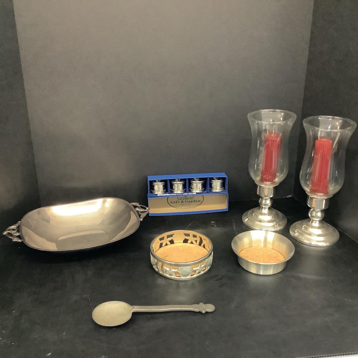 Lot 1099   Danish Silverplate Bowl by Godoy Fraberg, Pewter Coasters, Napkin Ring,& Candlesticks