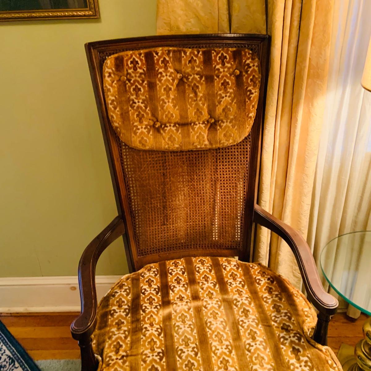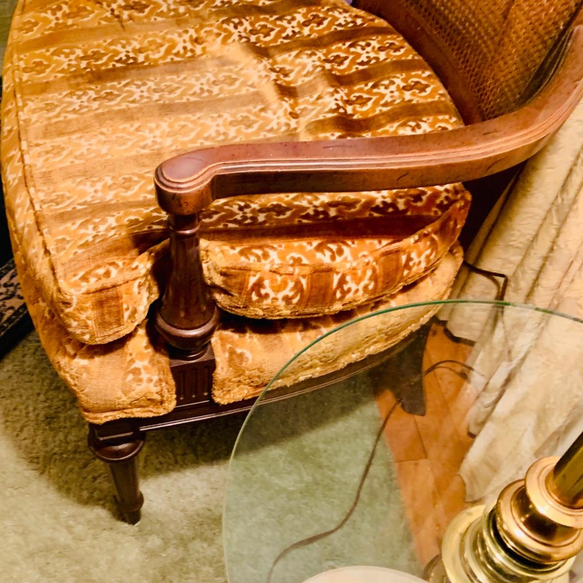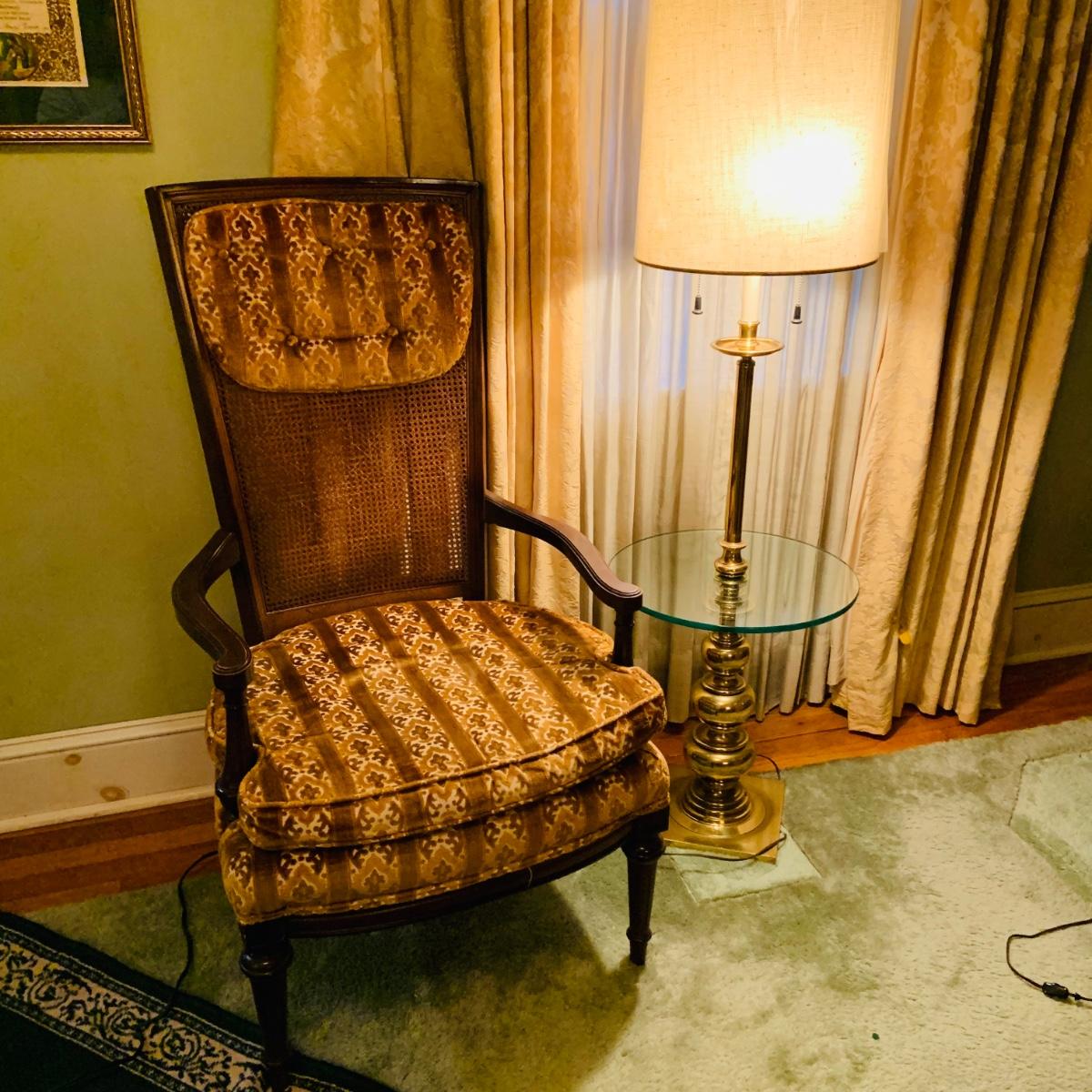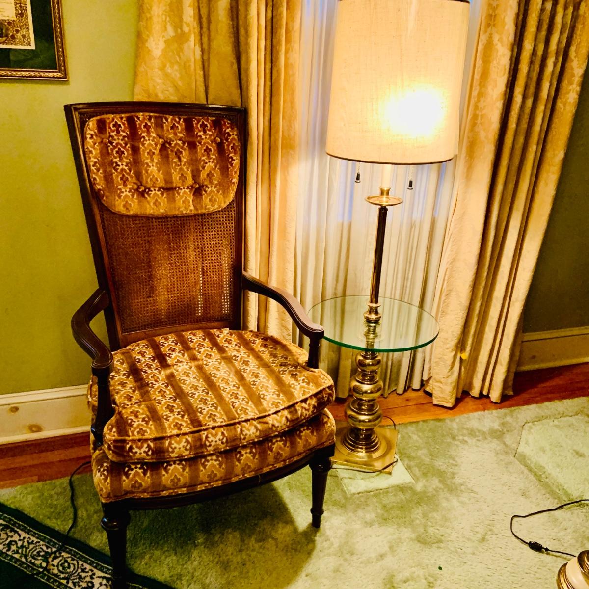 LOT:45: Vintage Cane Back Arm Chair by Moore Furniture and a Stiffel Brass Floor Lamp with Glass Table