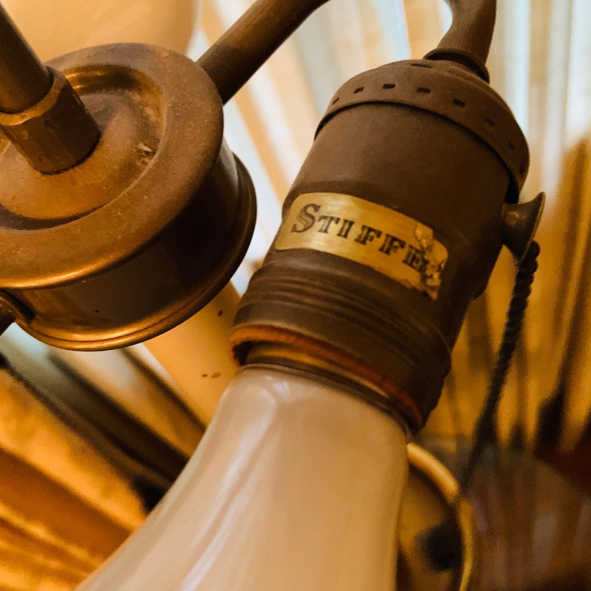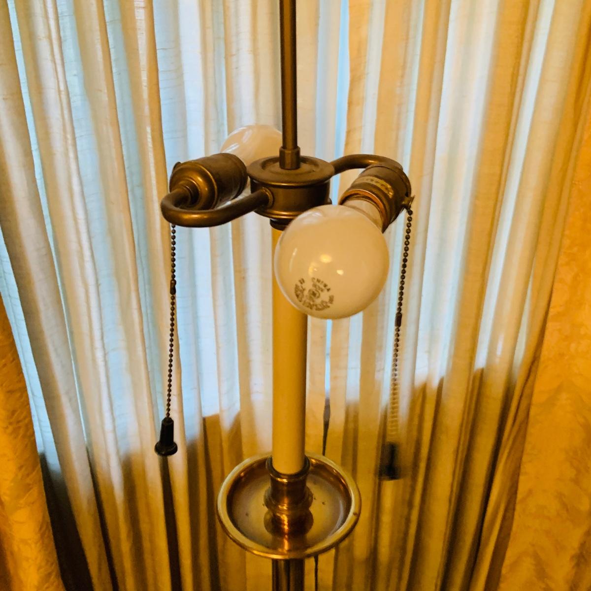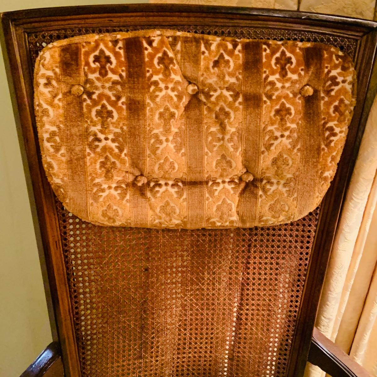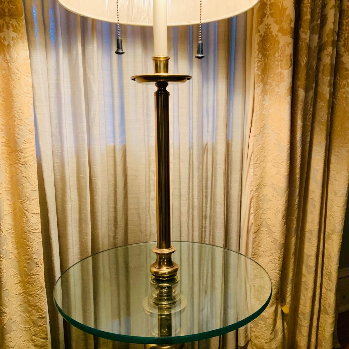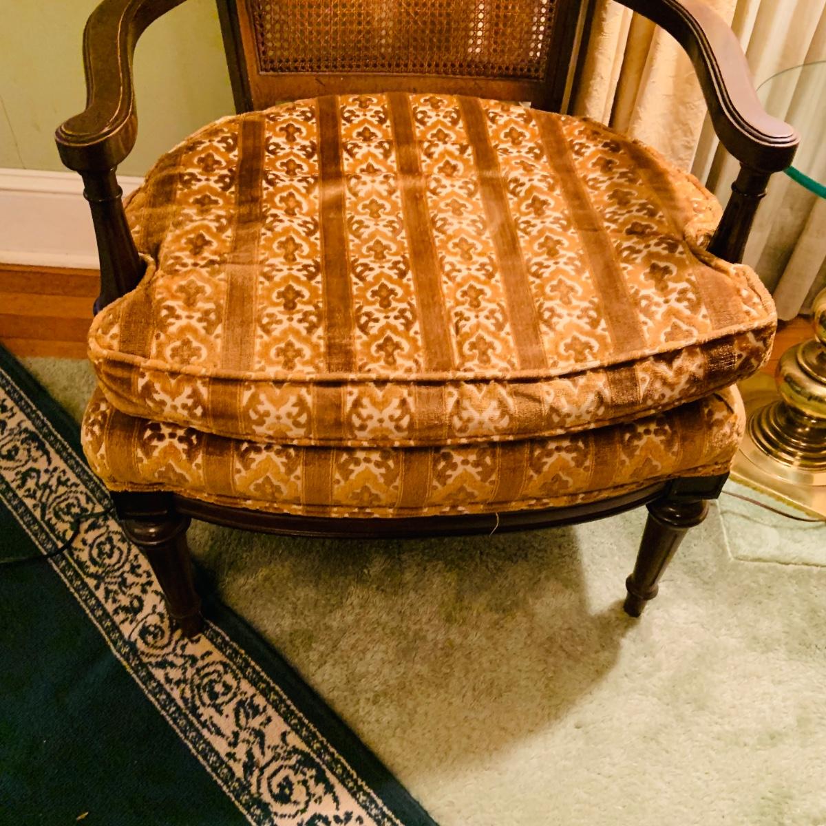 LOT:45: Vintage Cane Back Arm Chair by Moore Furniture and a Stiffel Brass Floor Lamp with Glass Table
