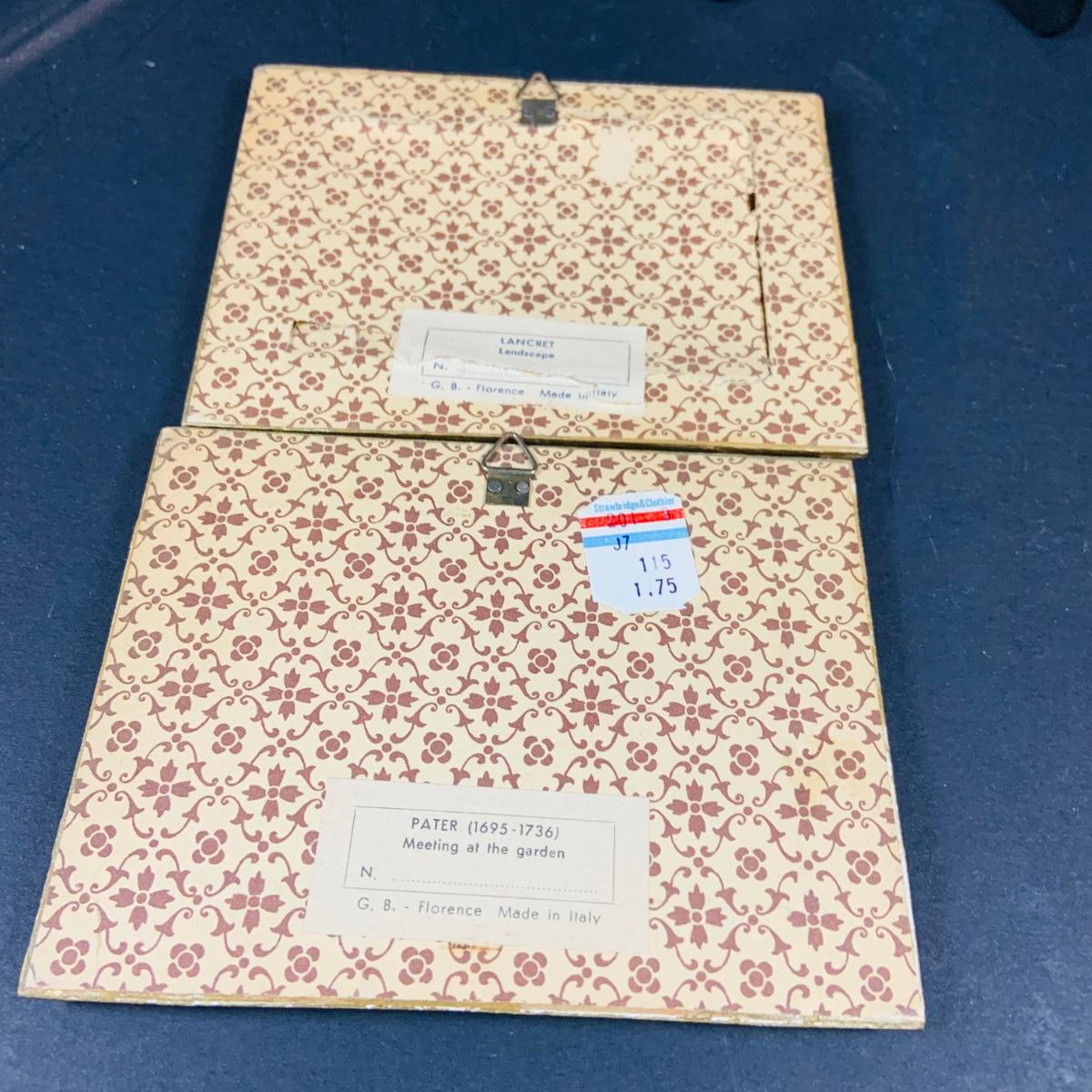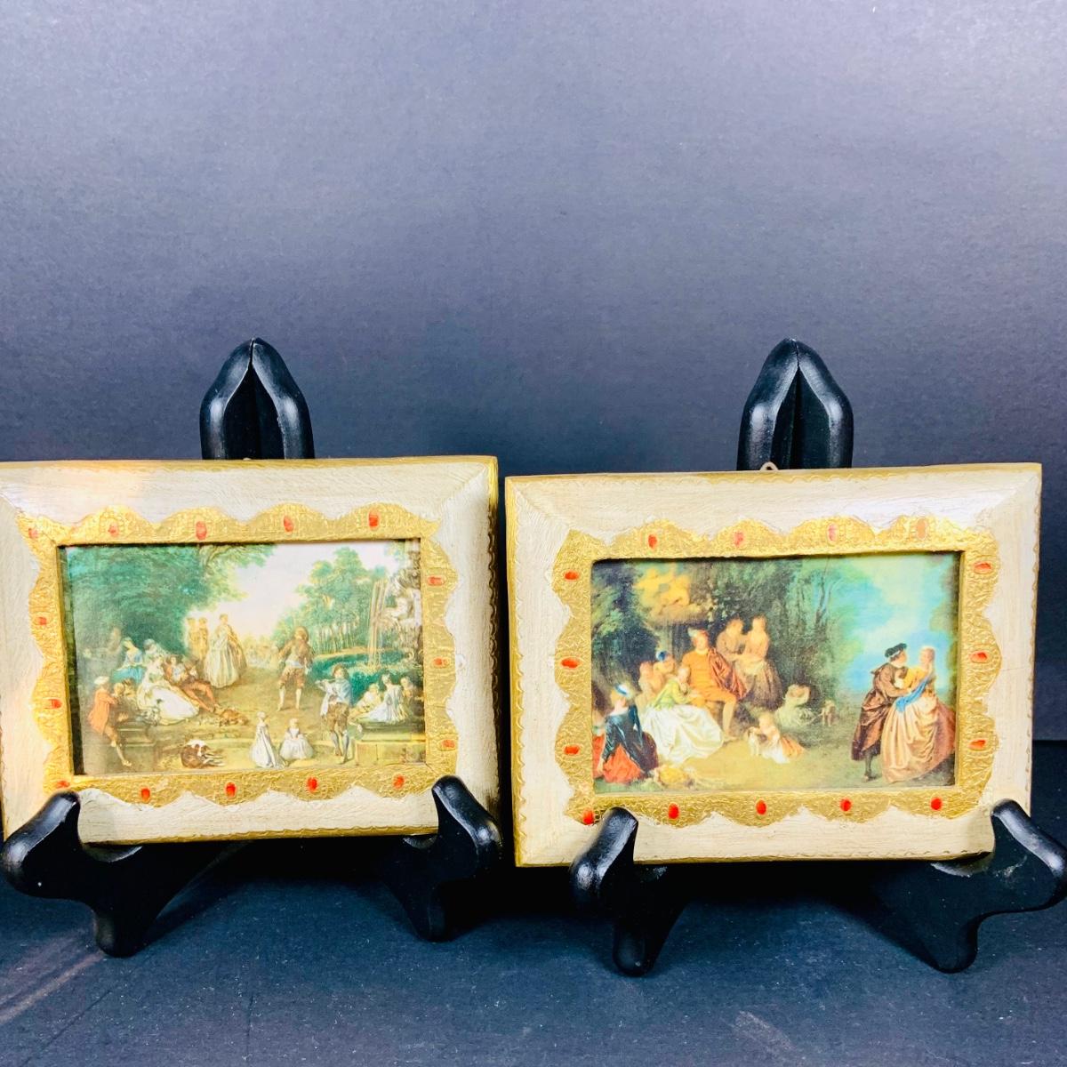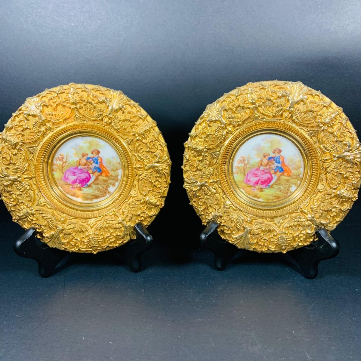 LOT:44: Vintage French Ornate Brass Framed Porcelain Cameos by Fragonard, Miniature Wall Art Porcelain Ashtrays and Mini Plates