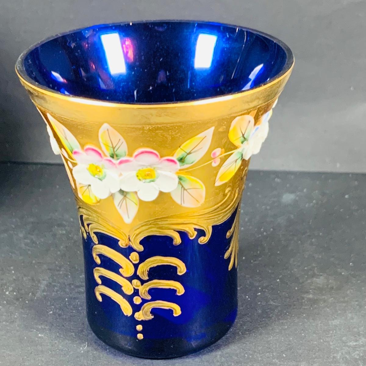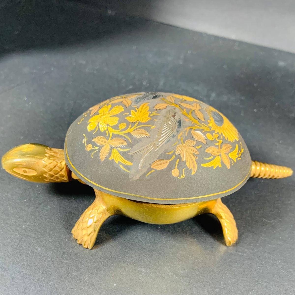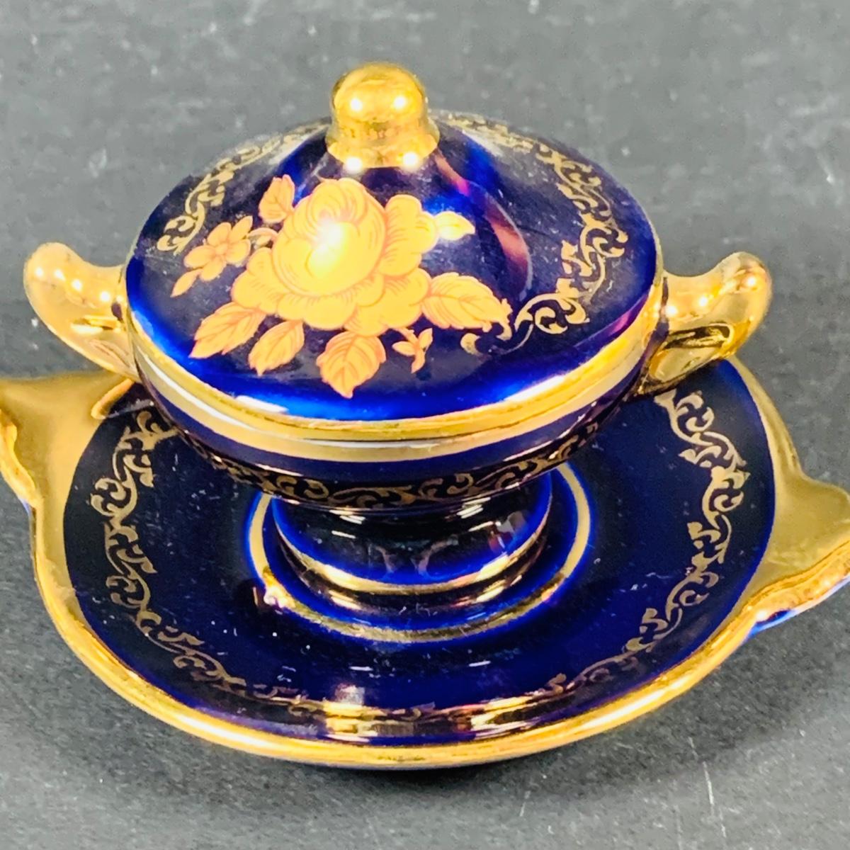 LOT:50: Vintage BOJ Eibar Spanish Brass Turtle Bell, Vintage Cobalt Blue Hand Painted Glass Vase/Glass, Mini Limoges Soup Tureen, Plate Portrait and Floral Brass Vase