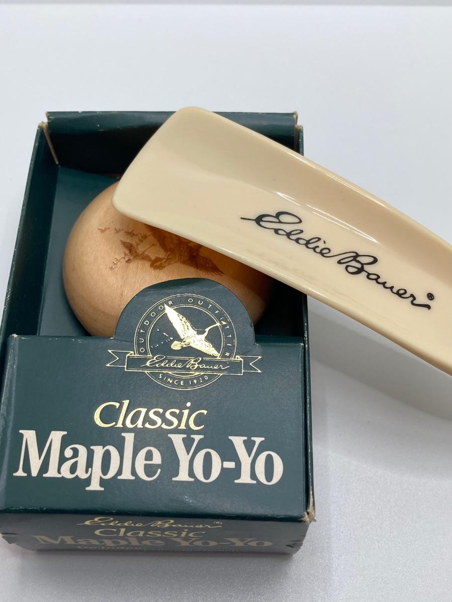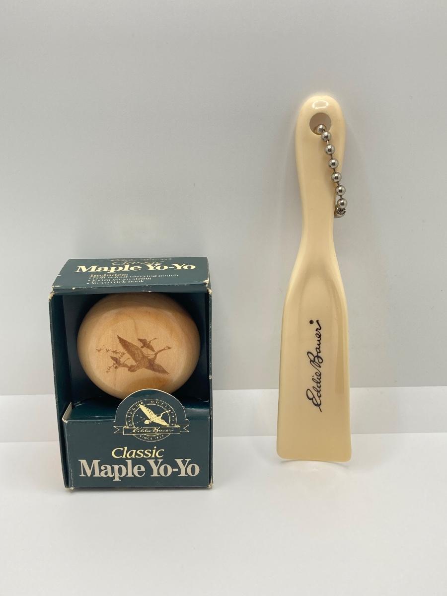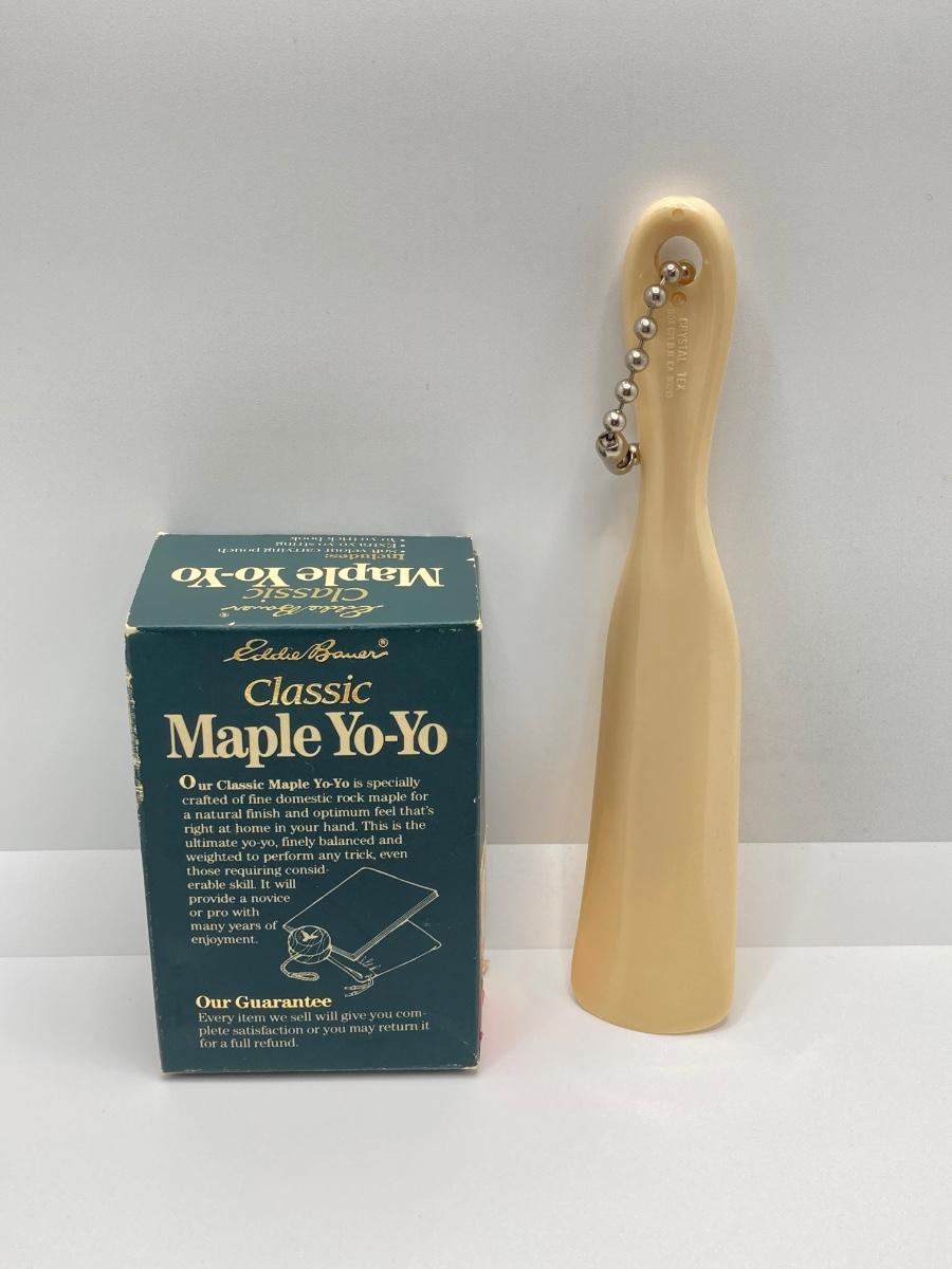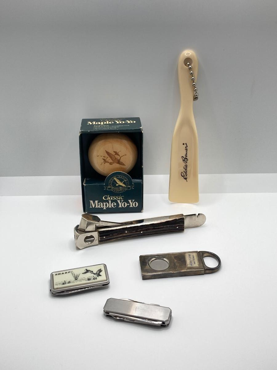 LOT 65: Vintage Solingen German Horn Handle Cigar Cutter, Eddie Bauer Classic Maple Yo-Yo / Shoe Horn, Sharp Folding Pocket Knife and More