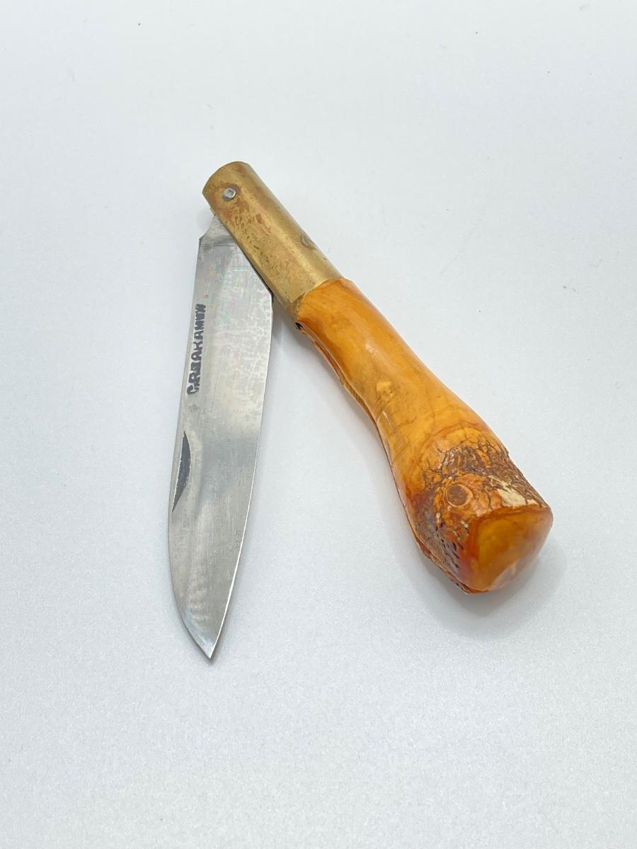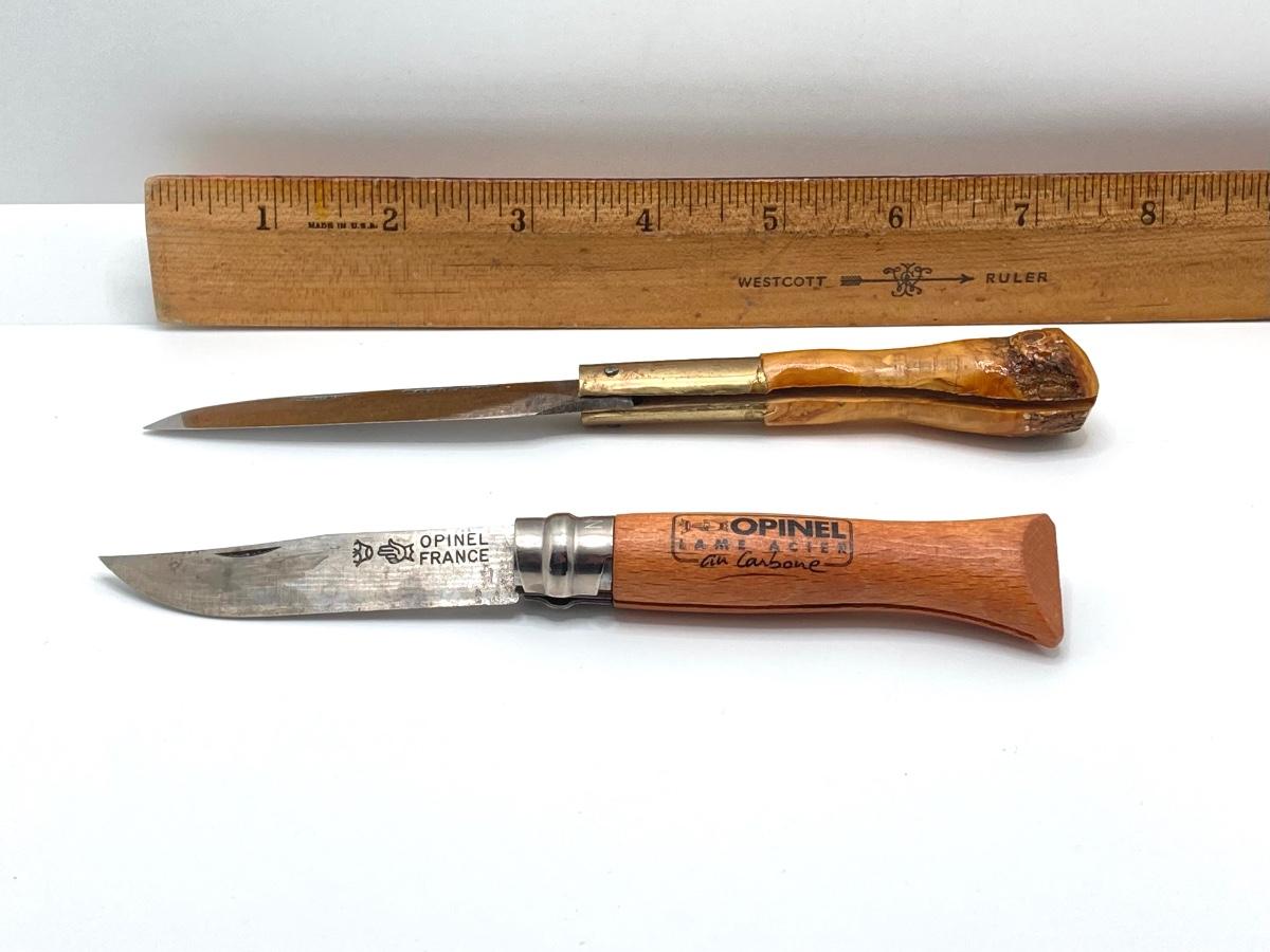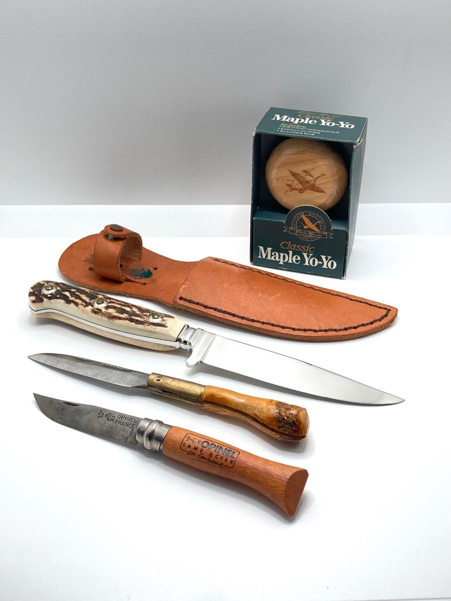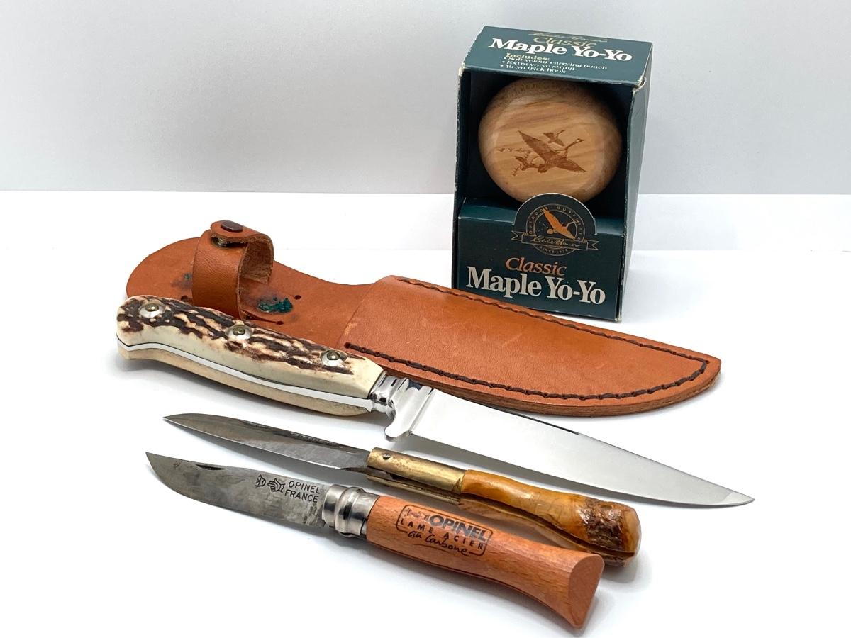 LOT 71: Collection of Knives - Opinel France Folding, Rehwappen Linder-Messer with Leather Sheath, Carved Wood Handle Folding with Eddie Bauer Classic Maple Yo-Yo