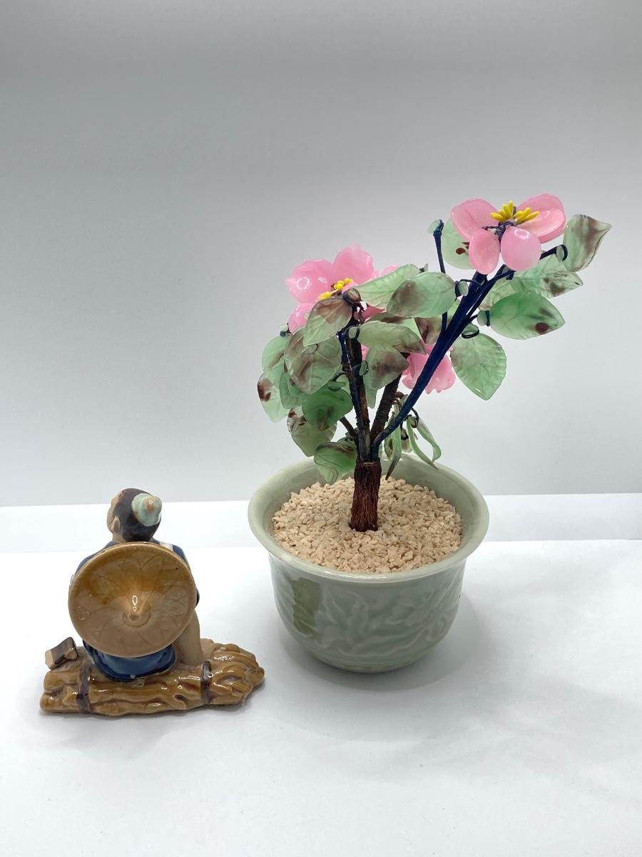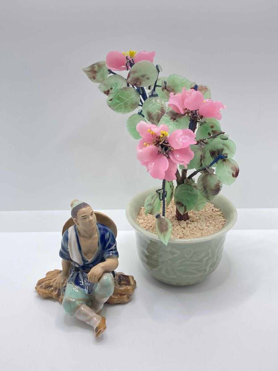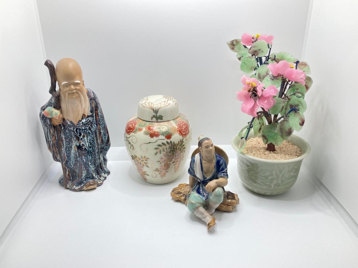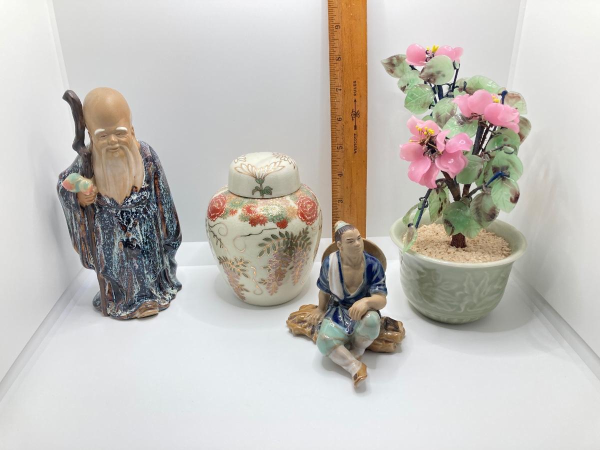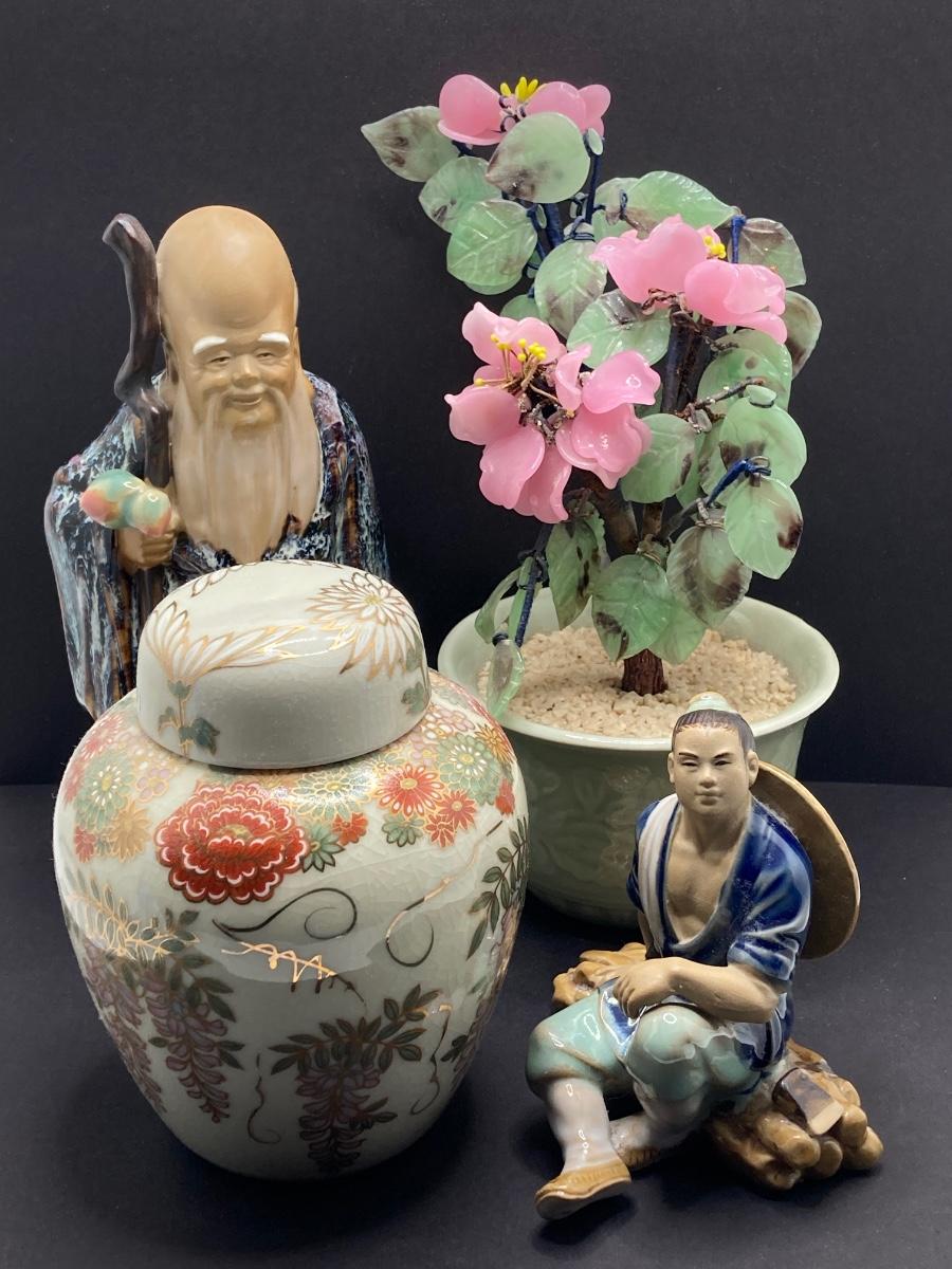 LOT 78: Asian Themed Collection - Jade Glass Bonsai Tree, Ginger Jar, Shou Lao Shouxing (God of Longevity) Figurine and More