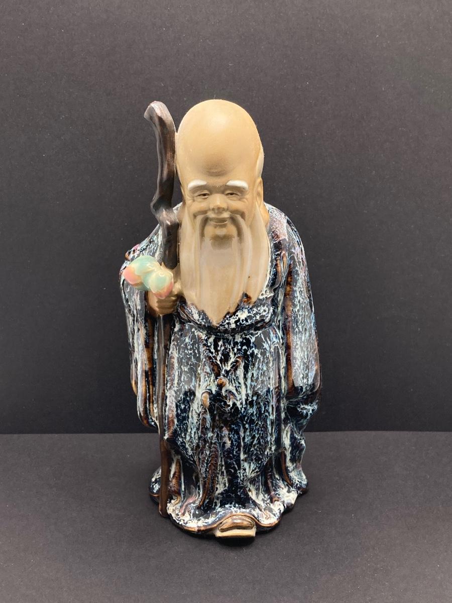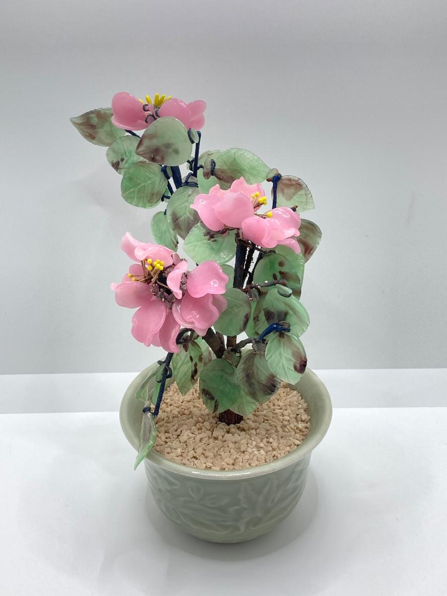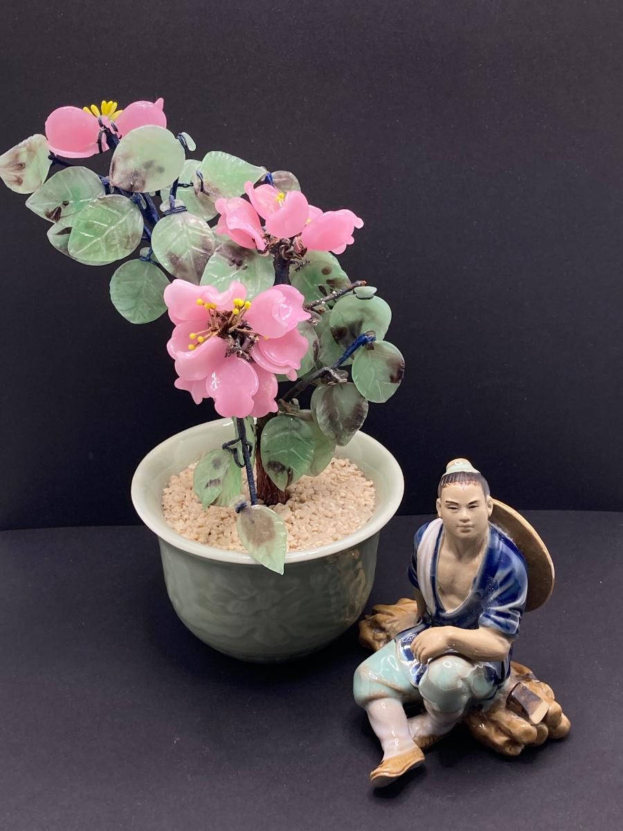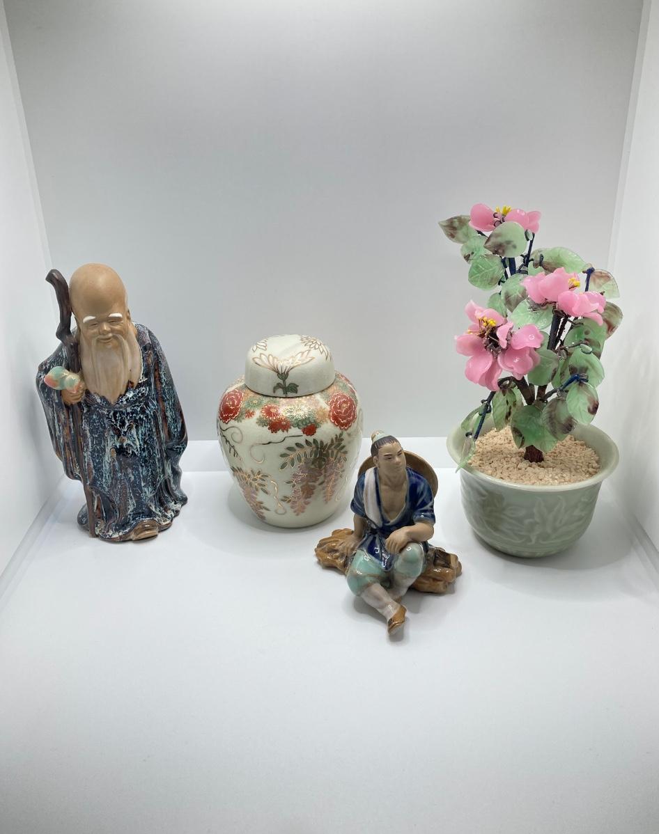 LOT 78: Asian Themed Collection - Jade Glass Bonsai Tree, Ginger Jar, Shou Lao Shouxing (God of Longevity) Figurine and More