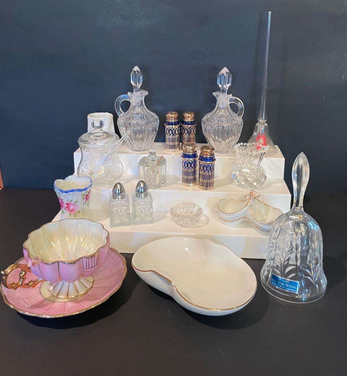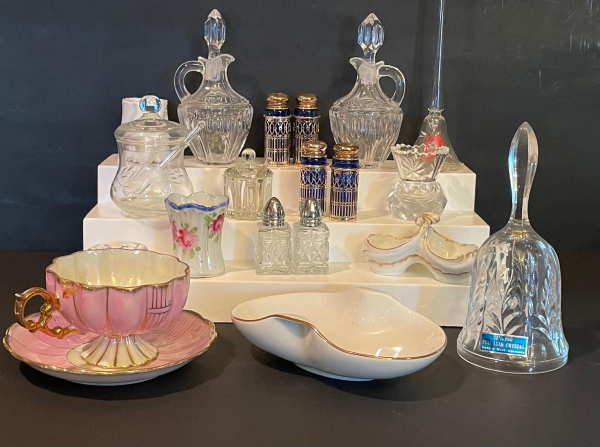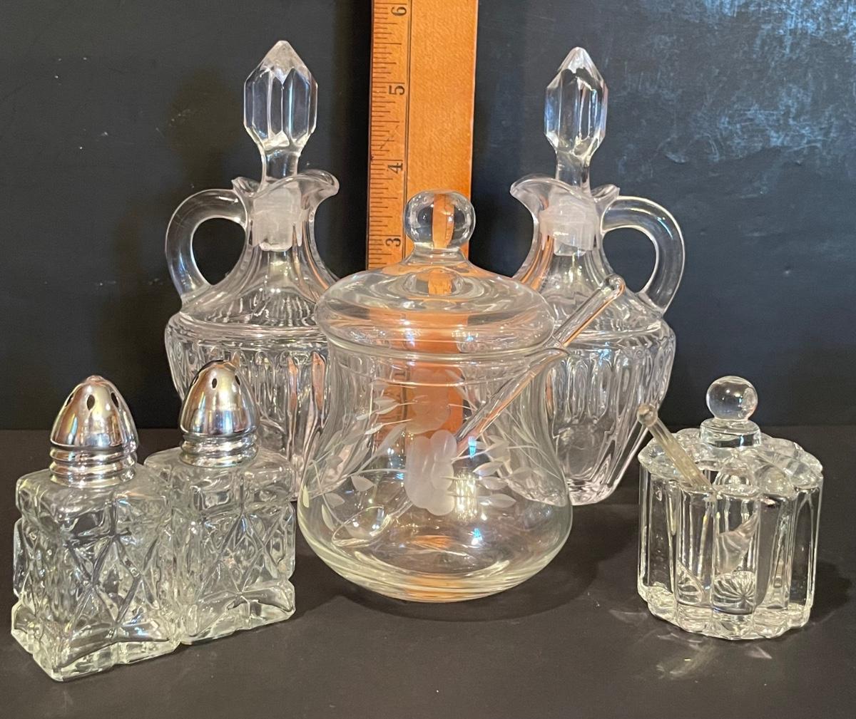 LOT 163: Beautiful Crystal, China & Cut-Glass: Cruet Set, Salt/Pepper Shakers, Toothpick Holders, Vintage Etched Glass & Lead Crystal Dinner Bells & More