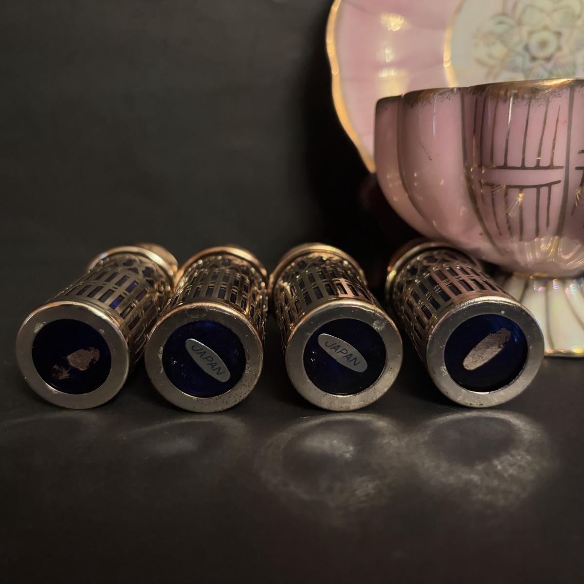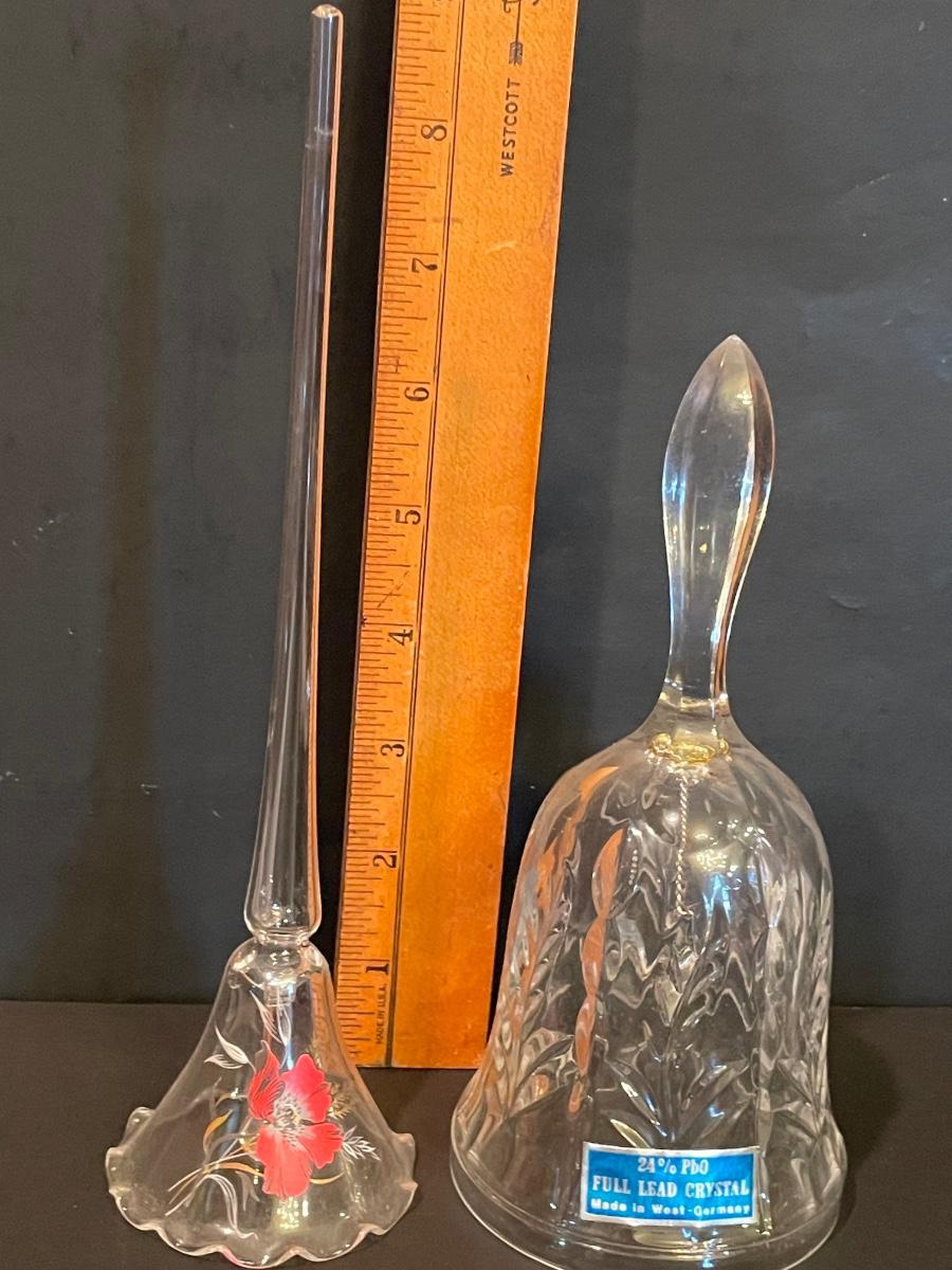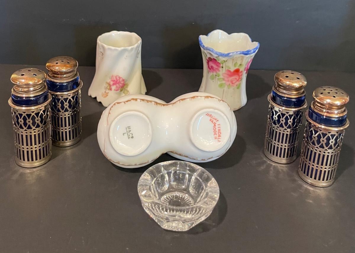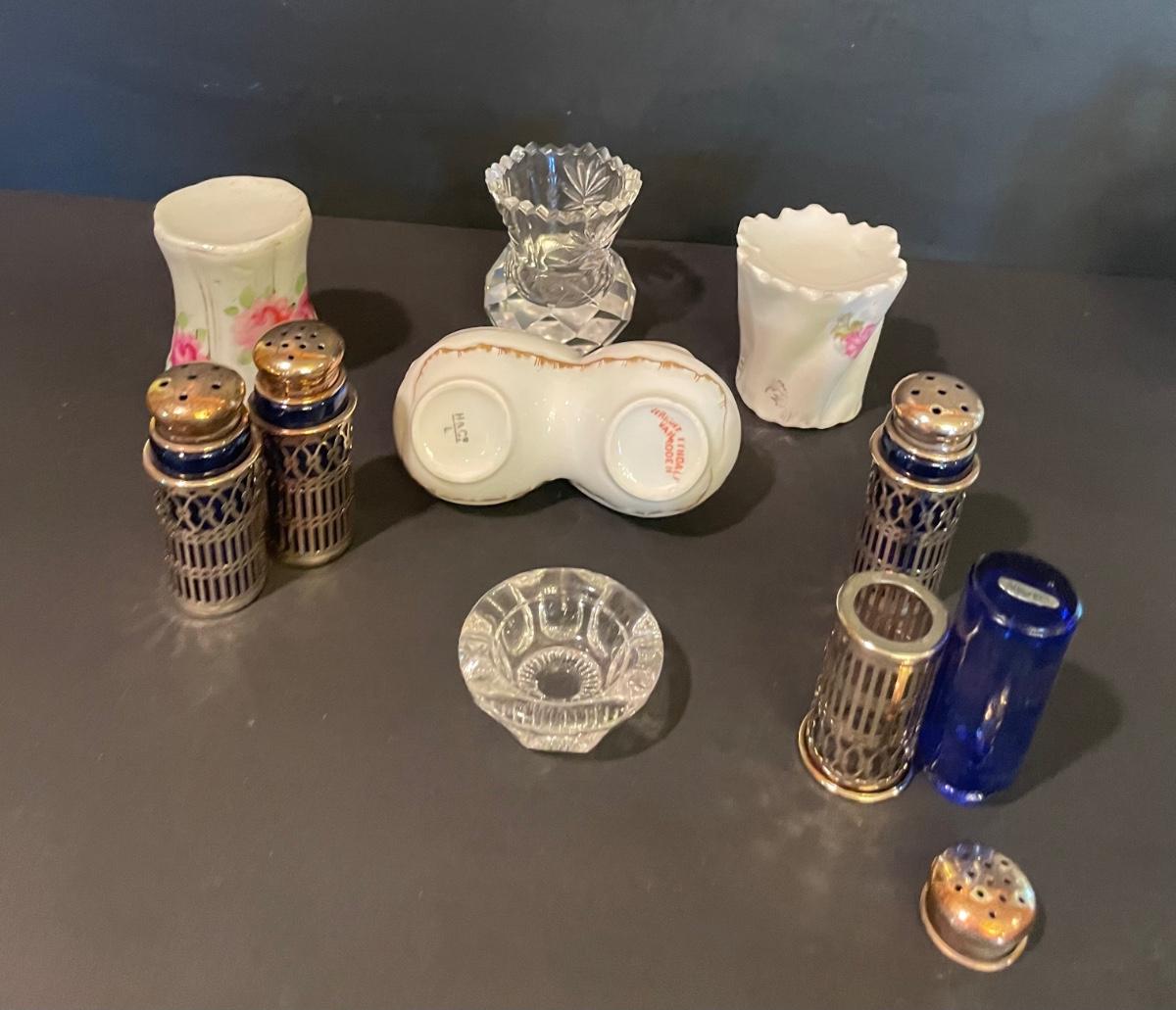 LOT 163: Beautiful Crystal, China & Cut-Glass: Cruet Set, Salt/Pepper Shakers, Toothpick Holders, Vintage Etched Glass & Lead Crystal Dinner Bells & More