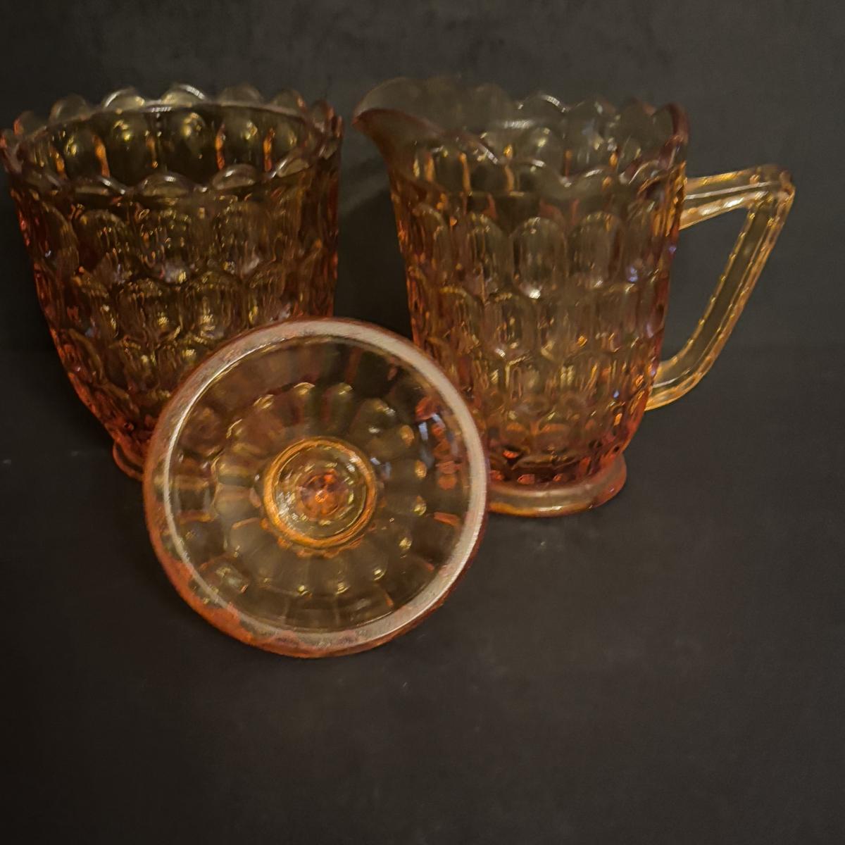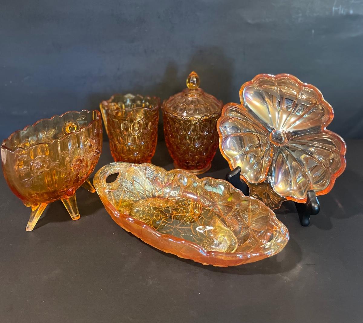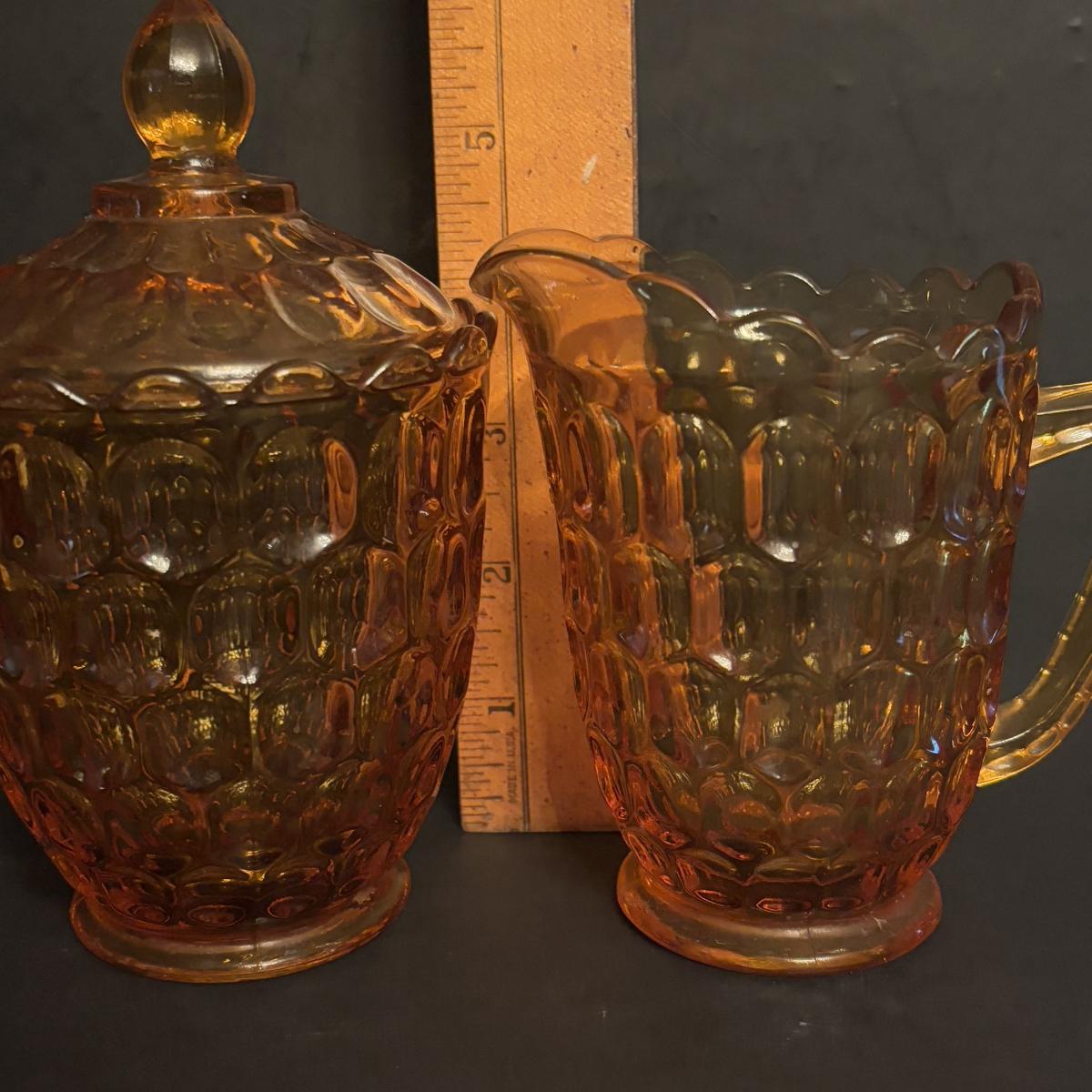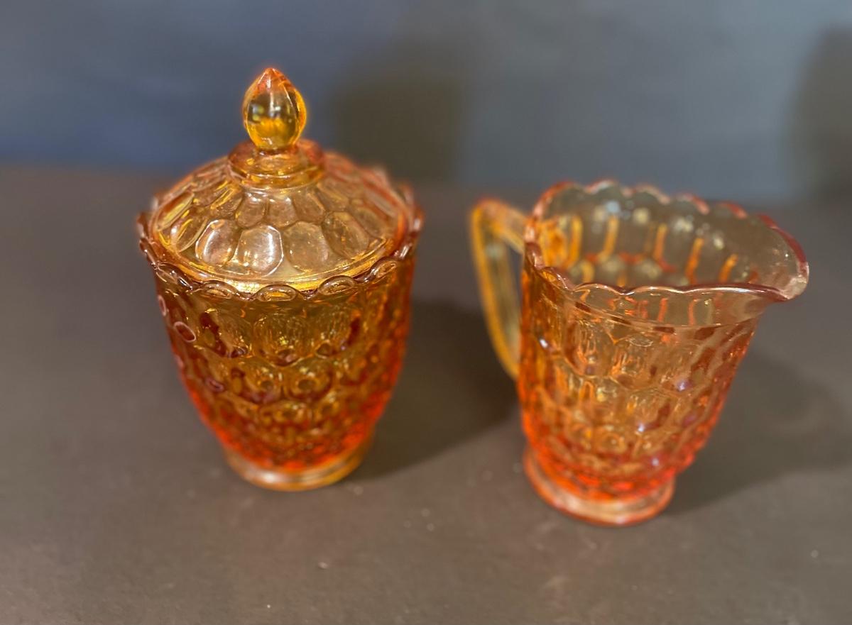 LOT 164: Collection of Vintage Amber & Marigold Glass: Footed Candy Dish, Thumb Print Sugar and Creamer Set Floral Candy Dishes