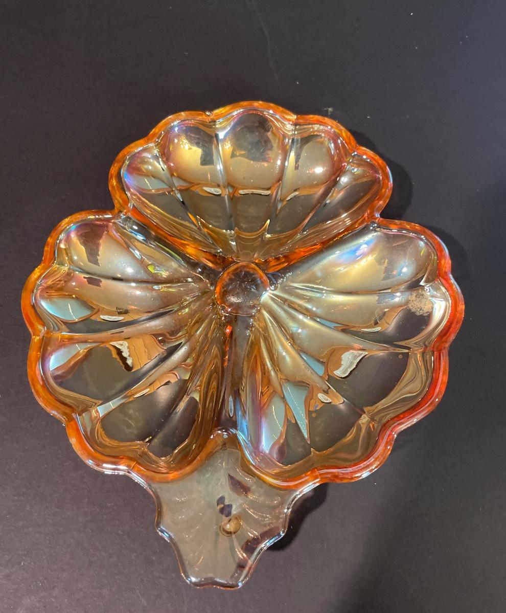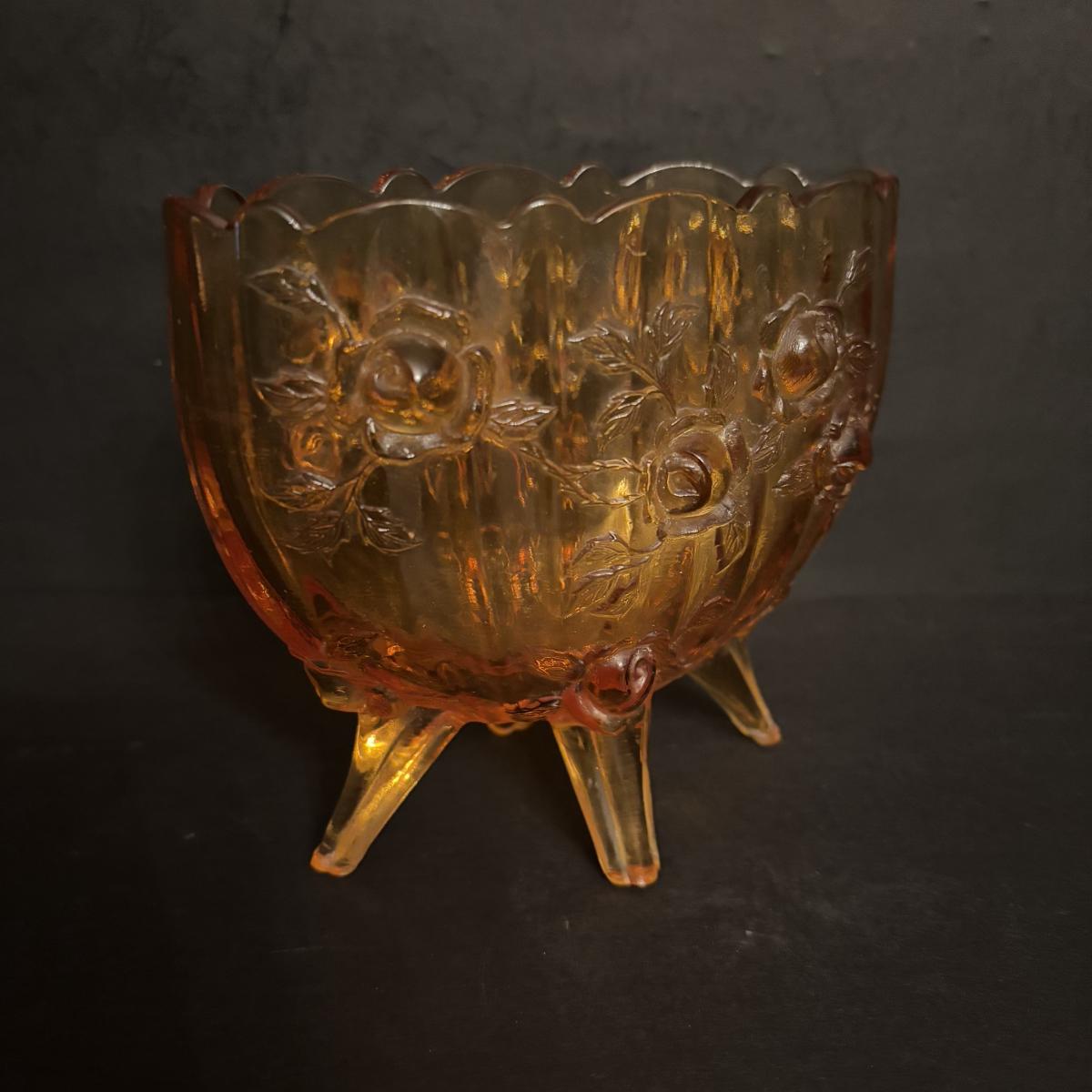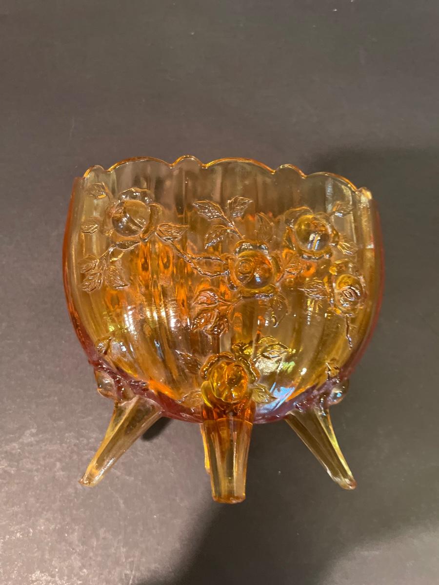 LOT 164: Collection of Vintage Amber & Marigold Glass: Footed Candy Dish, Thumb Print Sugar and Creamer Set Floral Candy Dishes