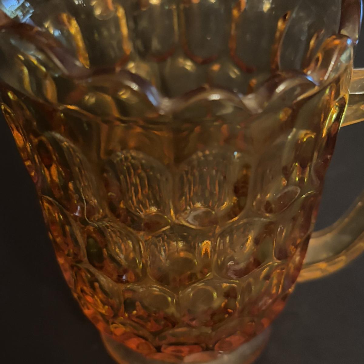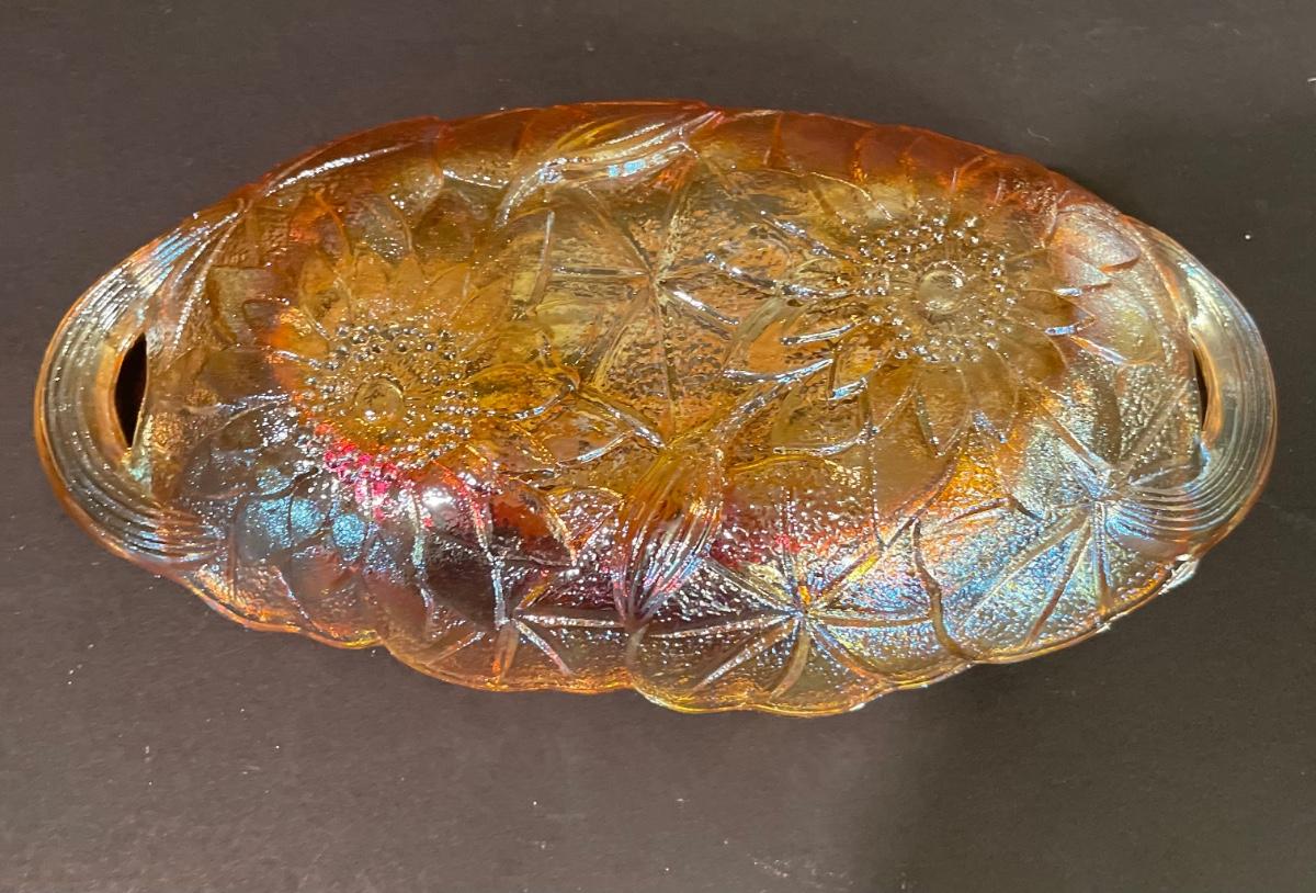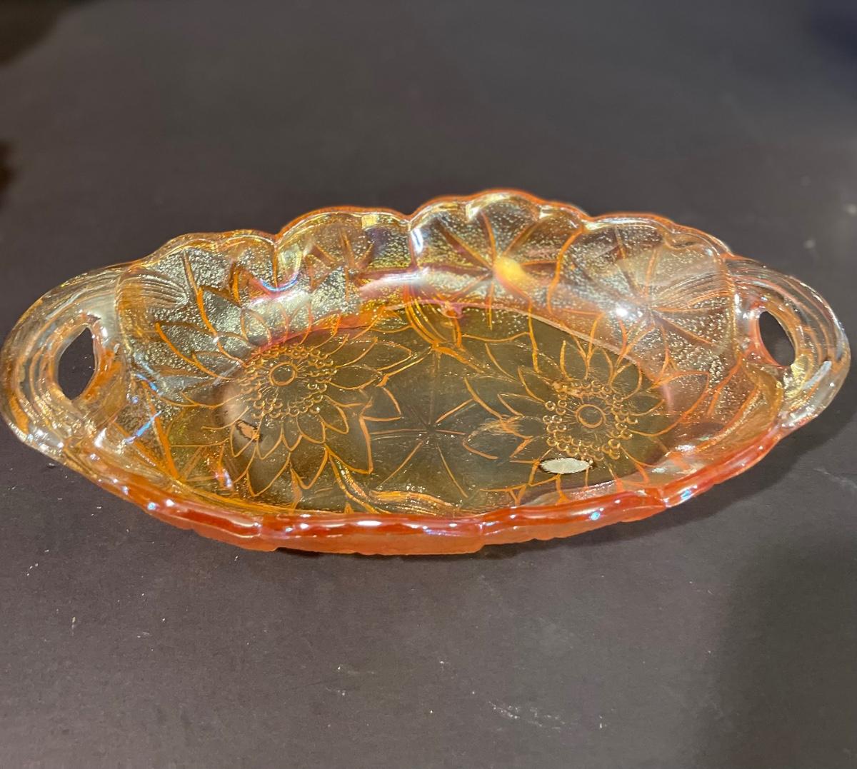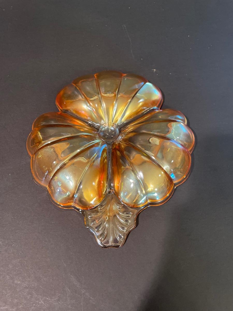 LOT 164: Collection of Vintage Amber & Marigold Glass: Footed Candy Dish, Thumb Print Sugar and Creamer Set Floral Candy Dishes