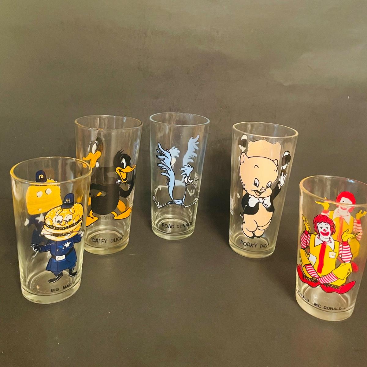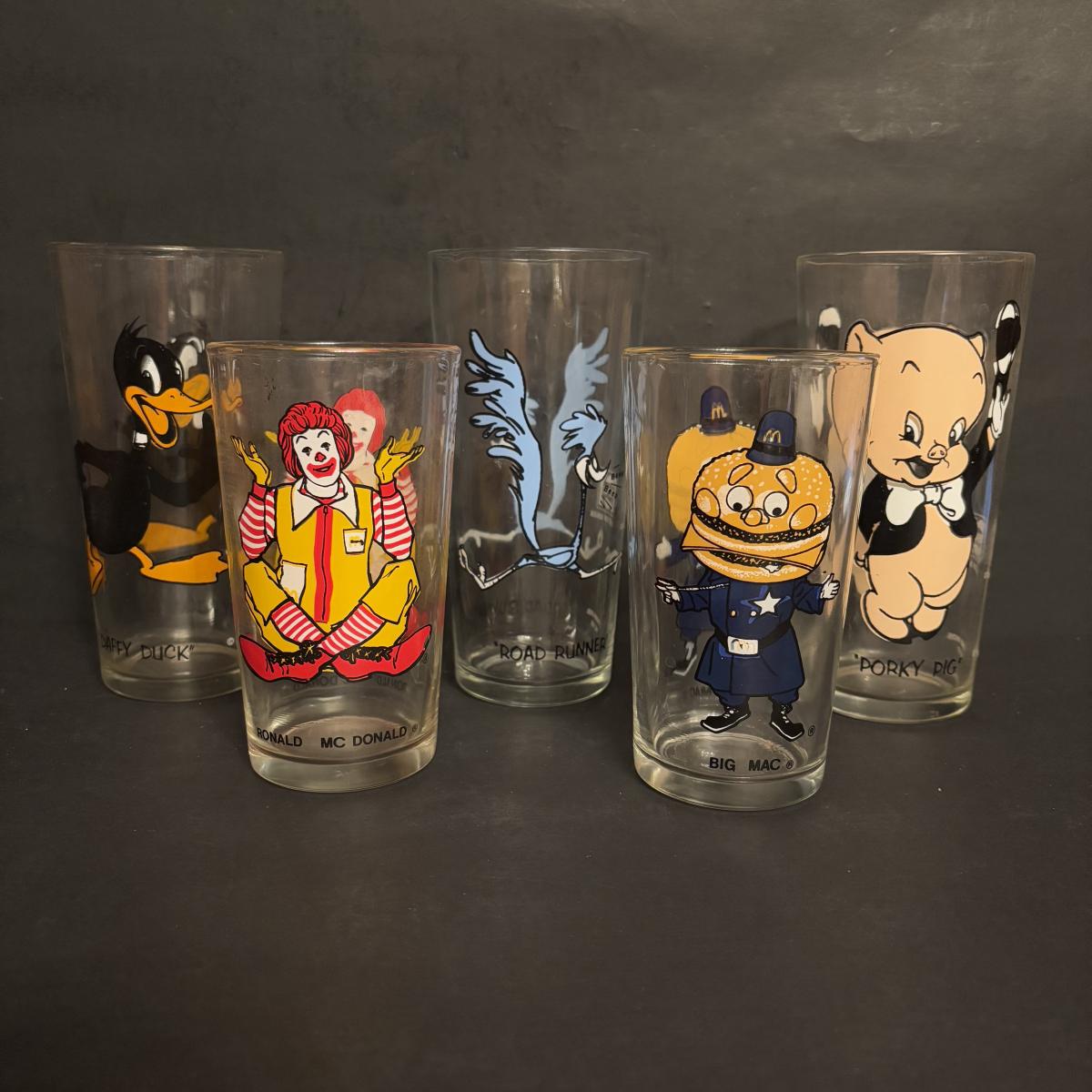 LOT 173: Pepsi Collectors Series Glasses:Porky Pig, Road Runner, Daffy Duck and Vintage Ronald McDonald & Big Mac Collectors Series Glasses