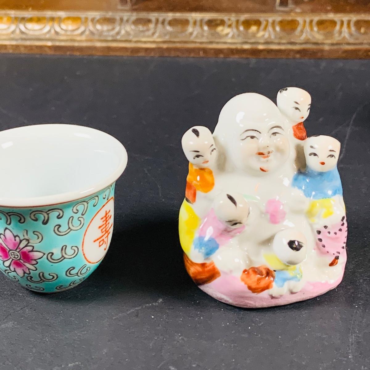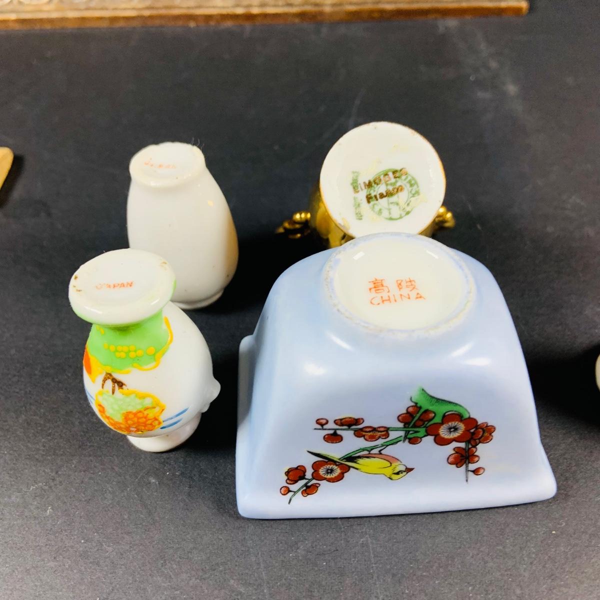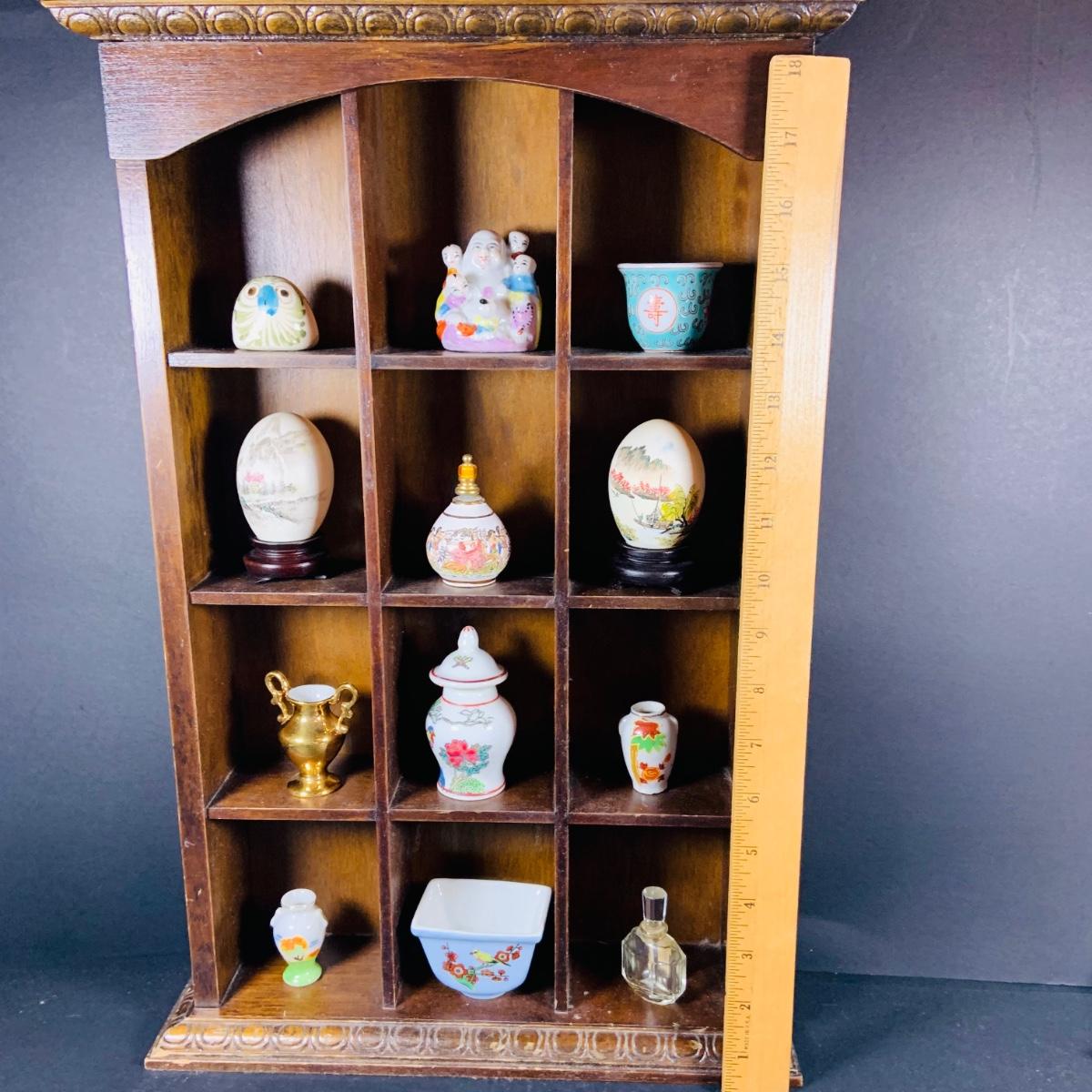 LOT:191: Wooden Display Case w/Asian Inspired Miniature Vases & Bottles and Painted Egg Shells and More