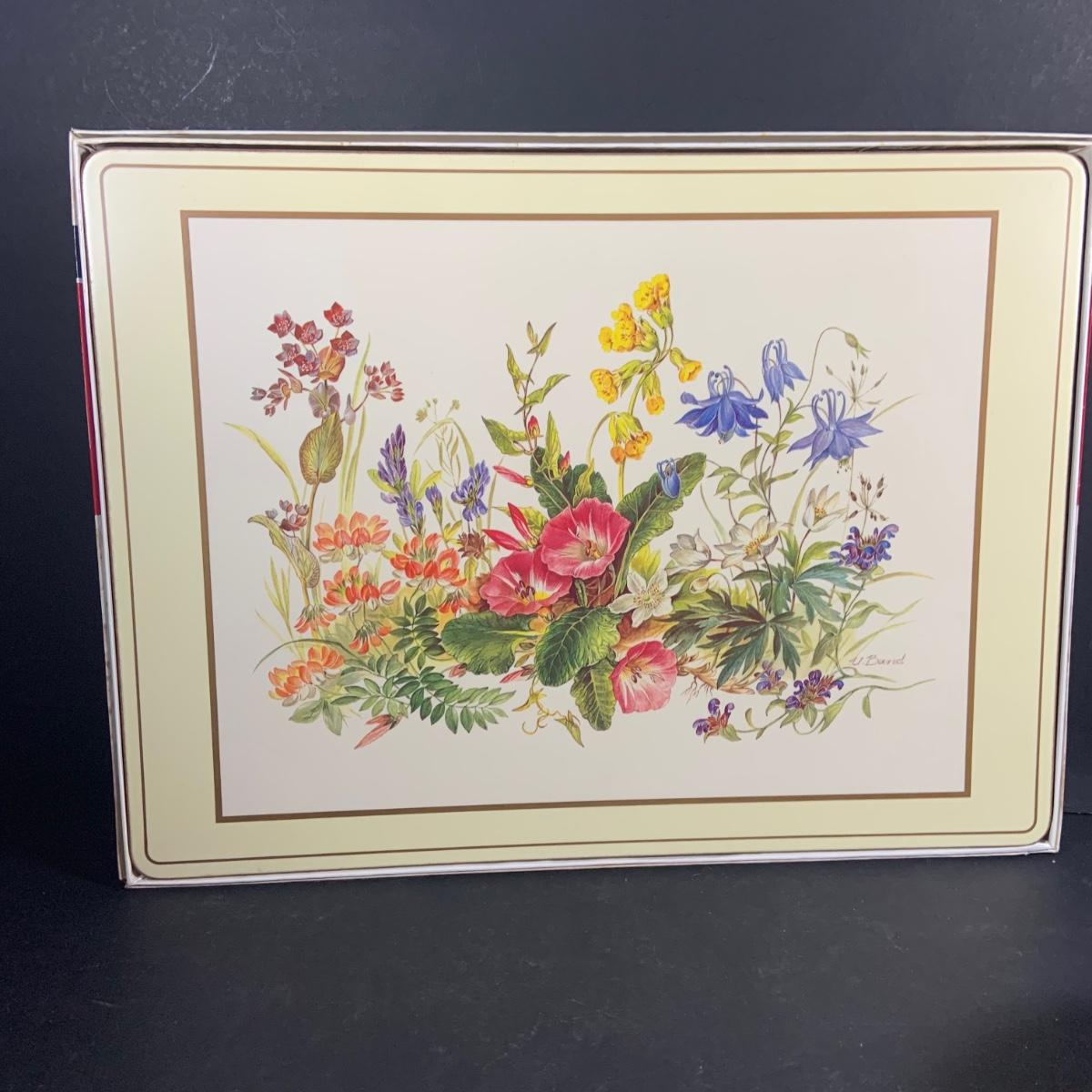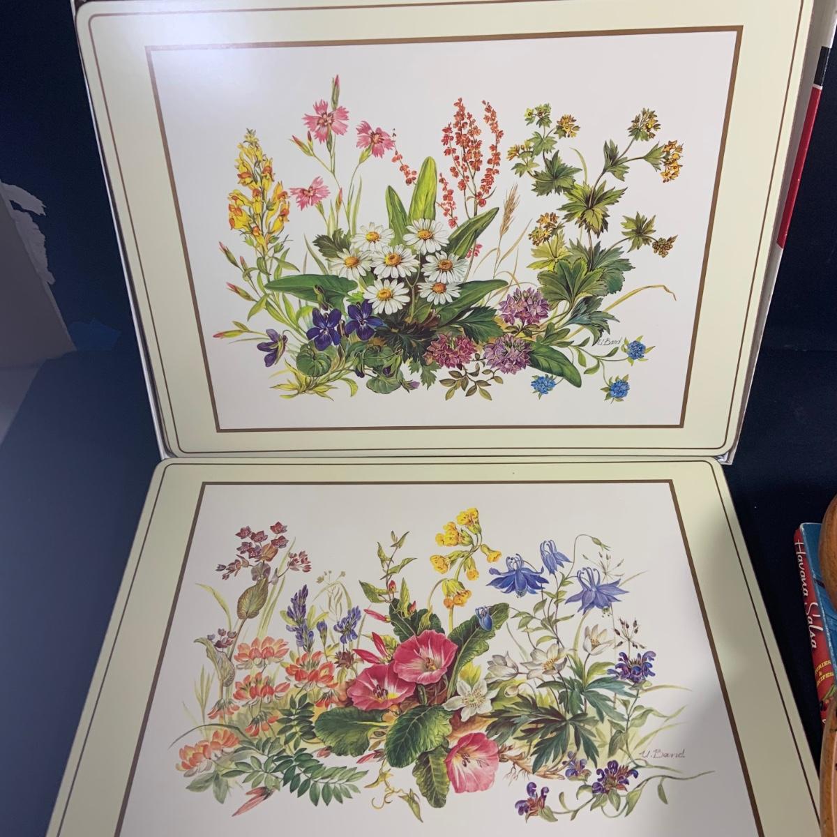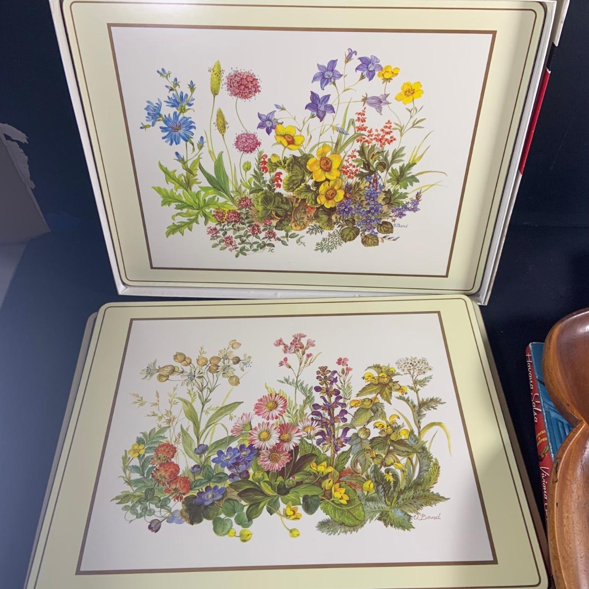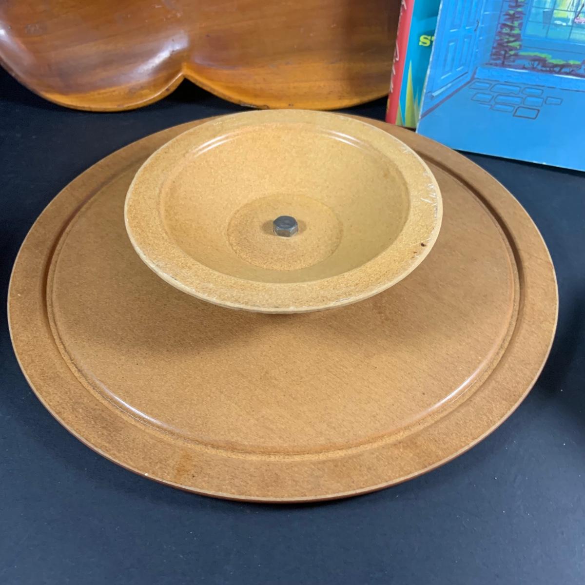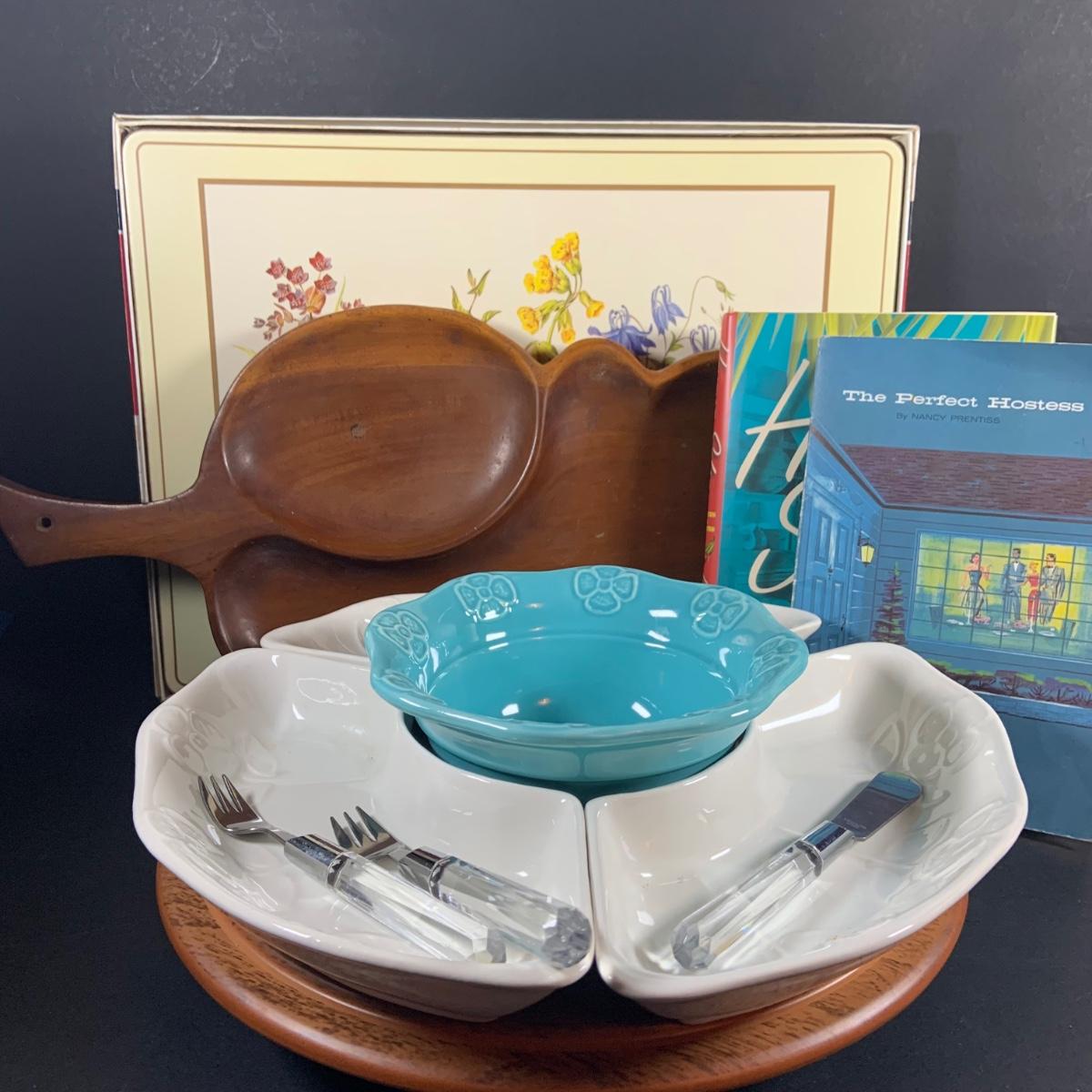 LOT:206: Vintage Entertaining Must Haves Including a Ceramic and Wood Lazy Susan Serving Dishes, Wooden Leaf Shaped Serving Dish, Pimpernel Placemats In Box