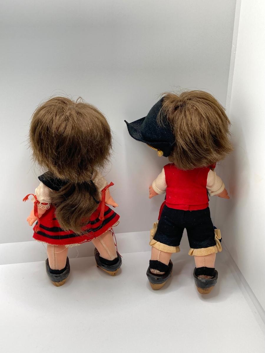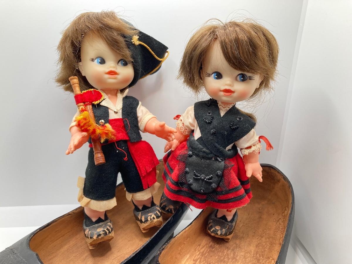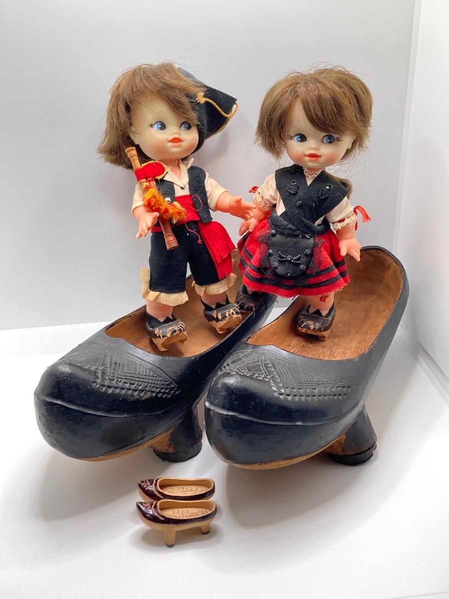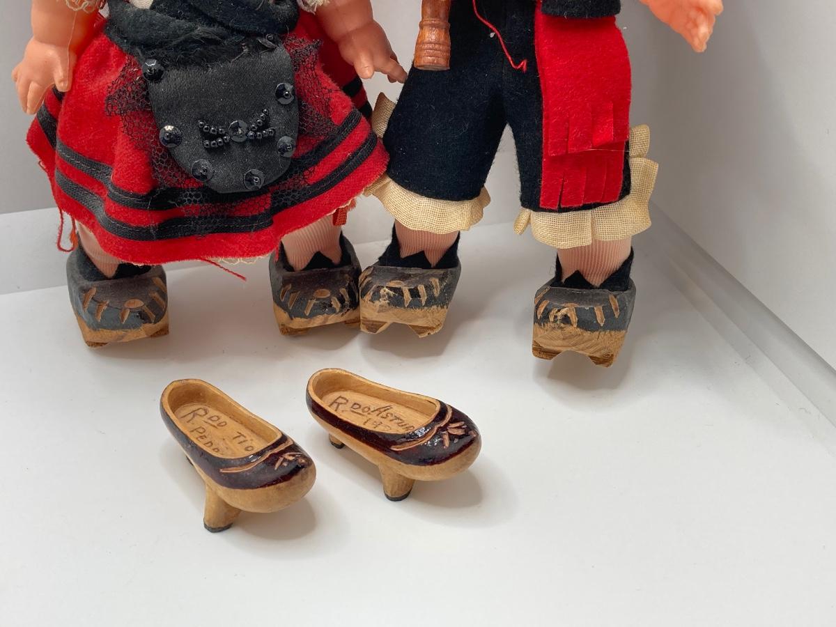 LOT 244: Vintage Wooden Shoe Folk Art Collection - Two Pair of Hand Crafted and Adorable Spanish Dolls