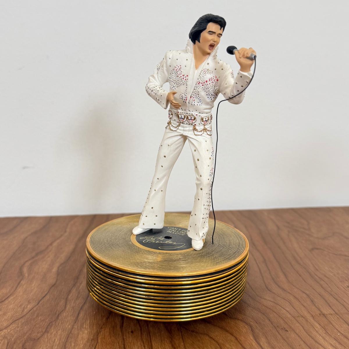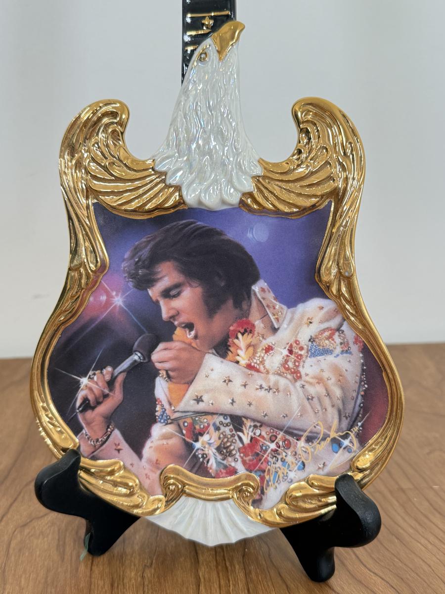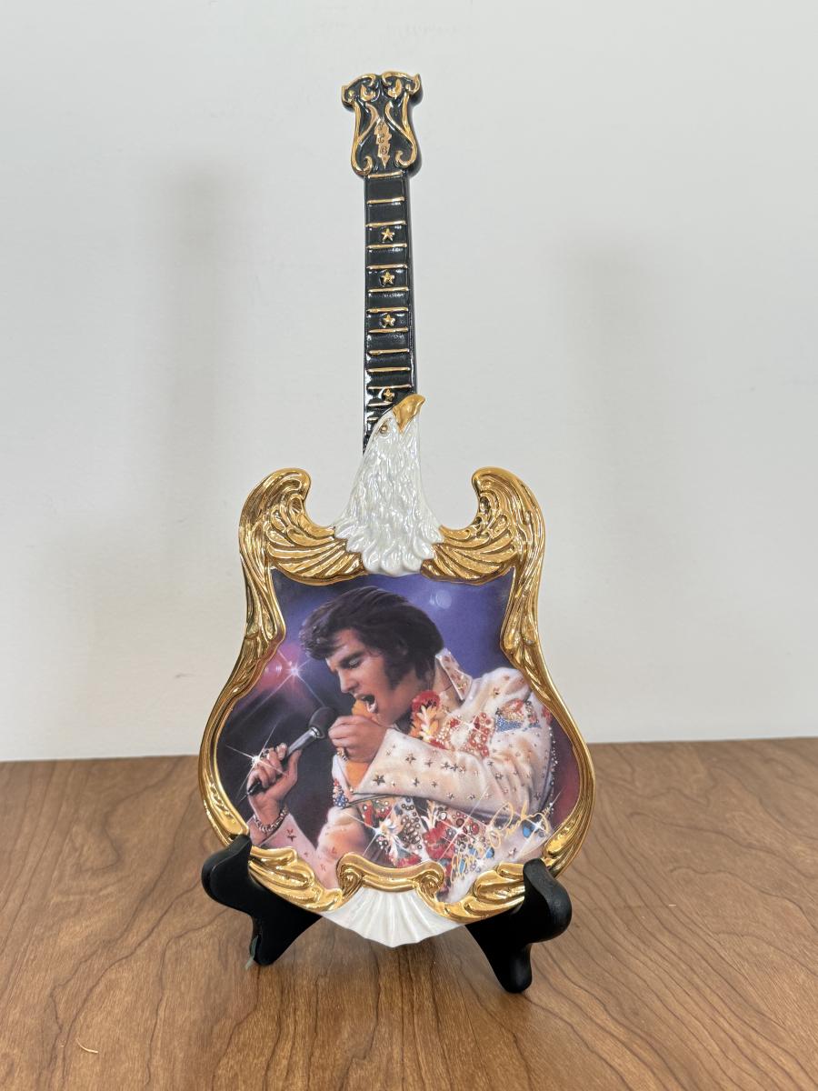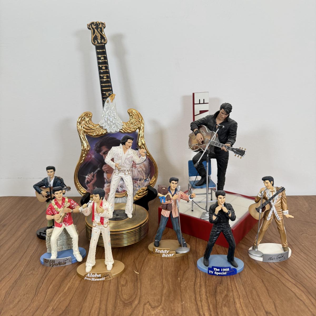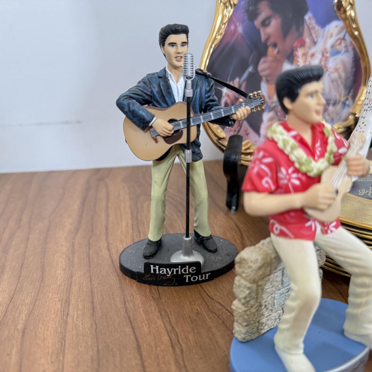 LOT 19A: Elvis Presley Collectibles - Bradford Exchange Aloha from Hawaii Guitar Plate, Ardleigh Elliott Music Box, McFarlan Toys '68 Comeback Special Action Figure & Ornaments