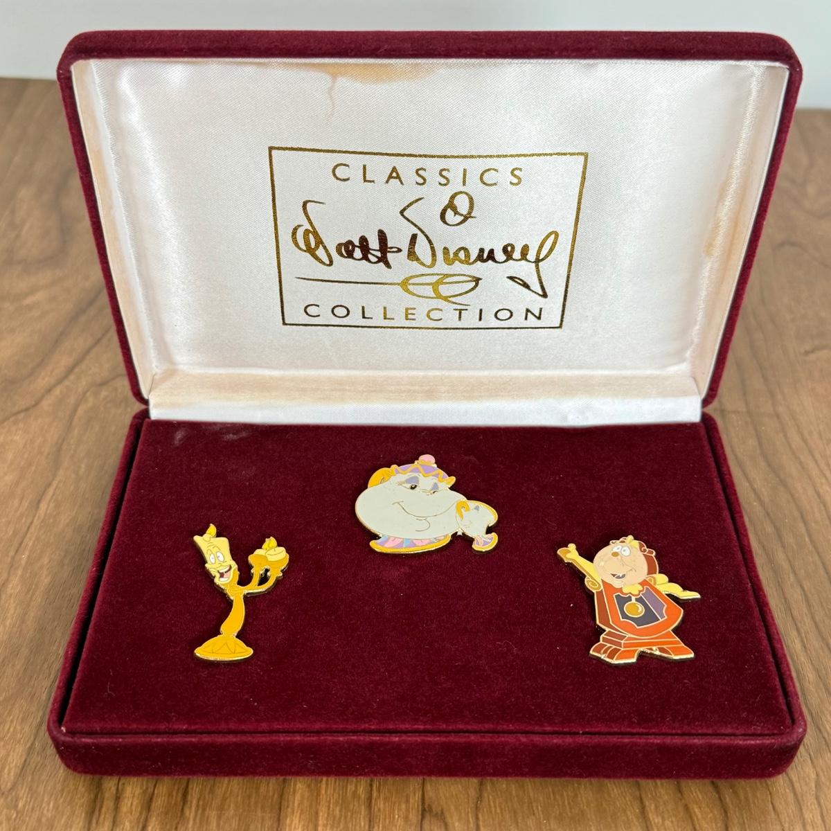 LOT 51A: Walt Disney Classics Collection Beauty and the Beast Pin Set in Case & Limited Edition Mickey Merry Christmas Pin and Ornament Set