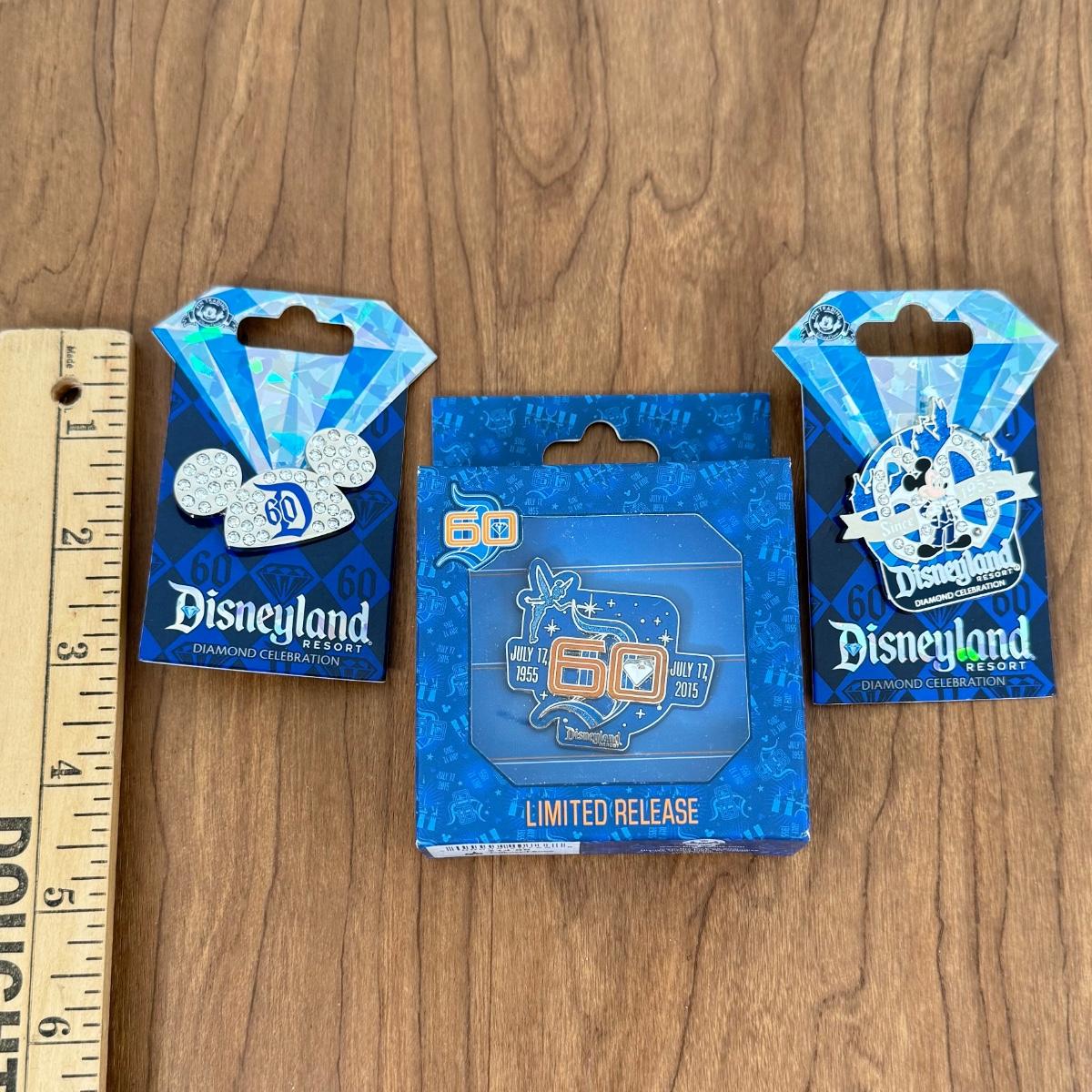 LOT 52A: Disneyland 60th Anniversary Trading Pins - Limited Release in Box, Ear Hat & Mickey