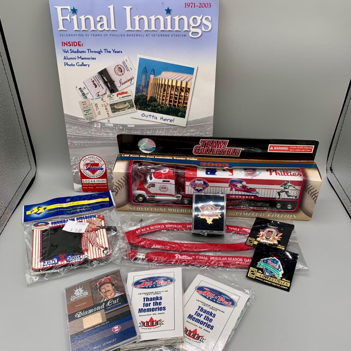 LOT 211 B: Philadelphia Phillies Veterans Stadium Collection: Limited Edition Magazine, Trading Cards, Pins, Die-Cast Tractor Trailer, & More