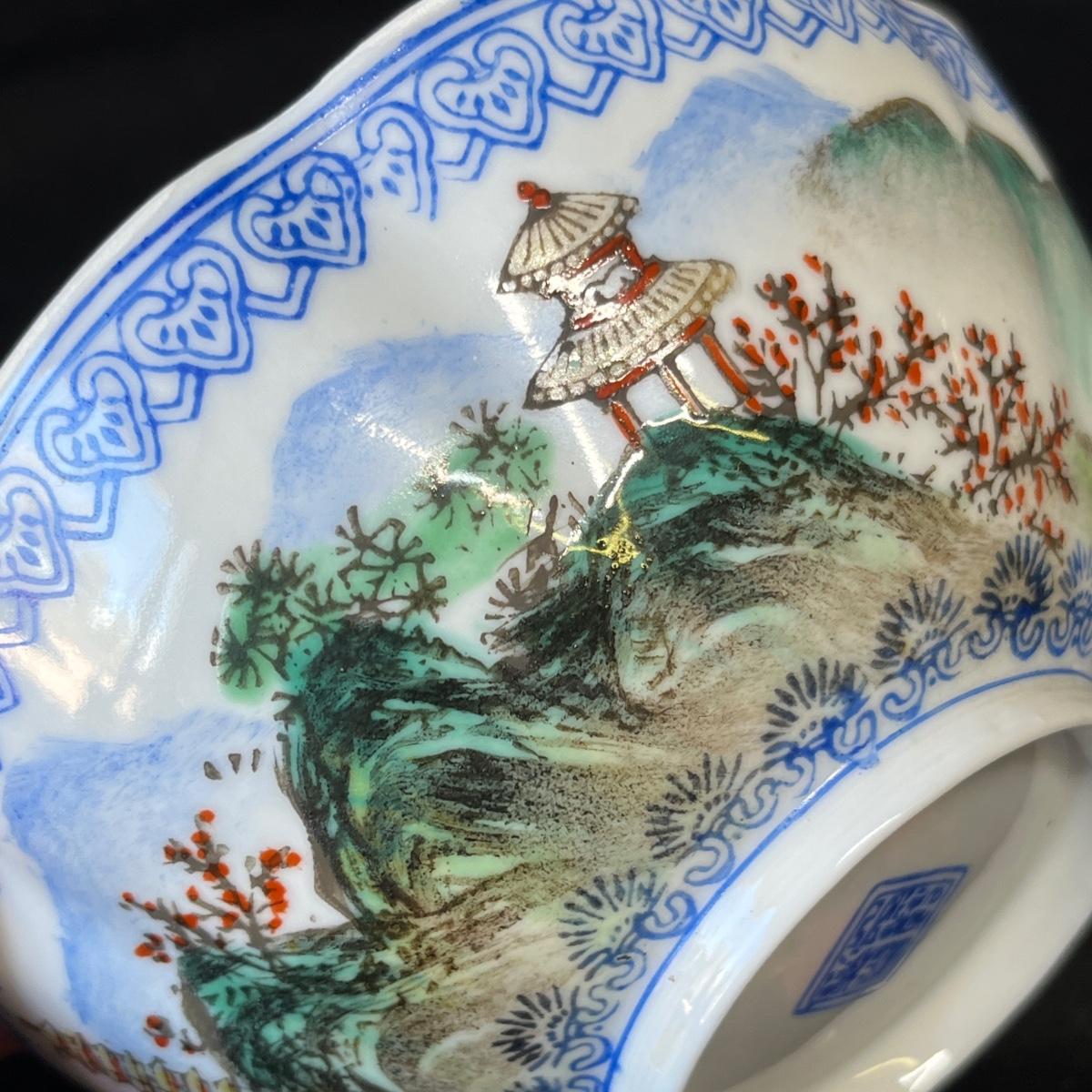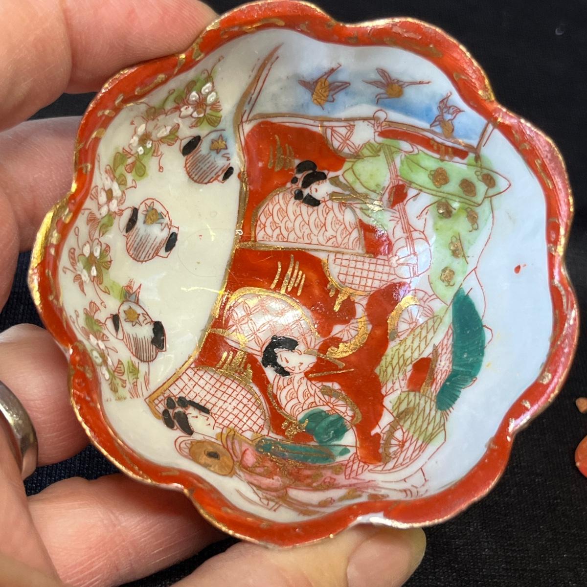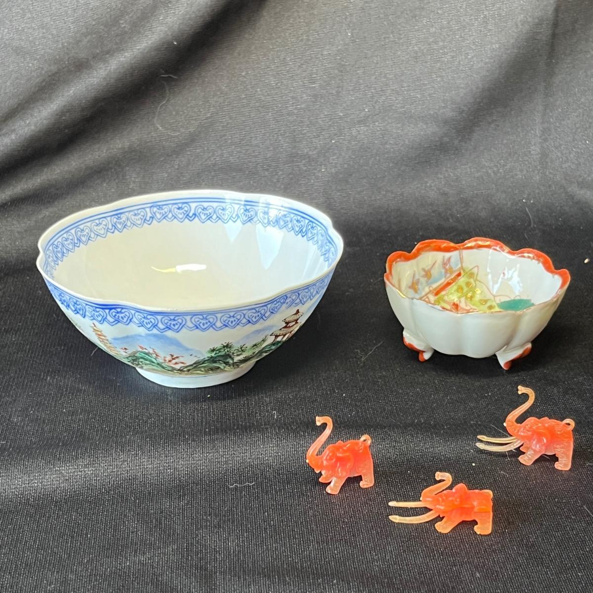 Two bowls and elephant figures. The blue & white bowl is paper thin! No damage.