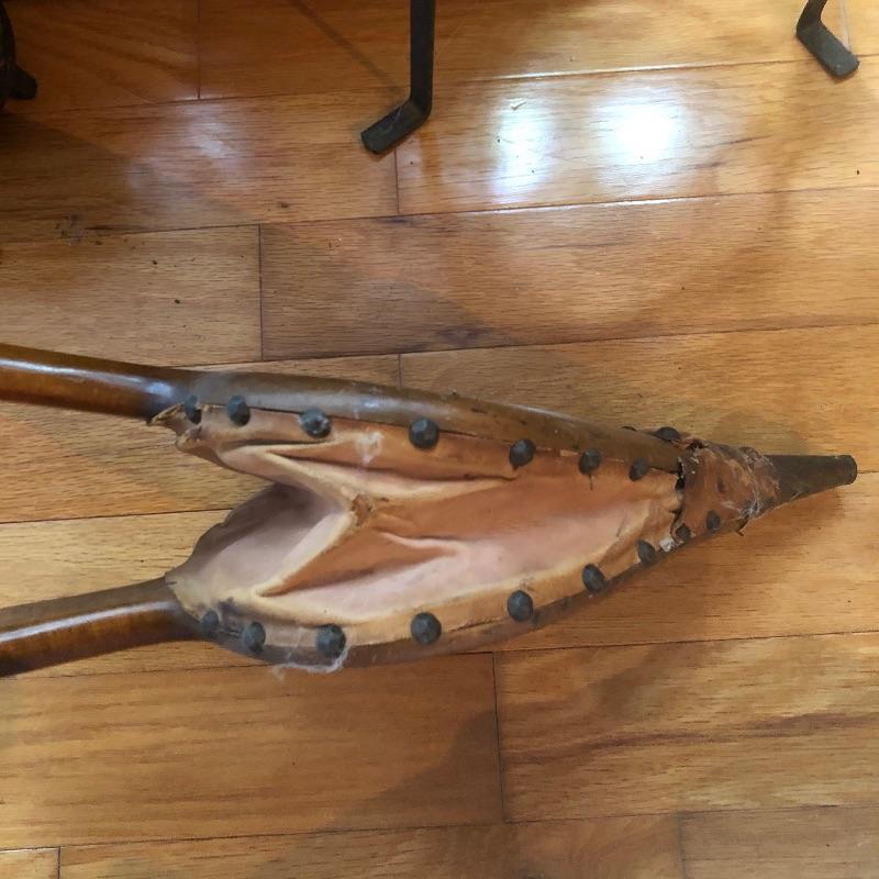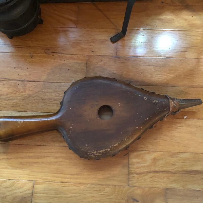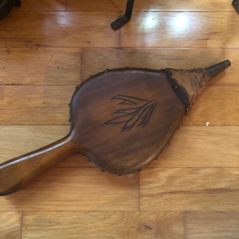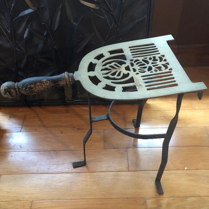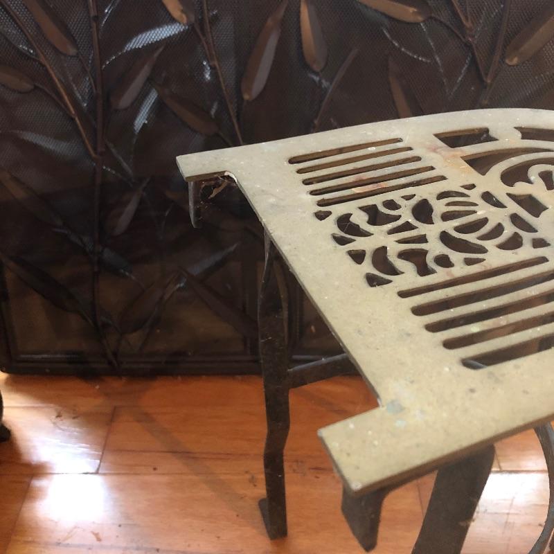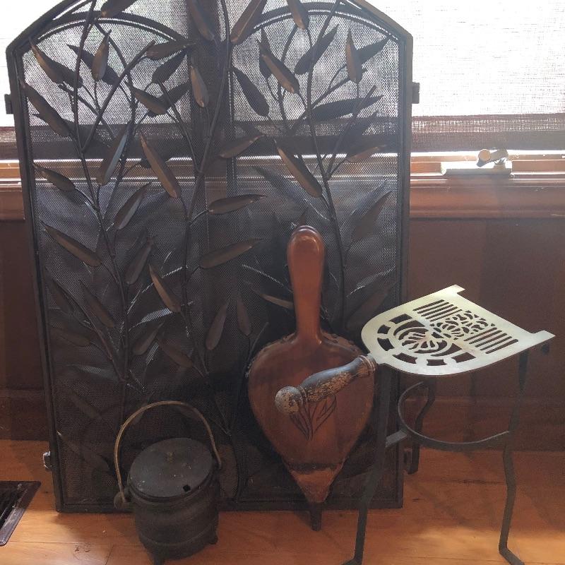 This lot has everything you could need to help keep your fireplace in good shape! Included in this lot is a wooden fire bellows, a detailed metal folding screen, a small metal fire starter holder, and a metal iron stand. All pieces are in decent condition. The metal screen measures about 44” x 33”. Local pick up only.