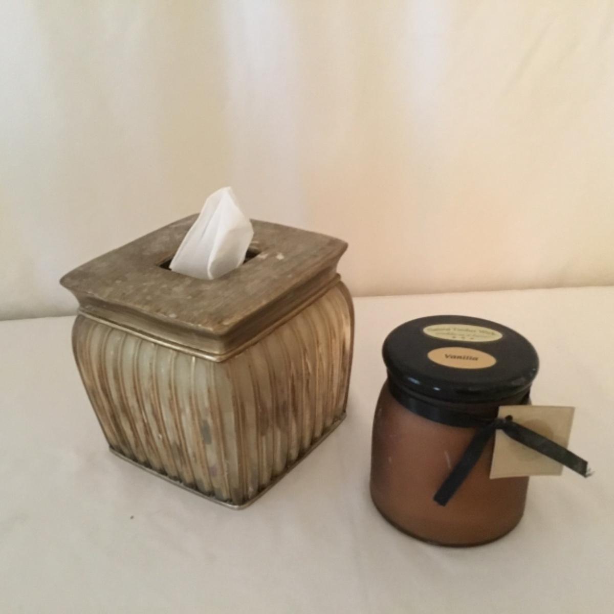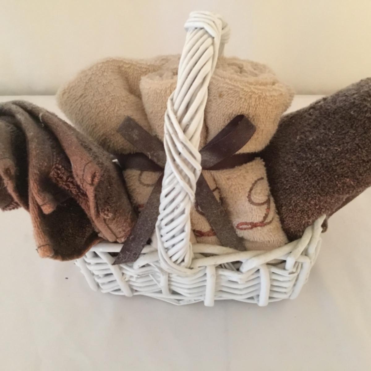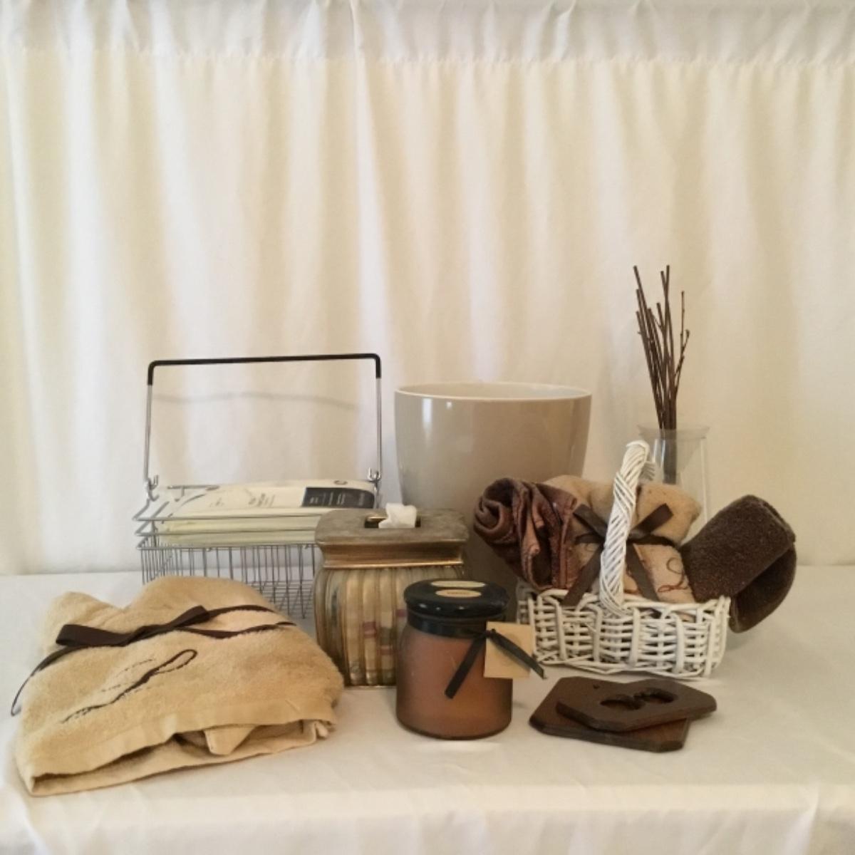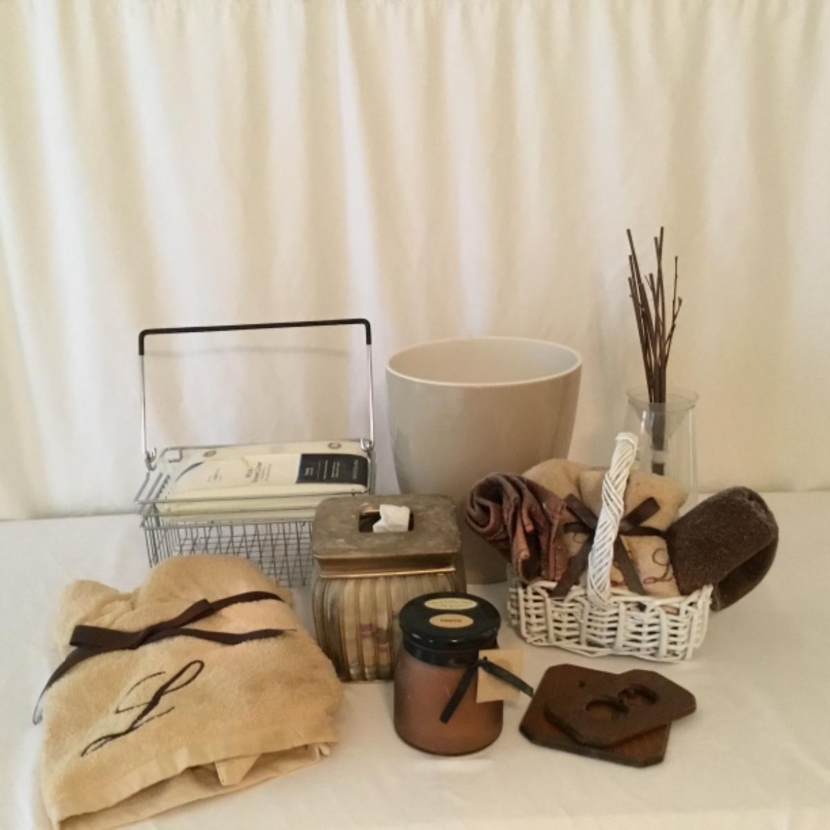 Lot includes bathroom essentials. Notice a waste bin measuring 9” across and 10” tall. Lot also includes wire caddy, tissue box cover, and a clear shower curtain. Metal wall art measures 6”x23”. Included in this lot is a vanilla candle, wooden light switch covers, embroidered towels and more! See photos for details.