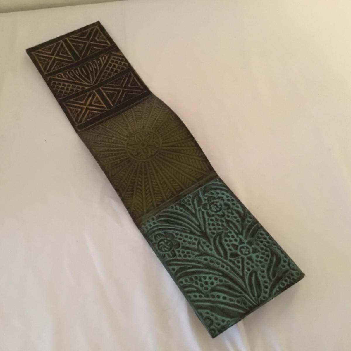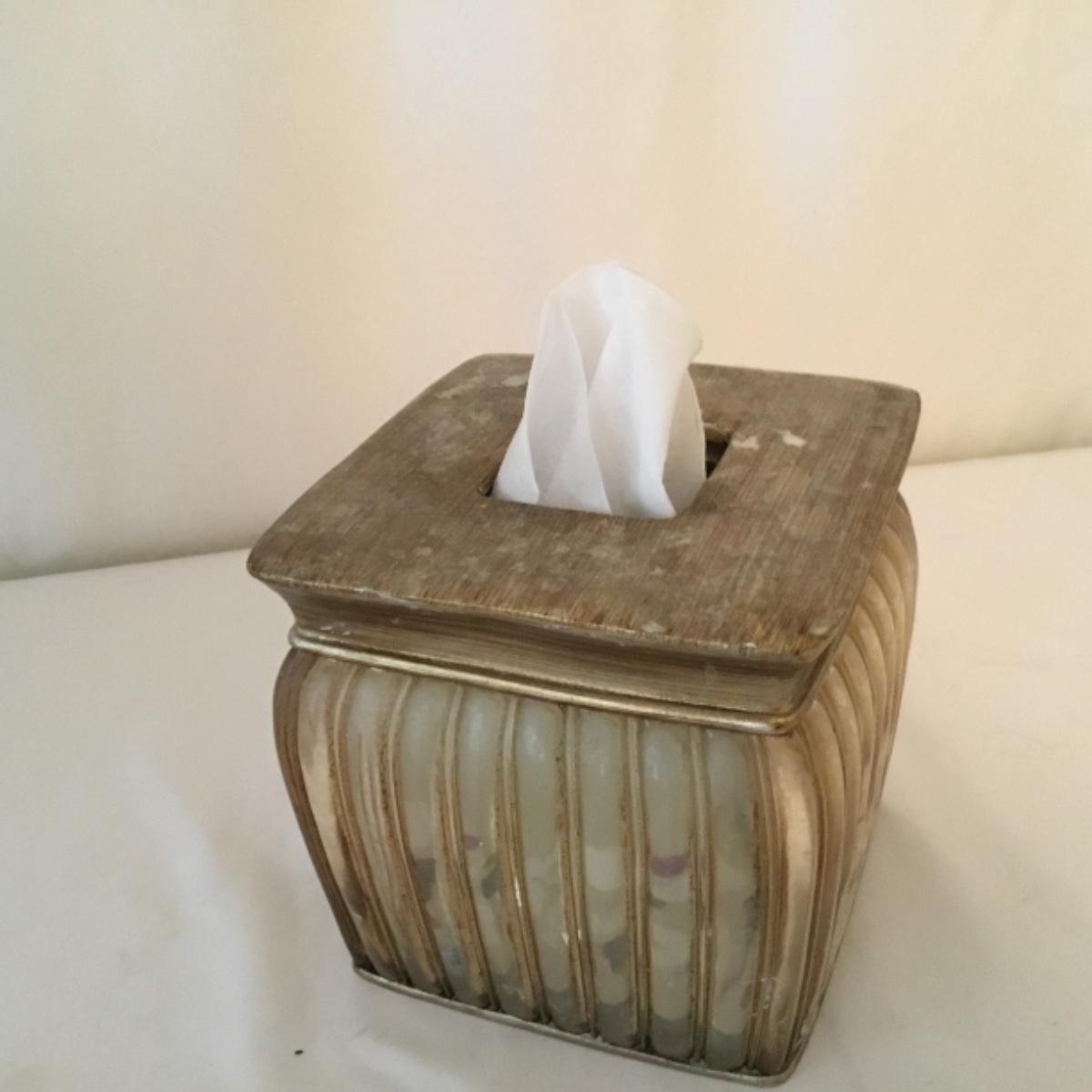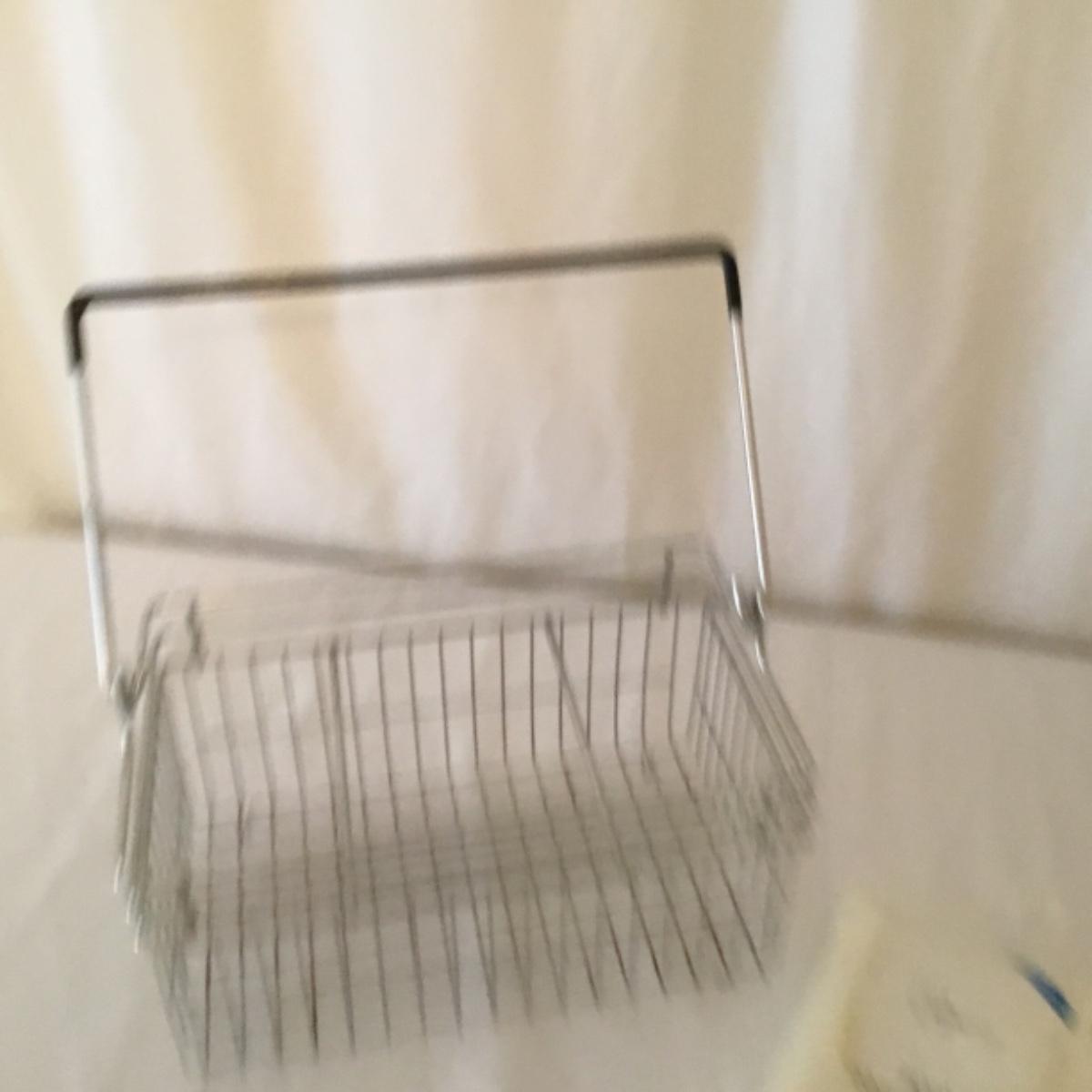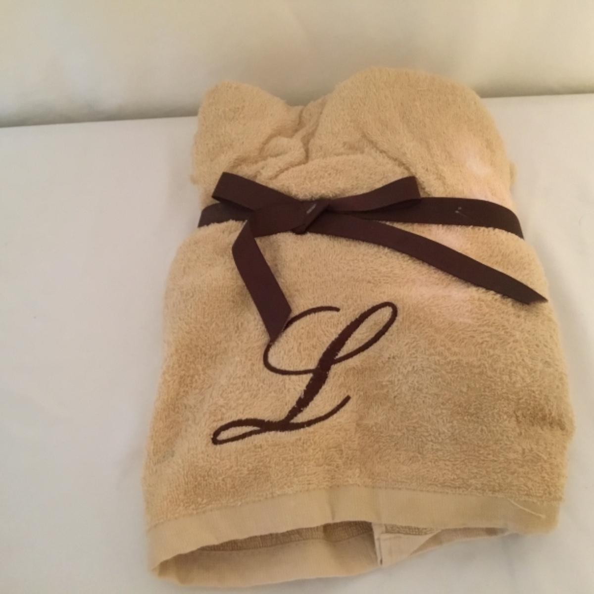 Lot includes bathroom essentials. Notice a waste bin measuring 9” across and 10” tall. Lot also includes wire caddy, tissue box cover, and a clear shower curtain. Metal wall art measures 6”x23”. Included in this lot is a vanilla candle, wooden light switch covers, embroidered towels and more! See photos for details.