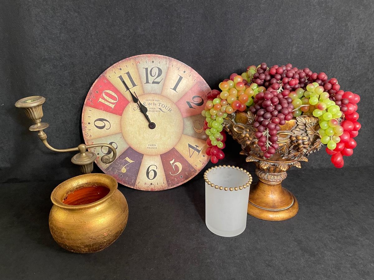 Wall clock, plastic fruit arrangement, ceramic pot and glass candle votive holder