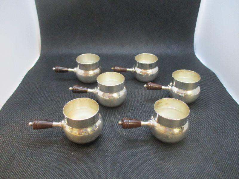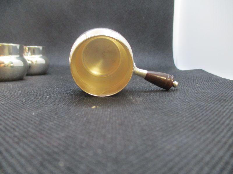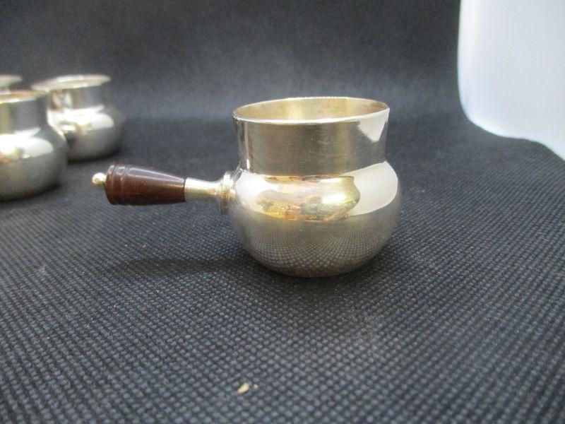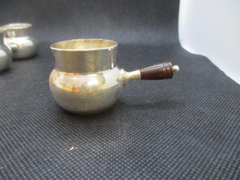 These are small individual "pots" that you place brandy is before warming it. The mark on the bottom is the Prince of Wales feathers hallmark, but I couldn't find out anything else about it. There are no other marks to indicate if it is silverplate or silver (and I've seen similar pieces with similar hallmarks listed as both) which is why I'm listing it as silverplate. The handle is bakelite. Each is about 3" long including the handle and the bowl is about 1.5" in diameter.