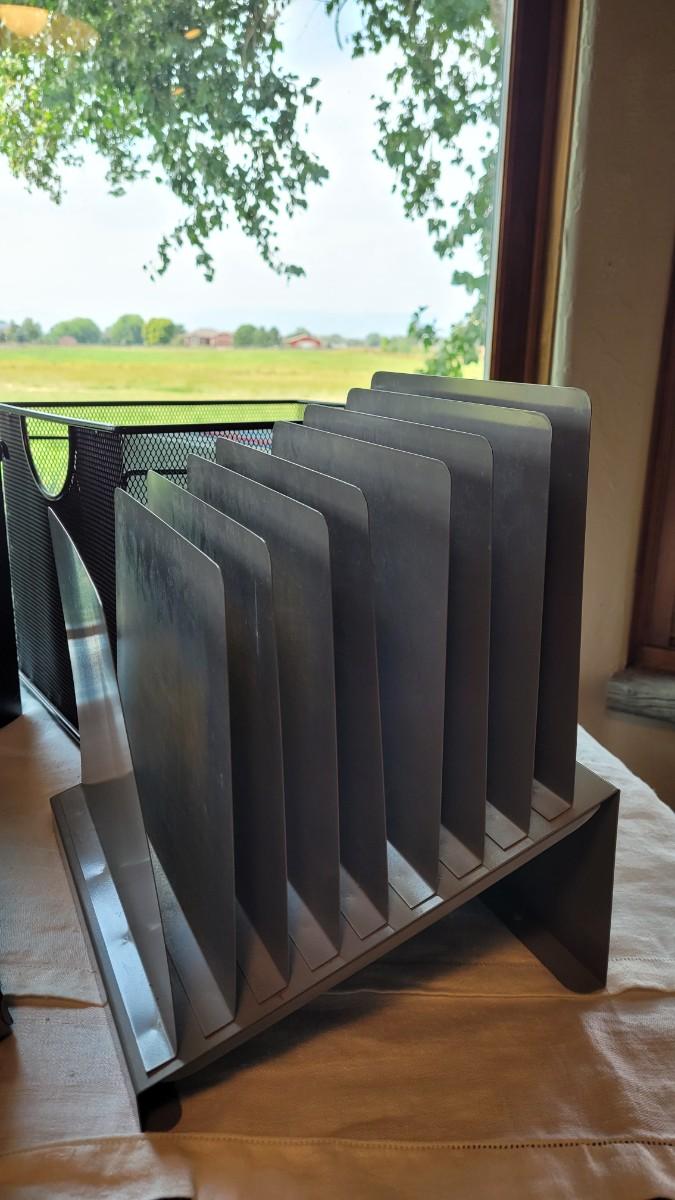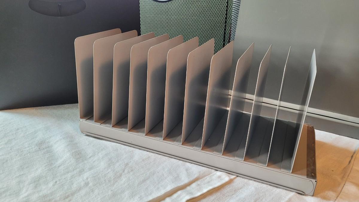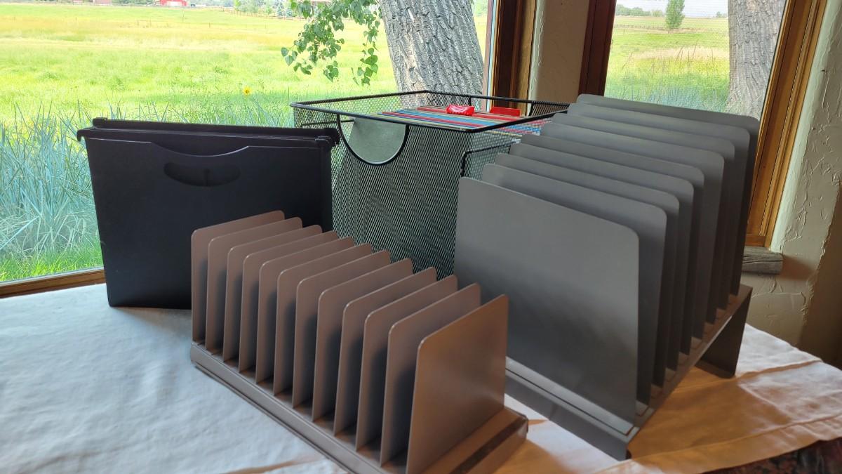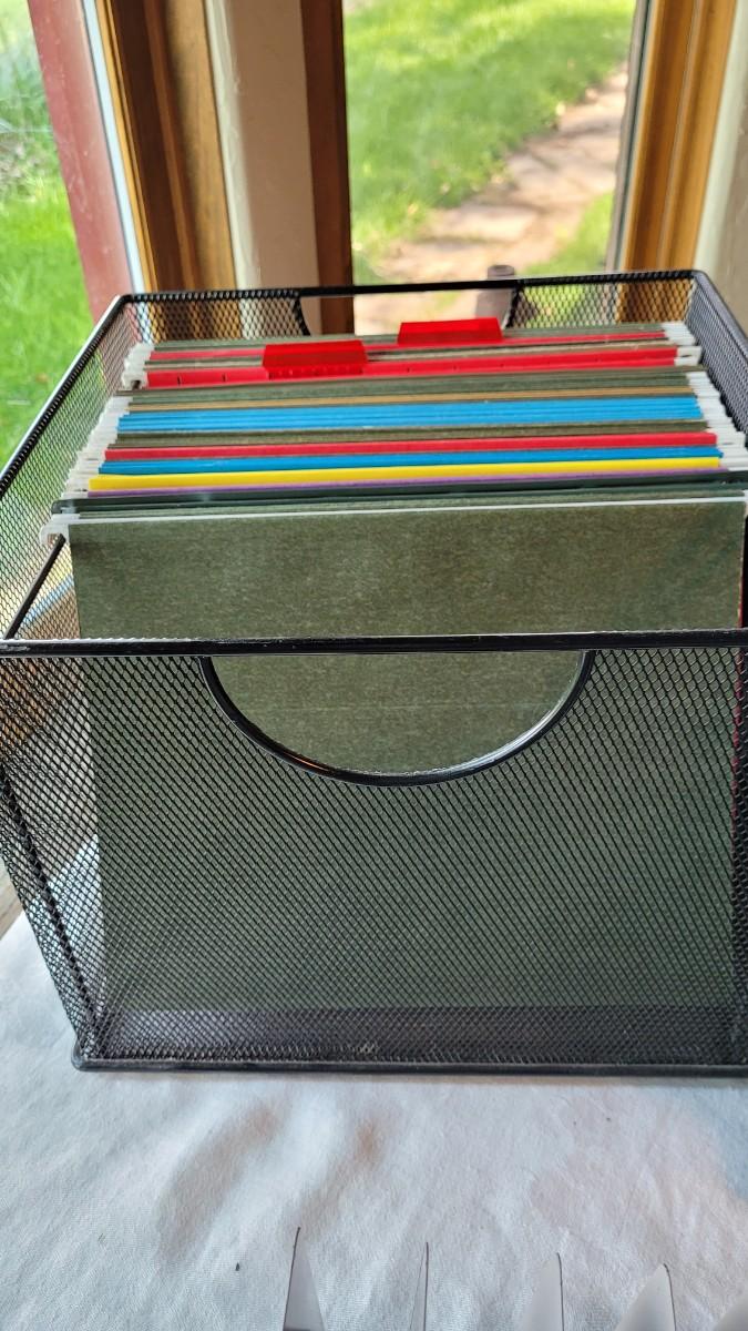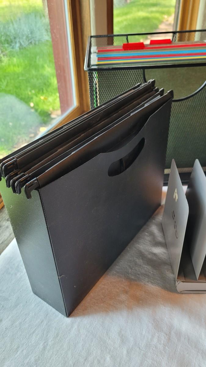 Lot 11: (2) Desktop Metal File Organizers, Black Filing Crate and Black Plastic File Folder