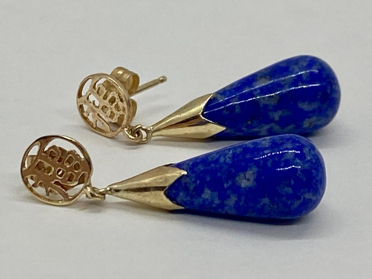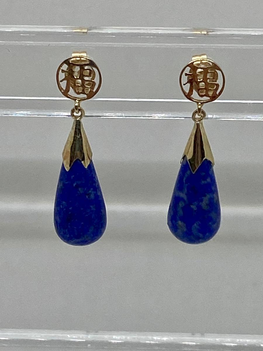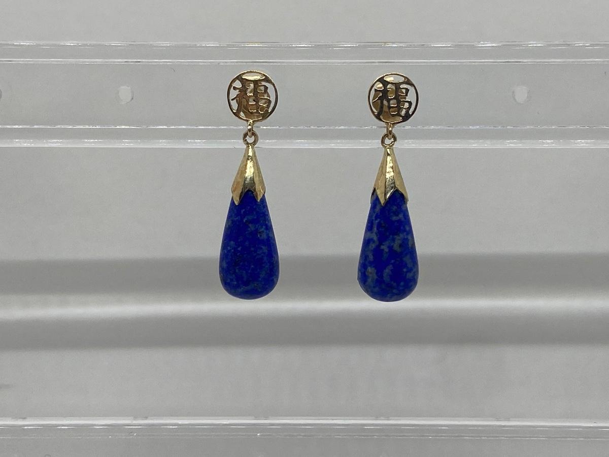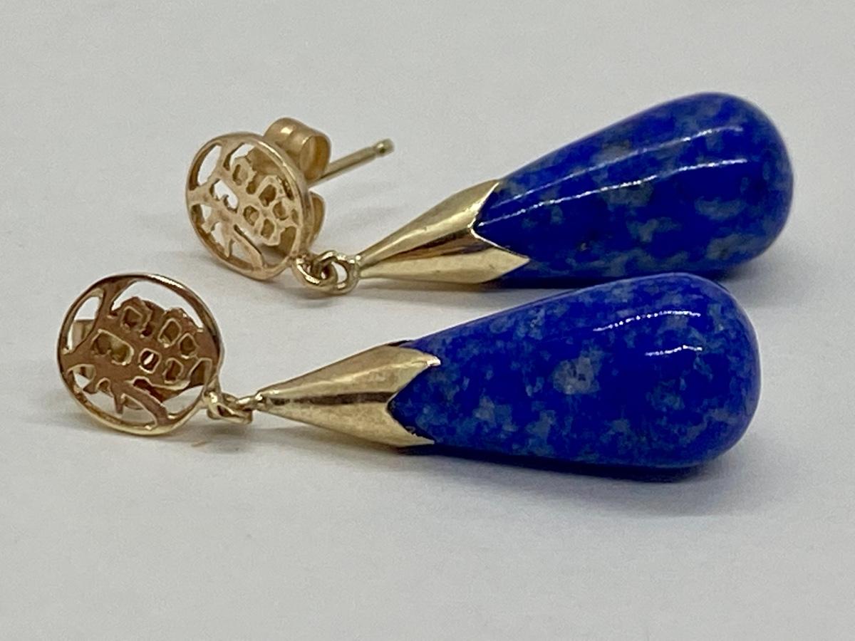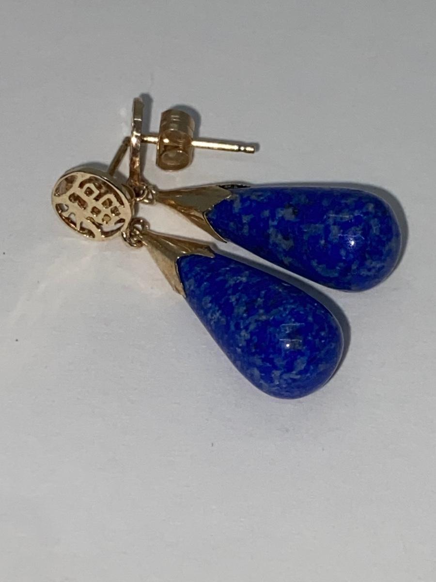 Lot 11: 14k WW Sapphire Blue Jade Good Fortune Teardrop Dangle Pierced Earrings