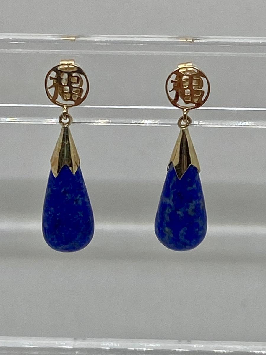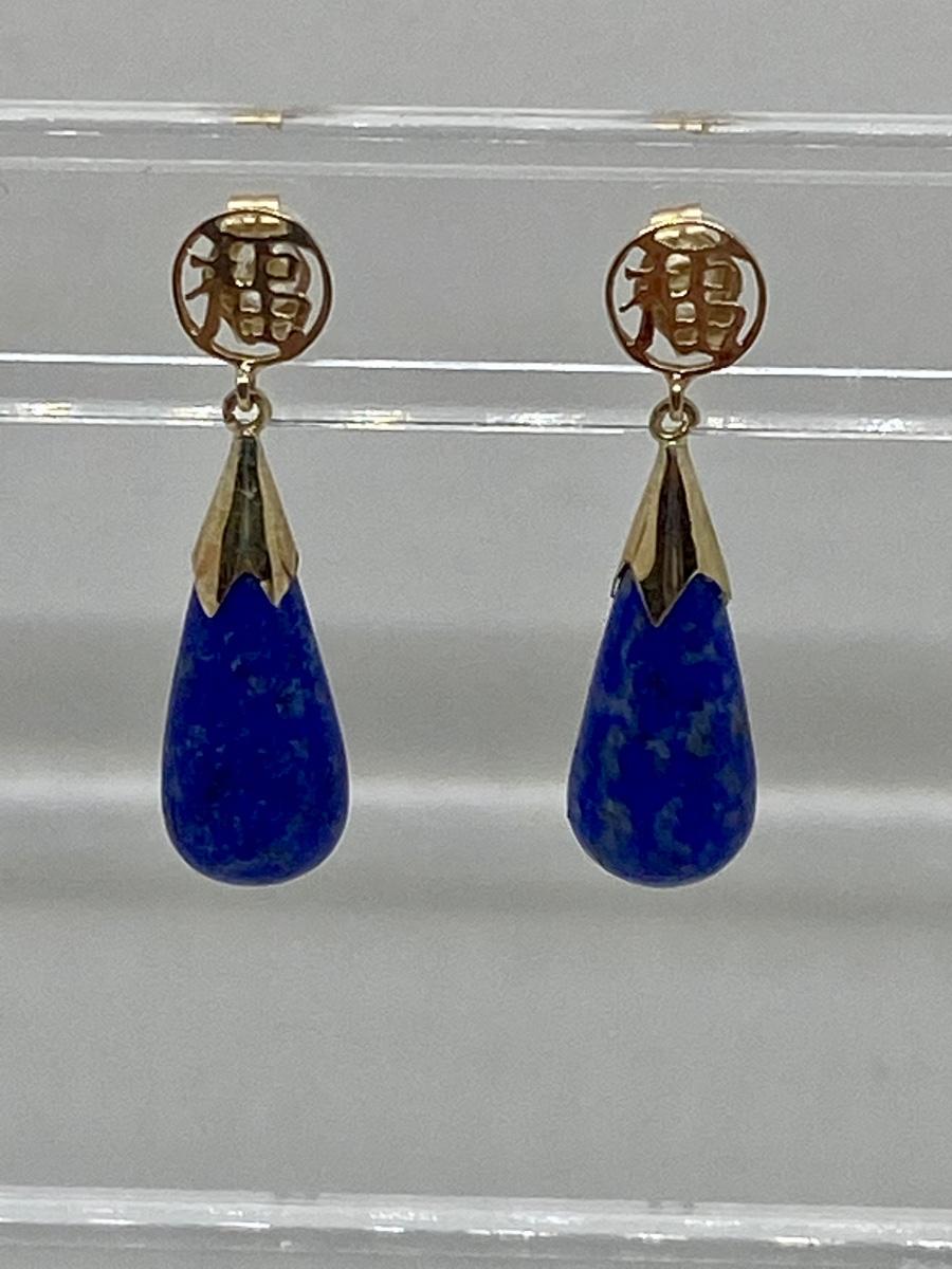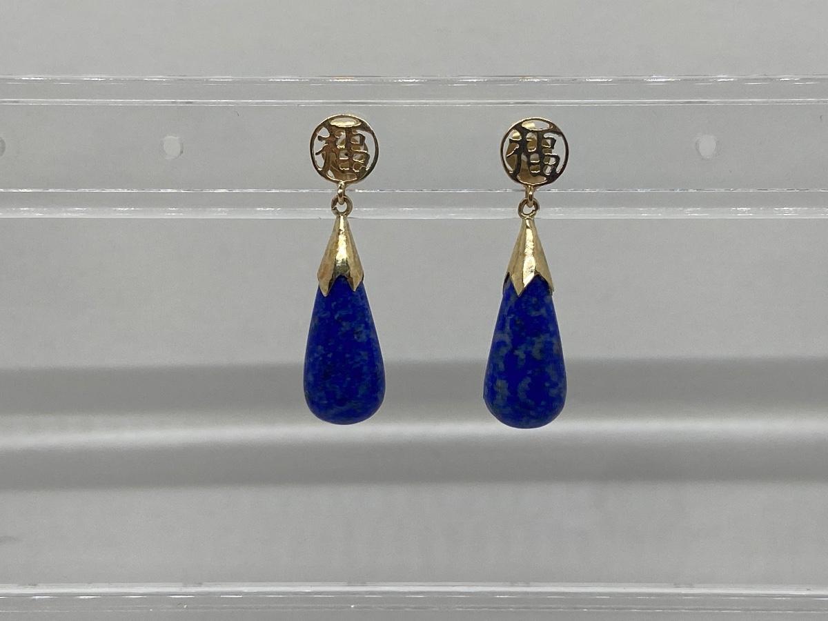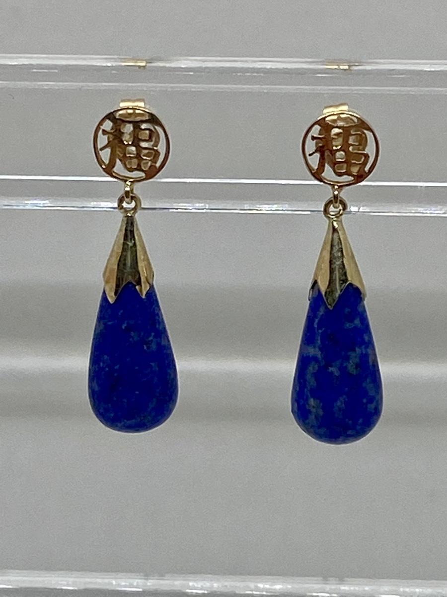 Lot 11: 14k WW Sapphire Blue Jade Good Fortune Teardrop Dangle Pierced Earrings