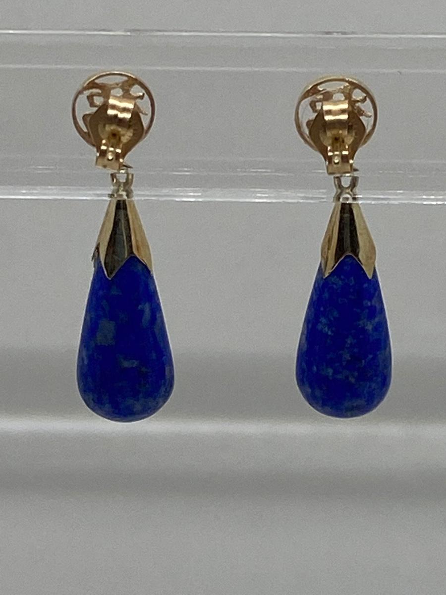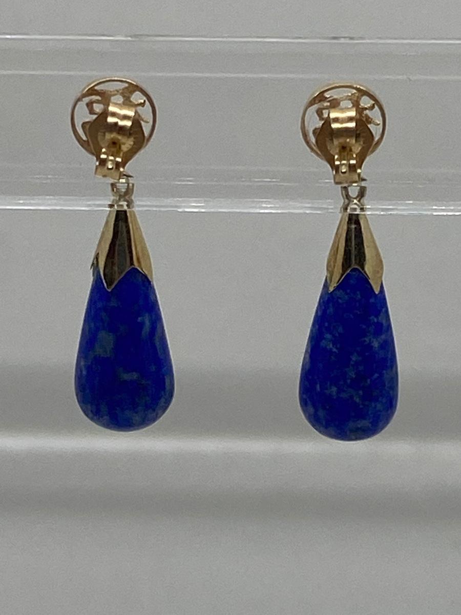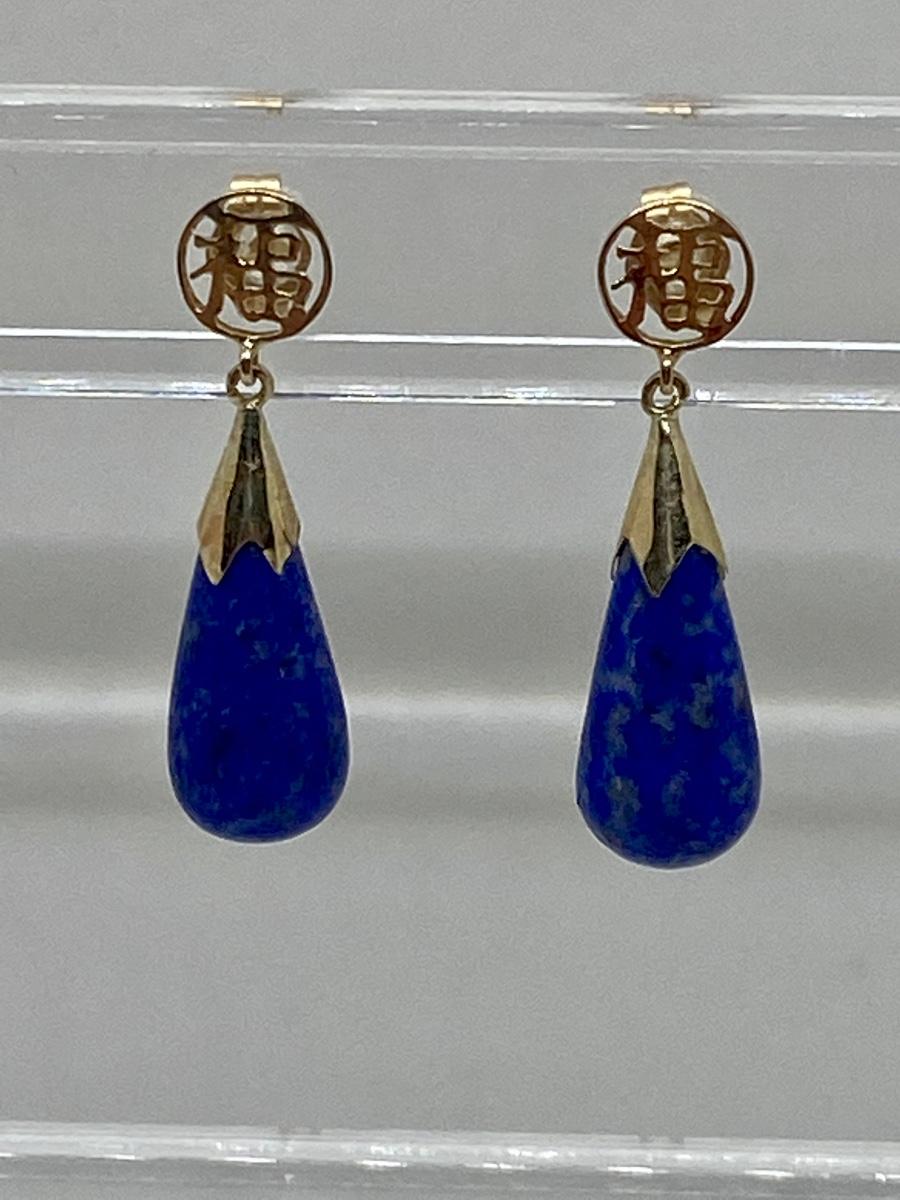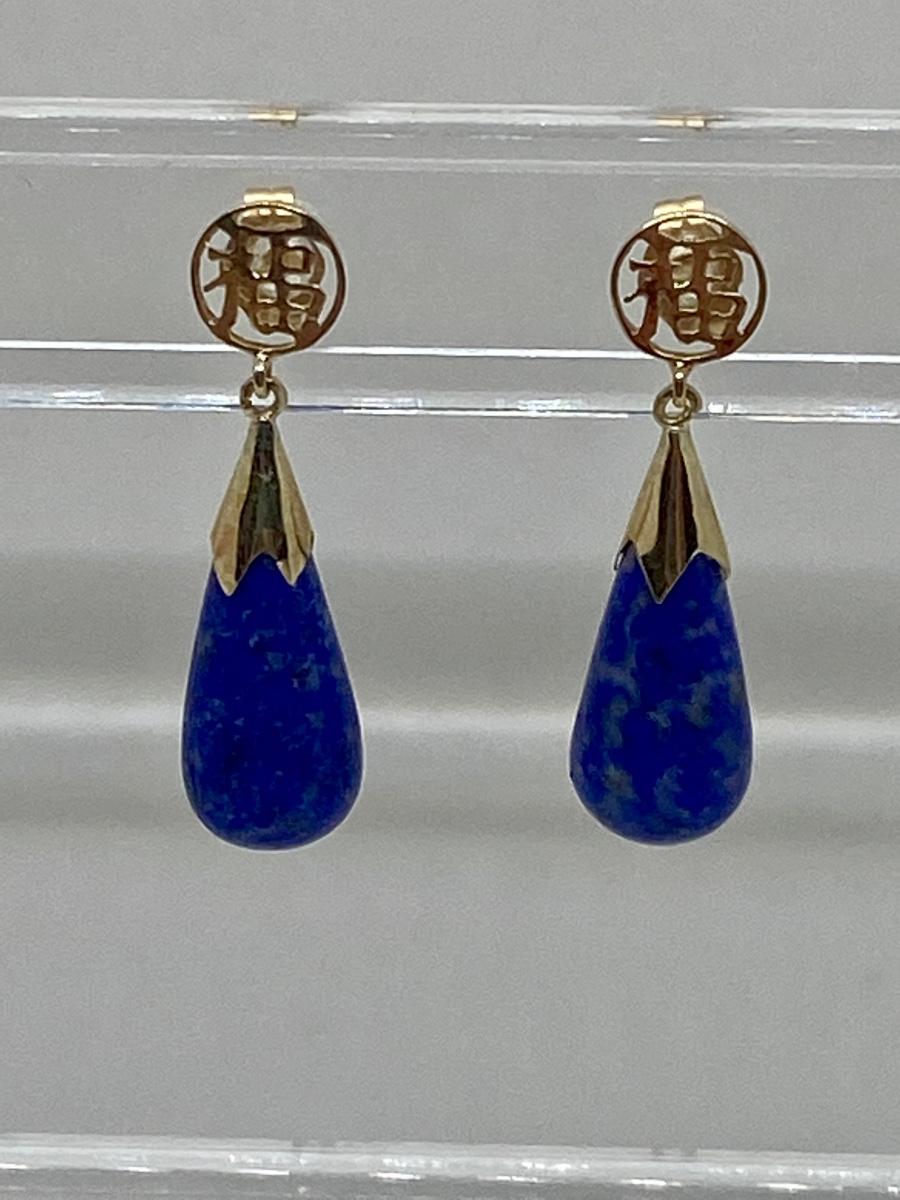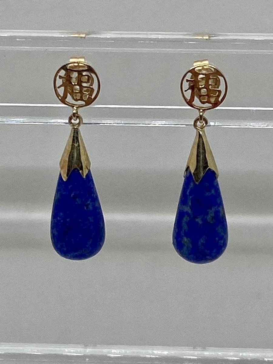 Lot 11: 14k WW Sapphire Blue Jade Good Fortune Teardrop Dangle Pierced Earrings