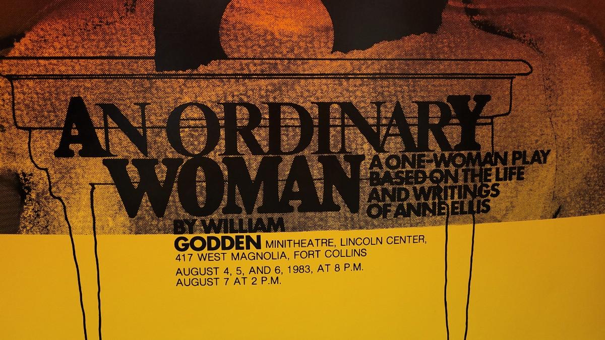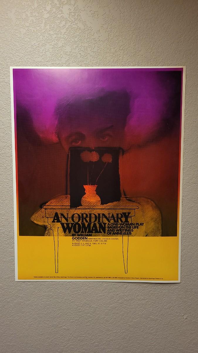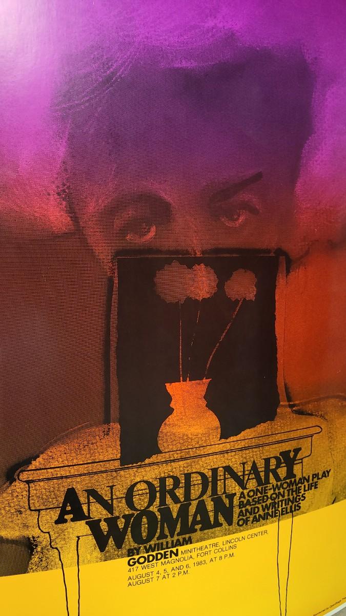 This lot features a highly colorful promotional poster for the one-woman play promotion of An Ordinary Woman by William Godden at the Lincoln Theatre. This poster does not have an accredited designer but appears to be a JOHN SORBIE from other reference designs. Measures about 29" x 23".