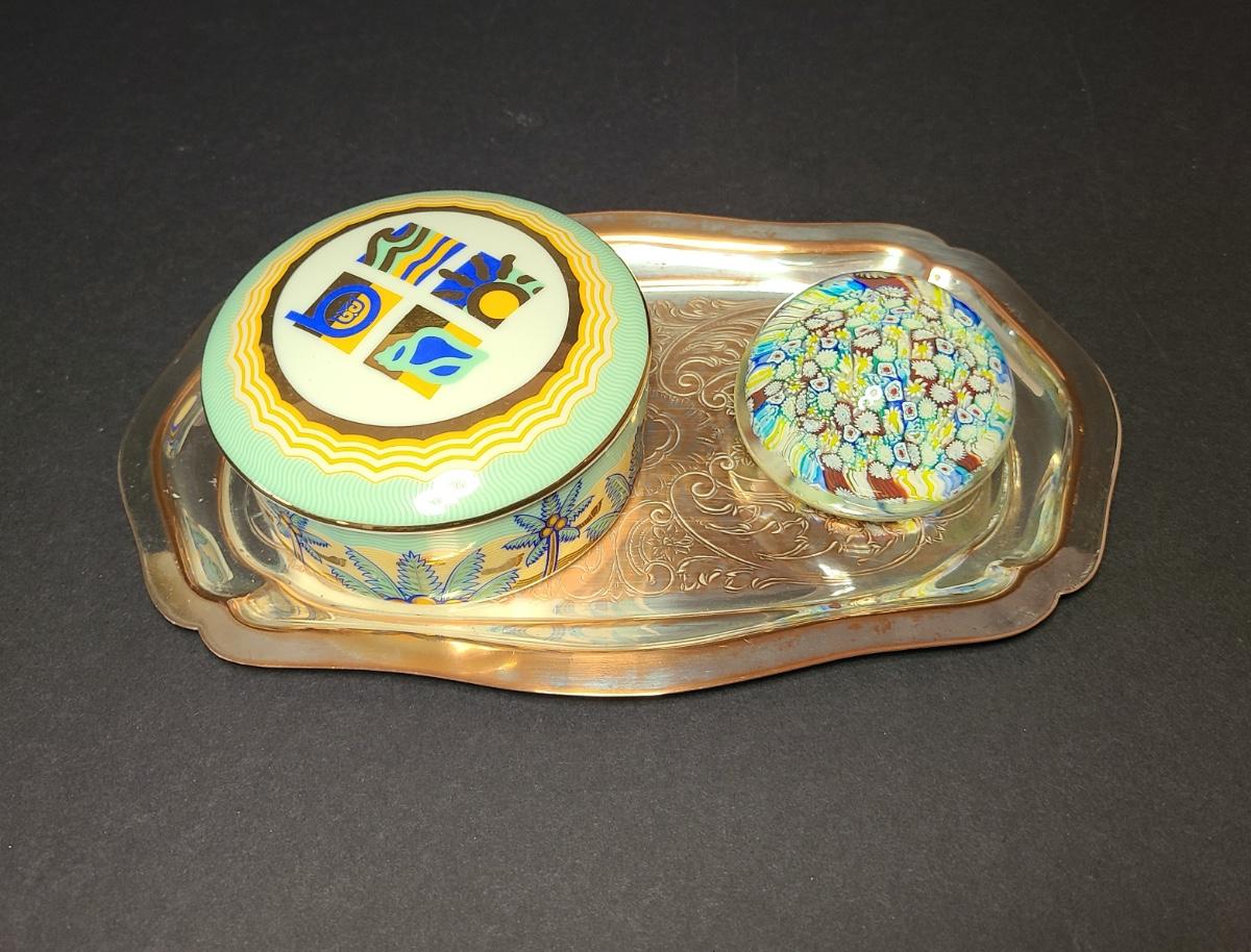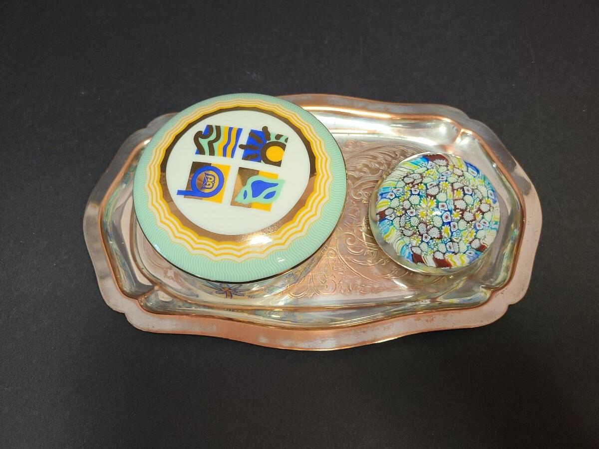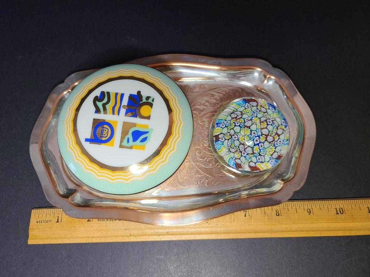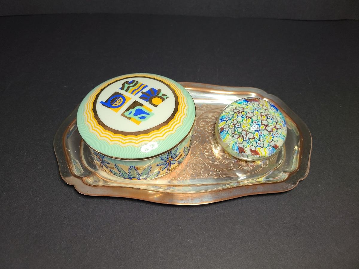 Lot 111: Tiffany & Co. Trinket Dish, Murano Milliefore Paperweight, and Silver Over Copper Tray