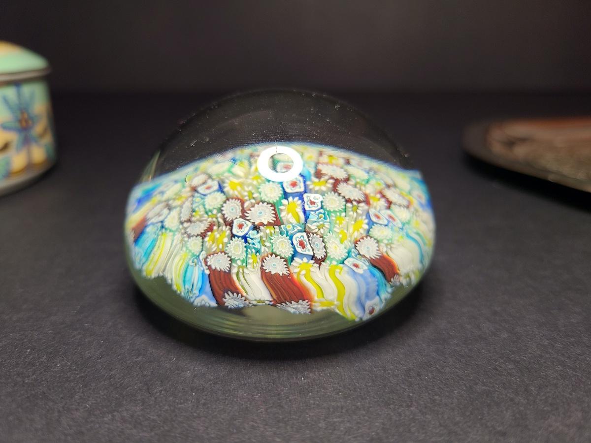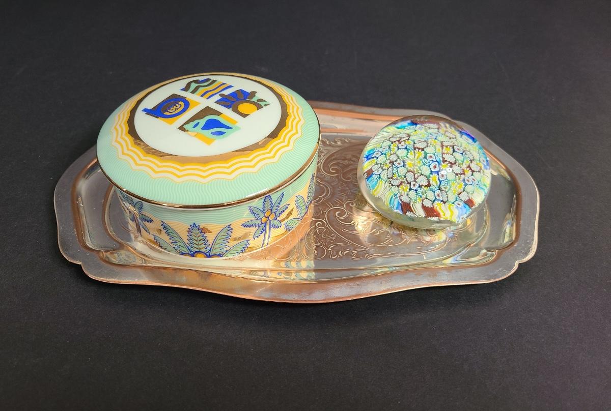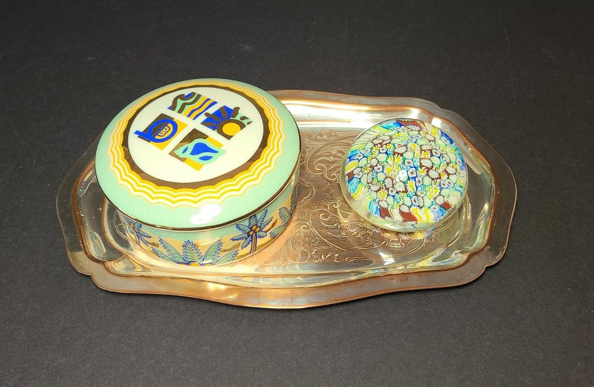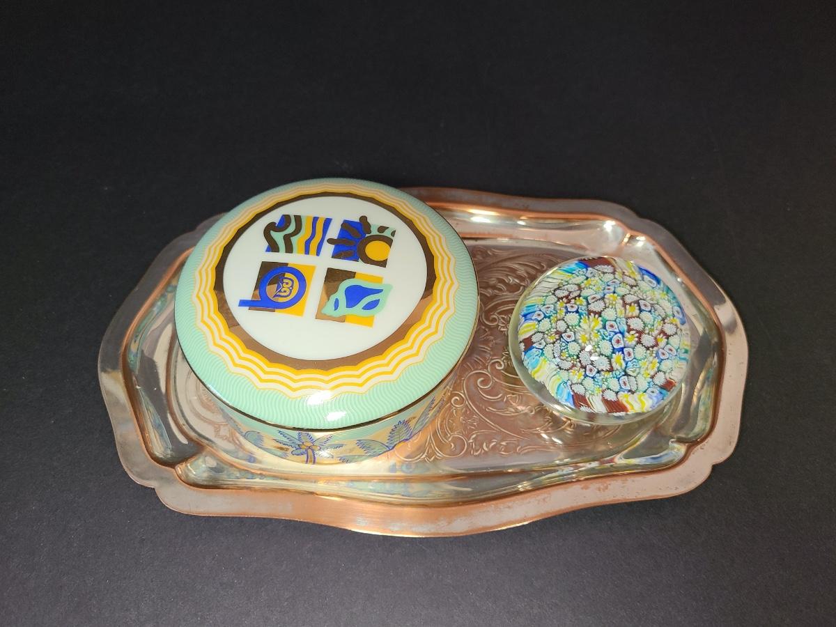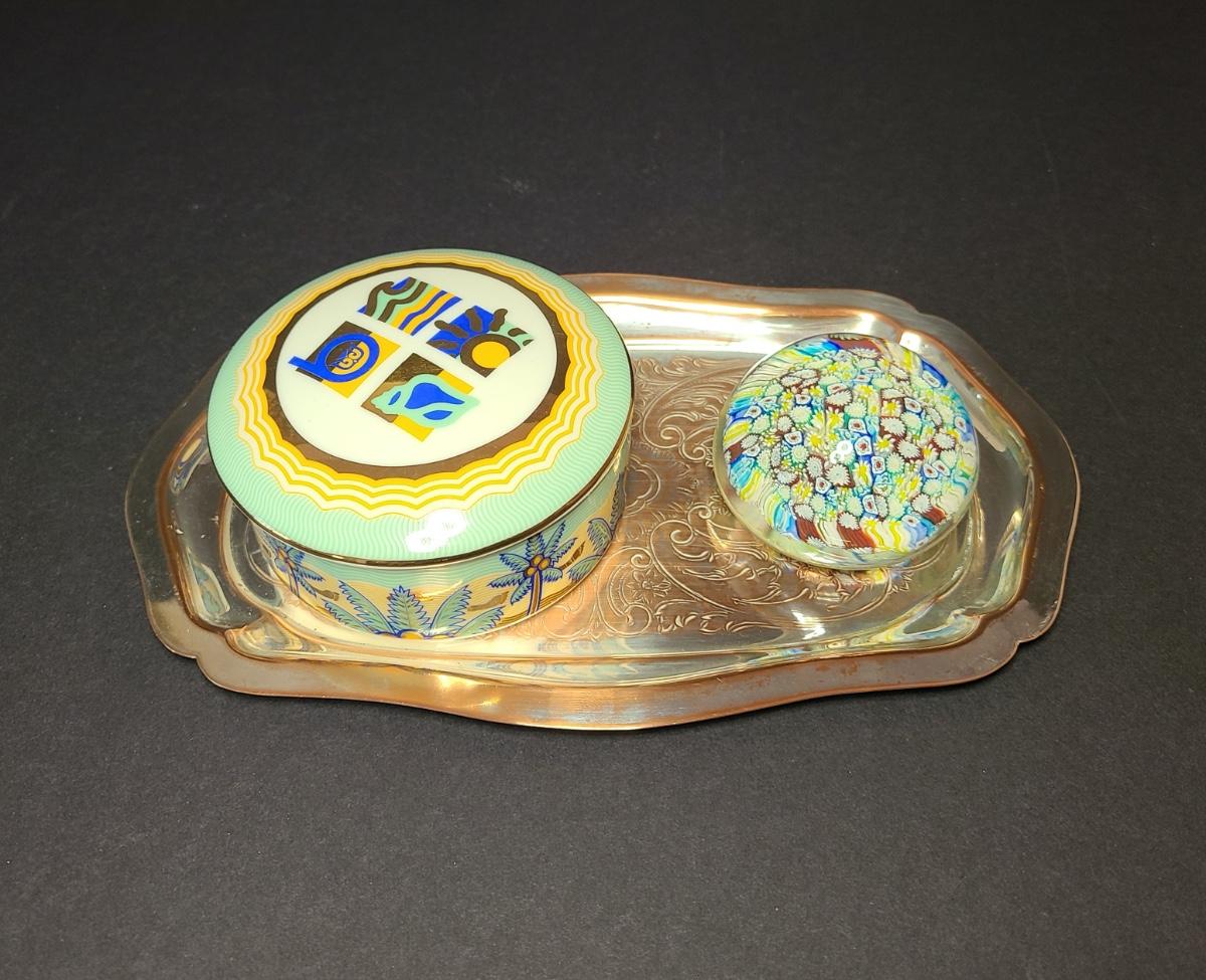 Lot 111: Tiffany & Co. Trinket Dish, Murano Milliefore Paperweight, and Silver Over Copper Tray