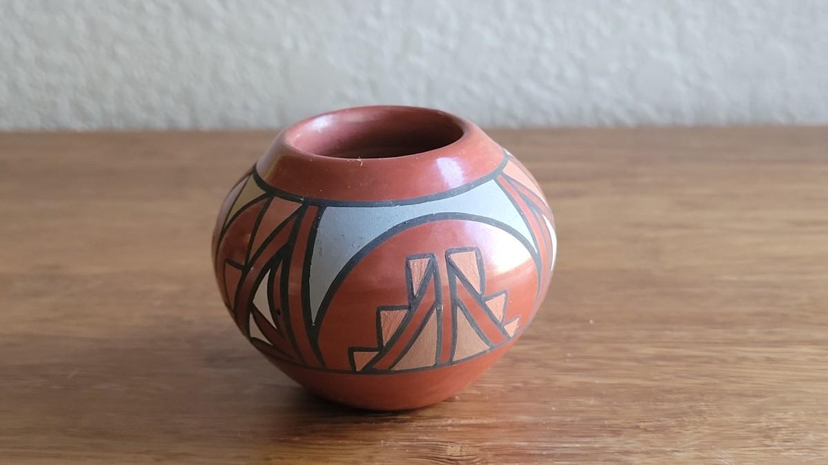 Excerpt: Joe Talachy (b. 1943) and Thelma Talachy (b. 1942) are two of the few potters from Pojoaque Pueblo in New Mexico. Thelma is a sister of Minnie Vigil, Lois Gutierrez, and Gloria Garcia. Their daughter, Melissa Talachy, is also a well-known potter. Each piece is coil-built and painted with natural clay slips.