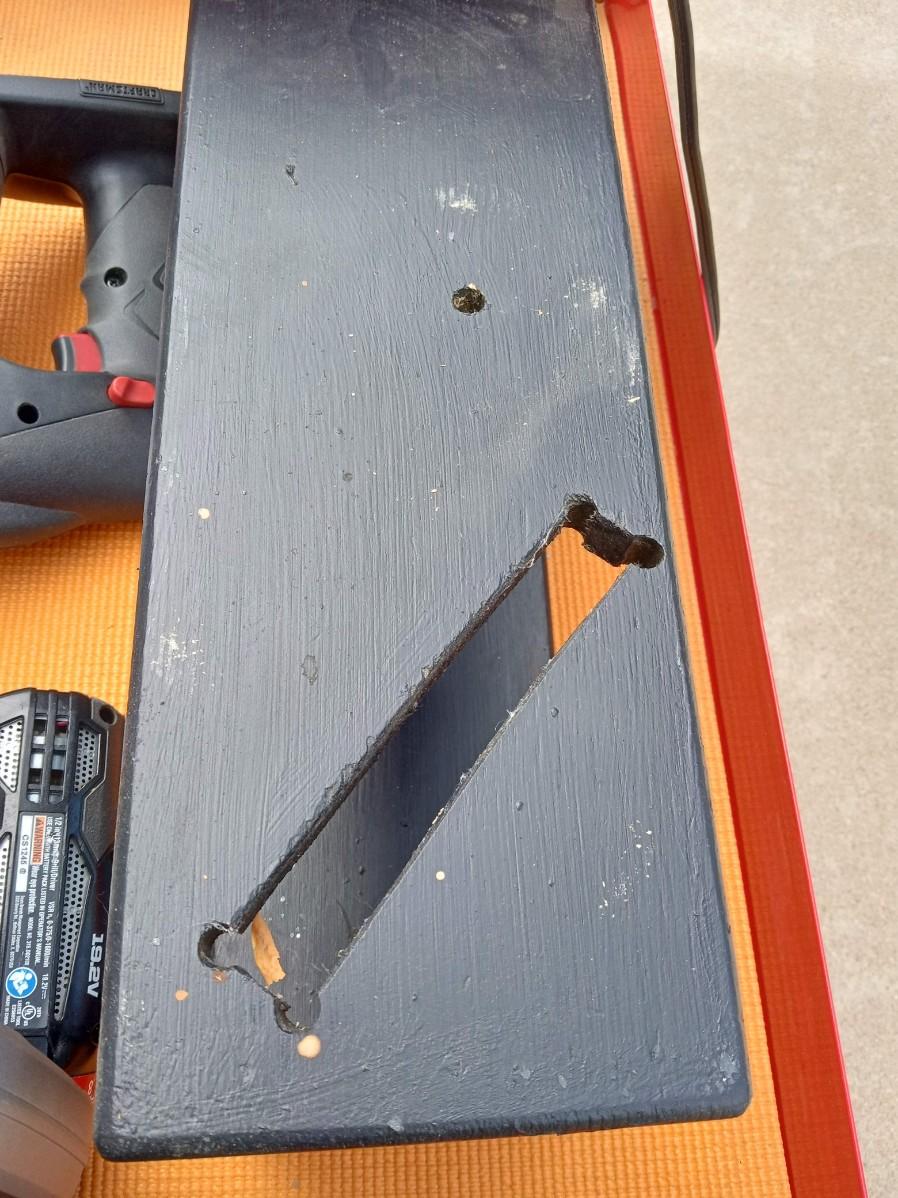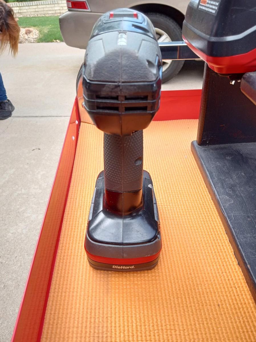 THE BATTERY CHARGER IS MOUNTED TO A WOODEN STAND WHICH ALSO HOLDS THE POWER TOOLS