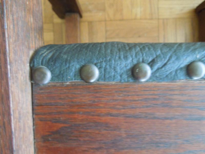 Rocker is solid, but has been well used and needs reupholstering and repair. Upholstered green seat is not leather. Shard of wood about 2" x 1" taped to side of seat. Nice brass nail head detailing. Finish on wood is worn and scratched in places. Stuffed with cotton and straw. 32 L x 27 W x 34 H