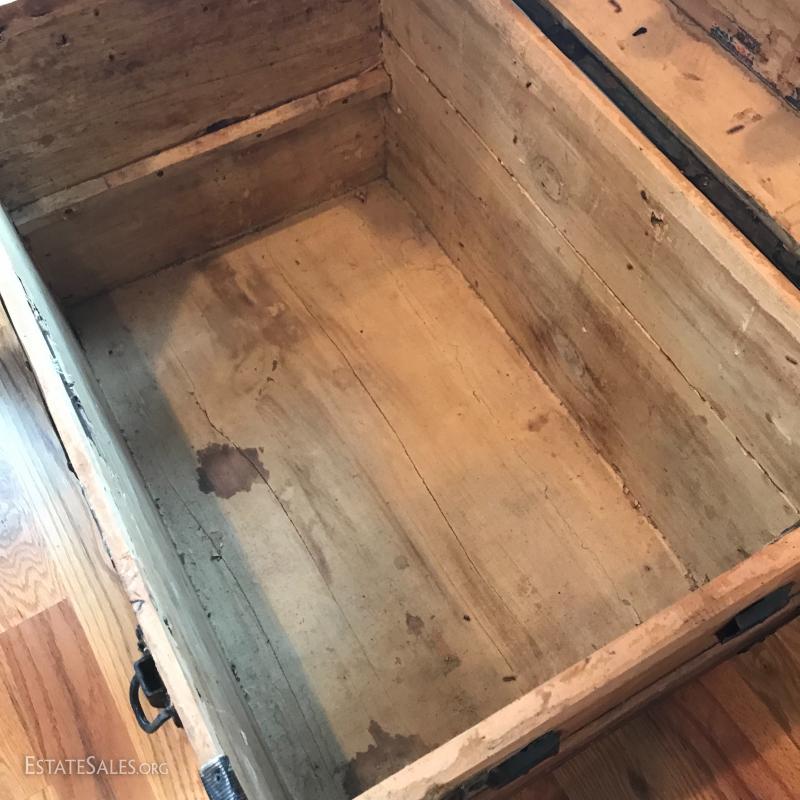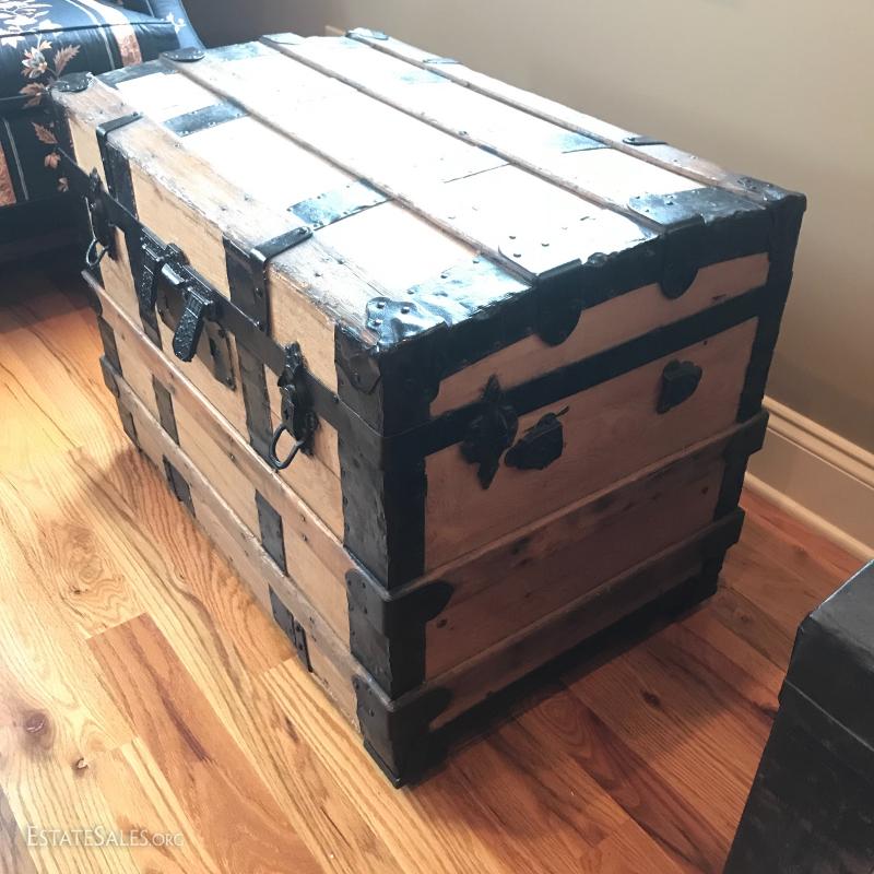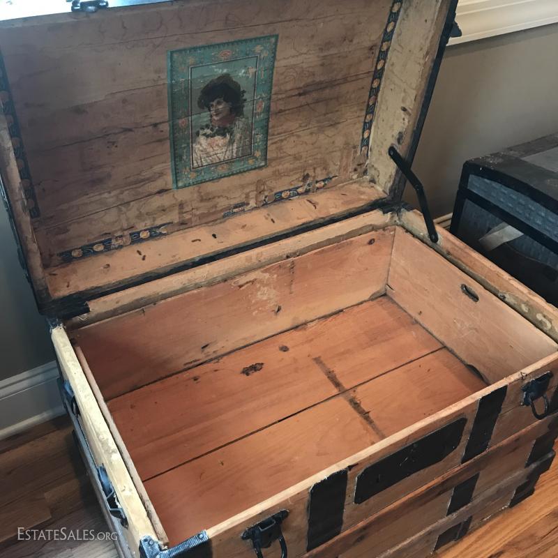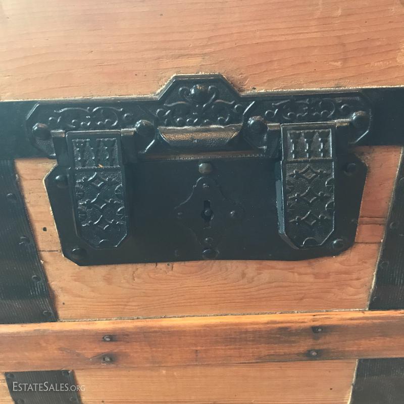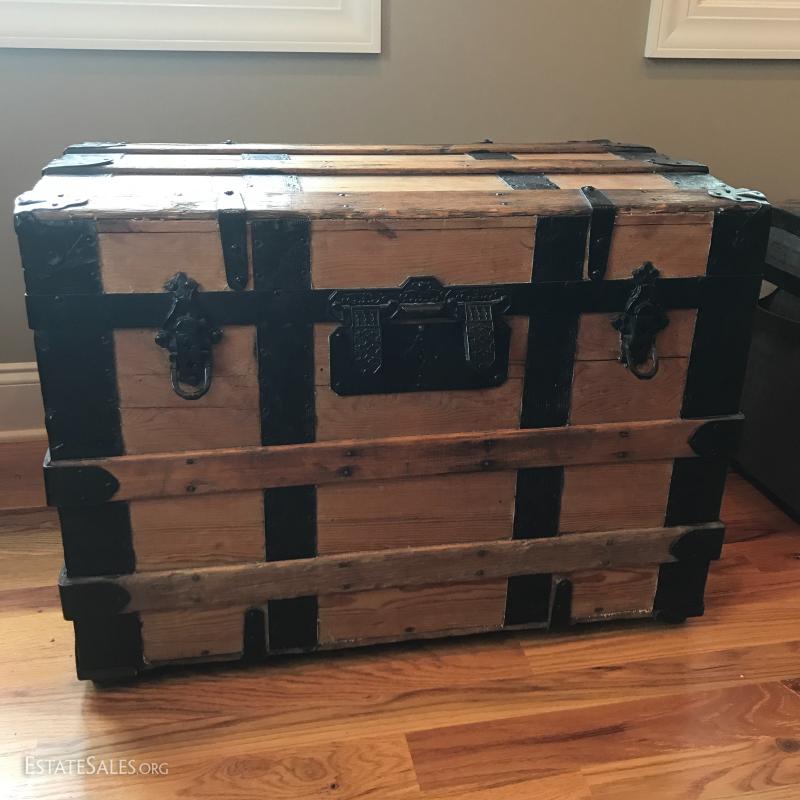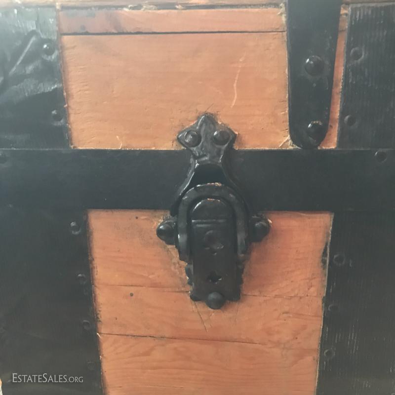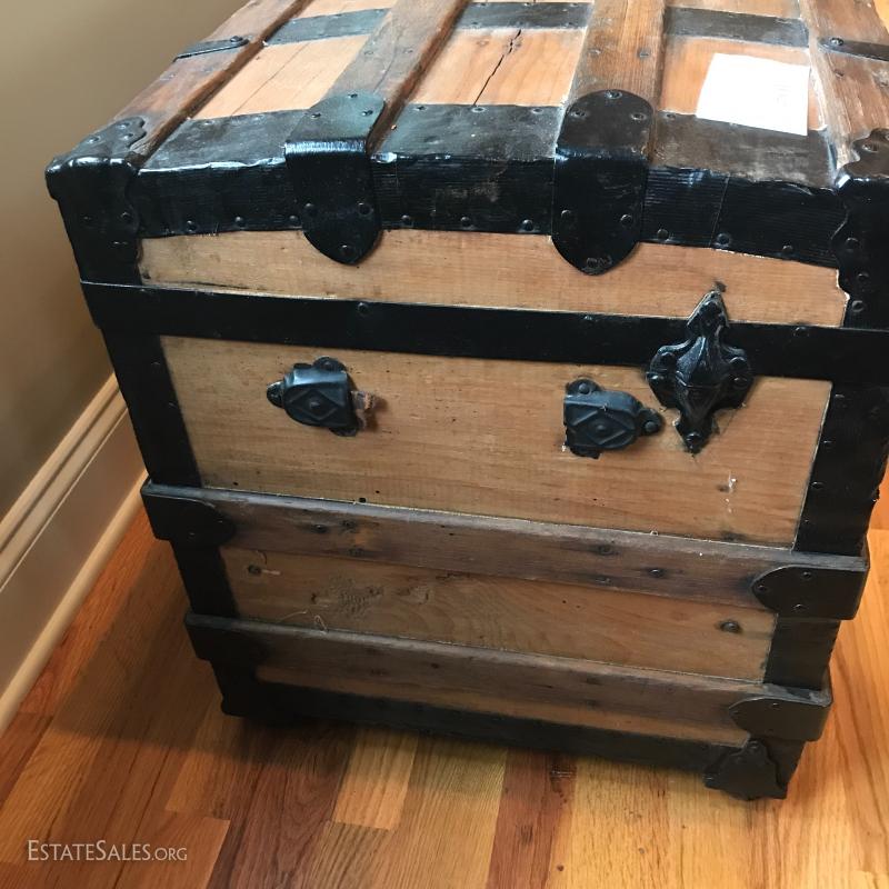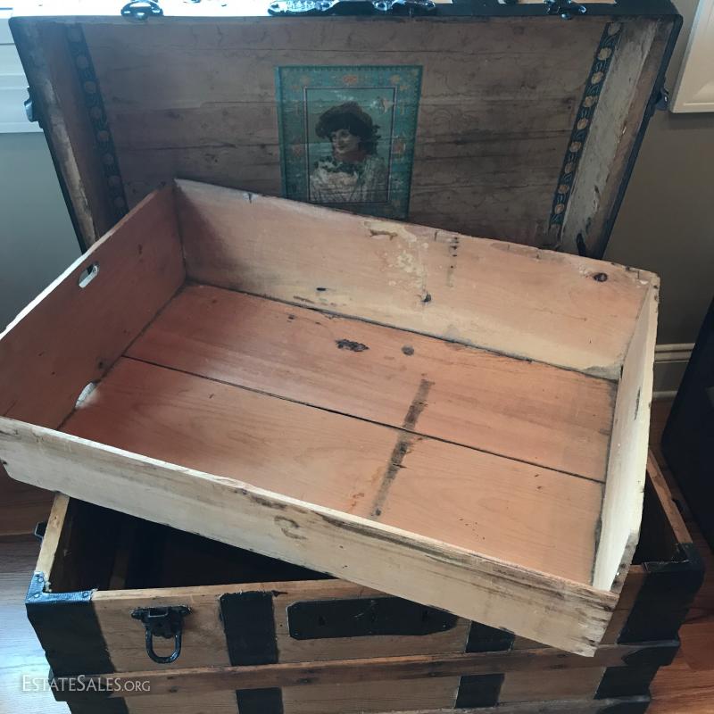 Antique Steamer Truck with Lift Out Tray. In very nice condition both inside and out. Unfortunately, the leather handles have broken off but both leather pieces are still available so you can fix if you desire. The original lift out tray is still intake and in great condition.