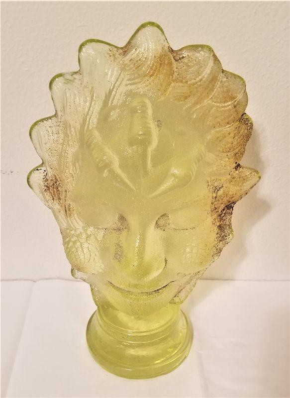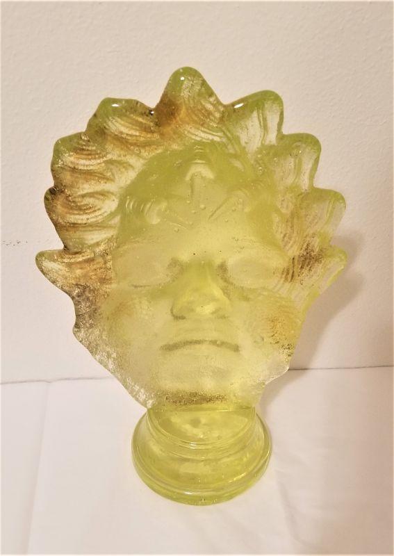 This wonderful studio glass sculpture by well known local glass artist Mitchell Gaudet has an incredible visual effect - no matter which side of the piece you look at (front or back), it appears that a benign face with an enigmatic smile is looking at you. Stands about 11.5" tall, 7" across. Note: there is a sliver of glass missing on one part of the base. You have to feel it with your finger, but I wanted to mention it for accuracy. I tried to picture it. Pieces similar to this one are sold in his gallery for around $375.00.