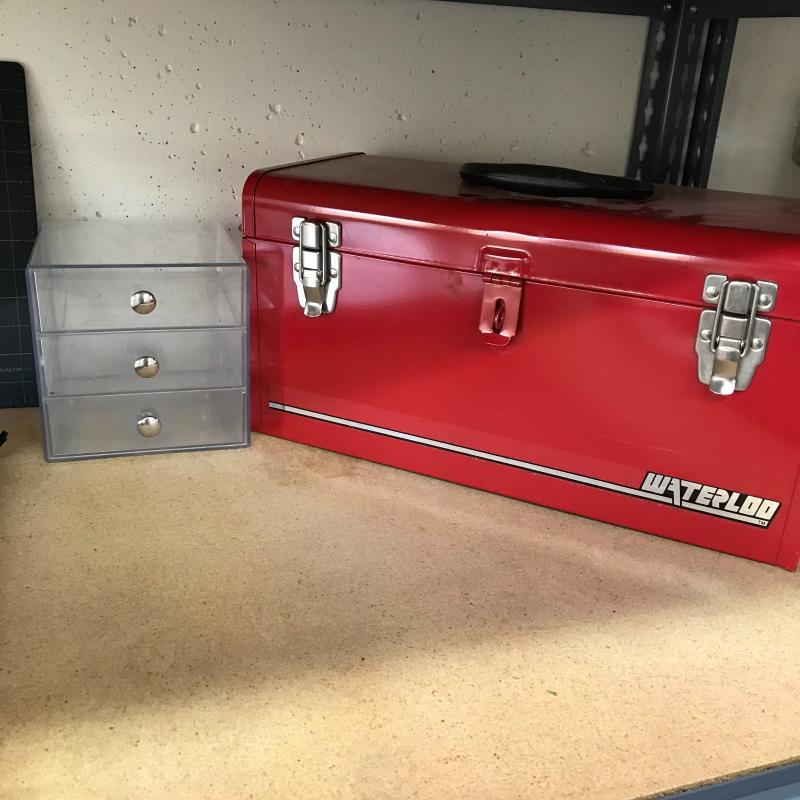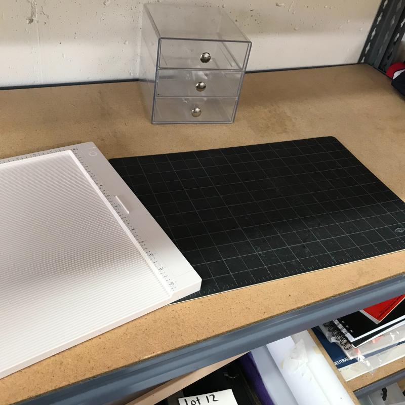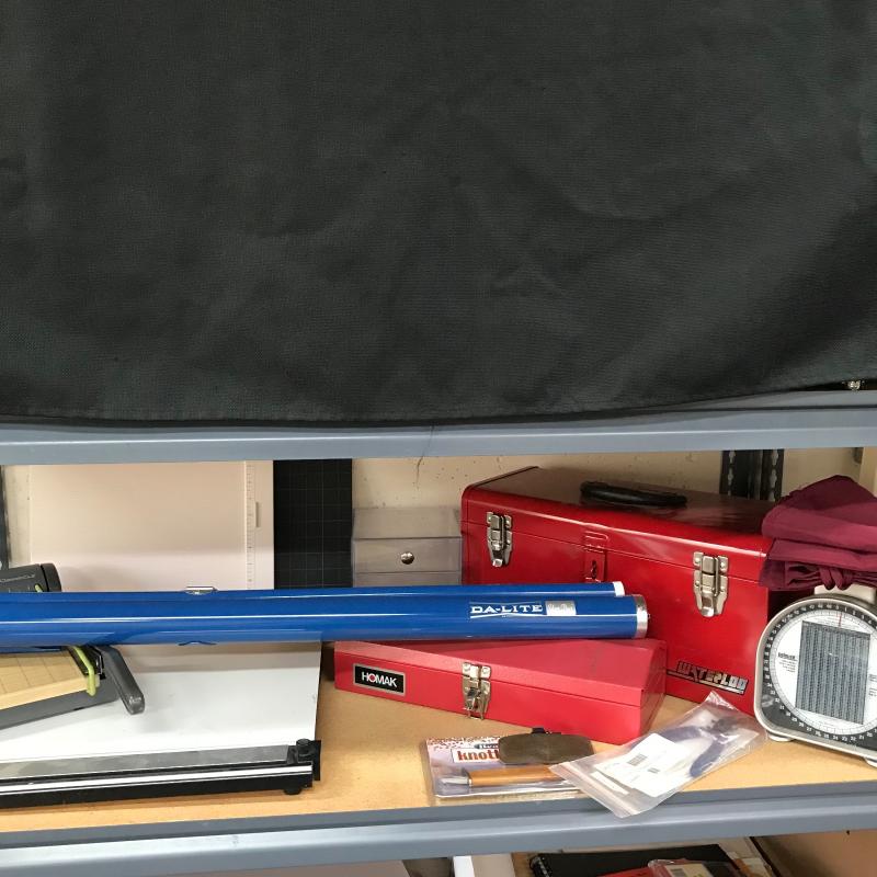 Lot includes two metal tool bins(one has general contents), portable drafting table, paper cutter, scale, misc. jewelry tools, delite projector screen and more. Lot is available for local pickup in Asheville, NC.