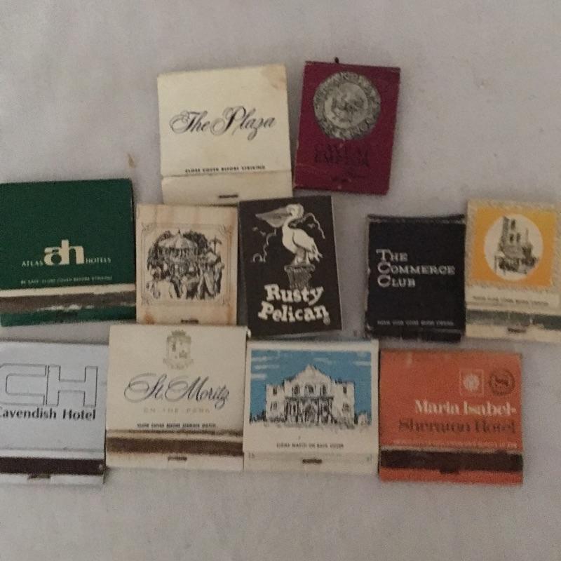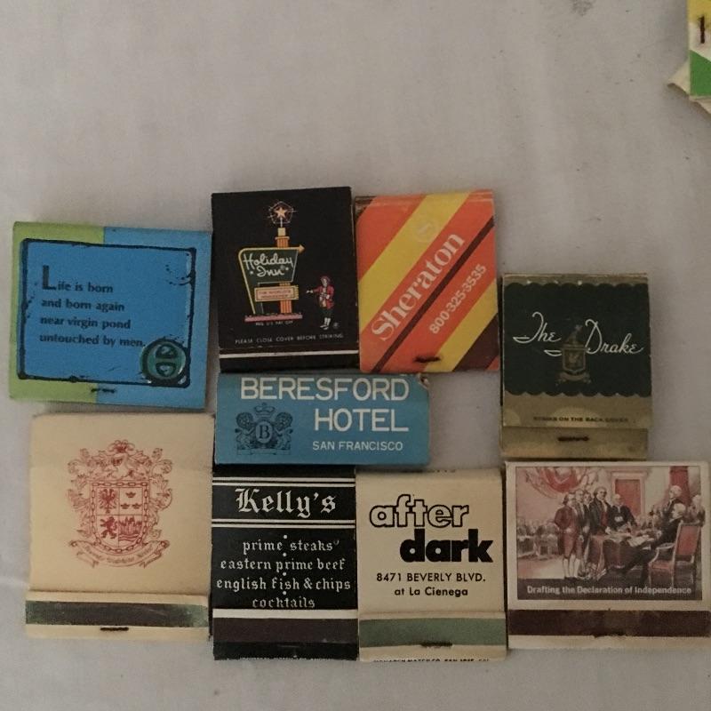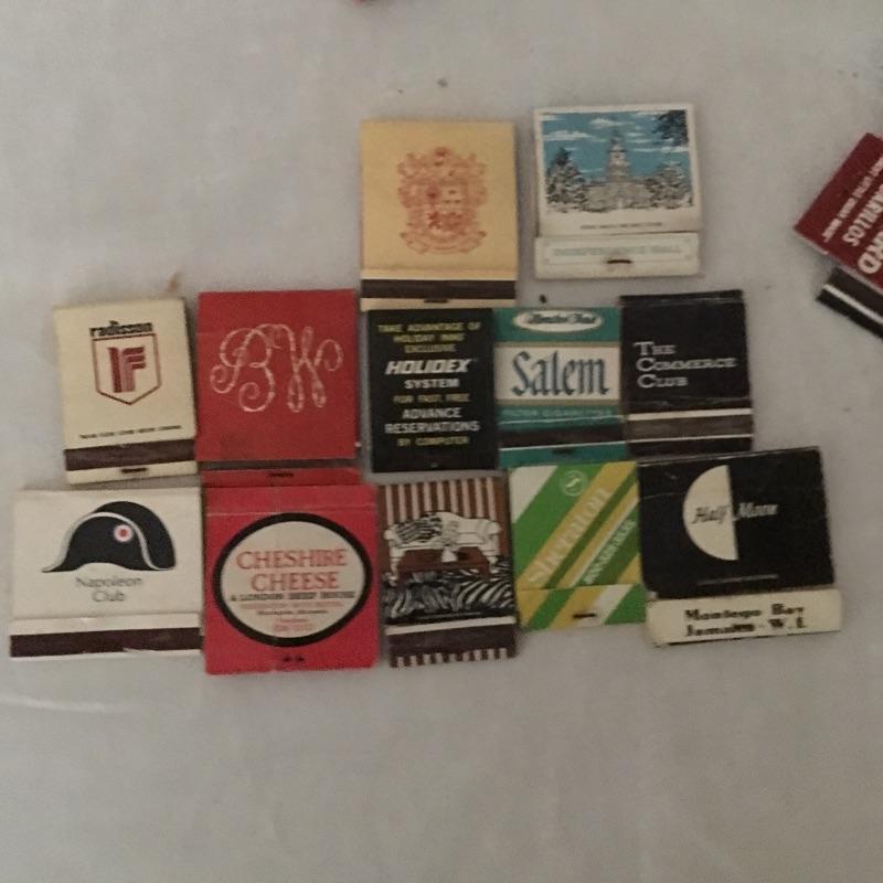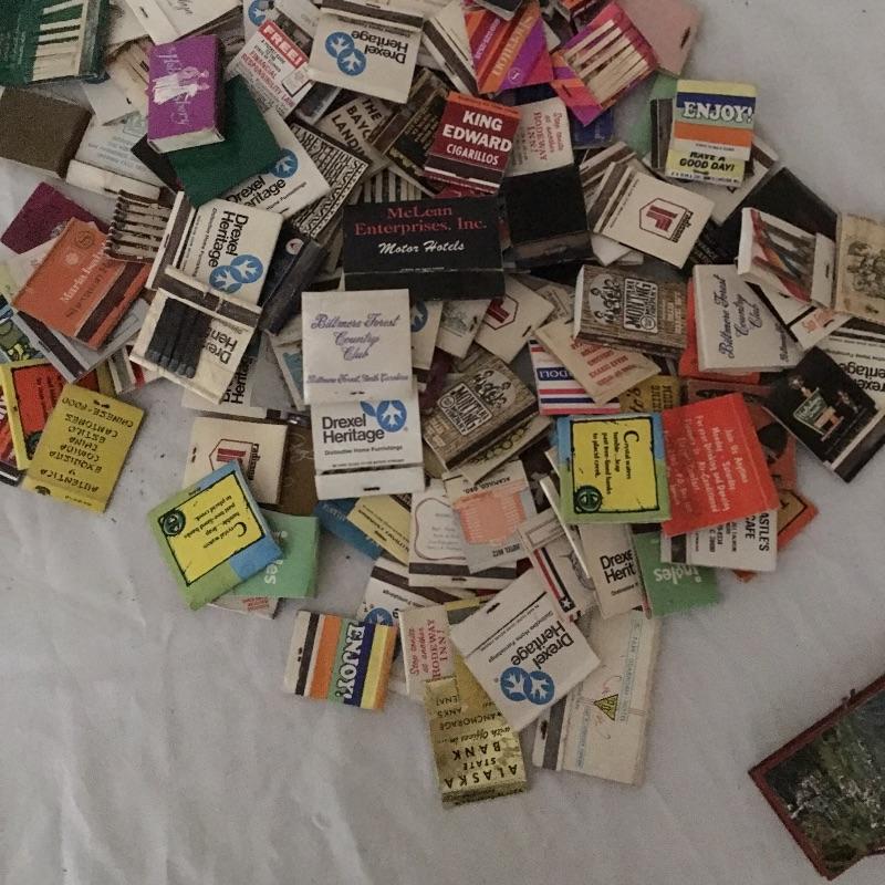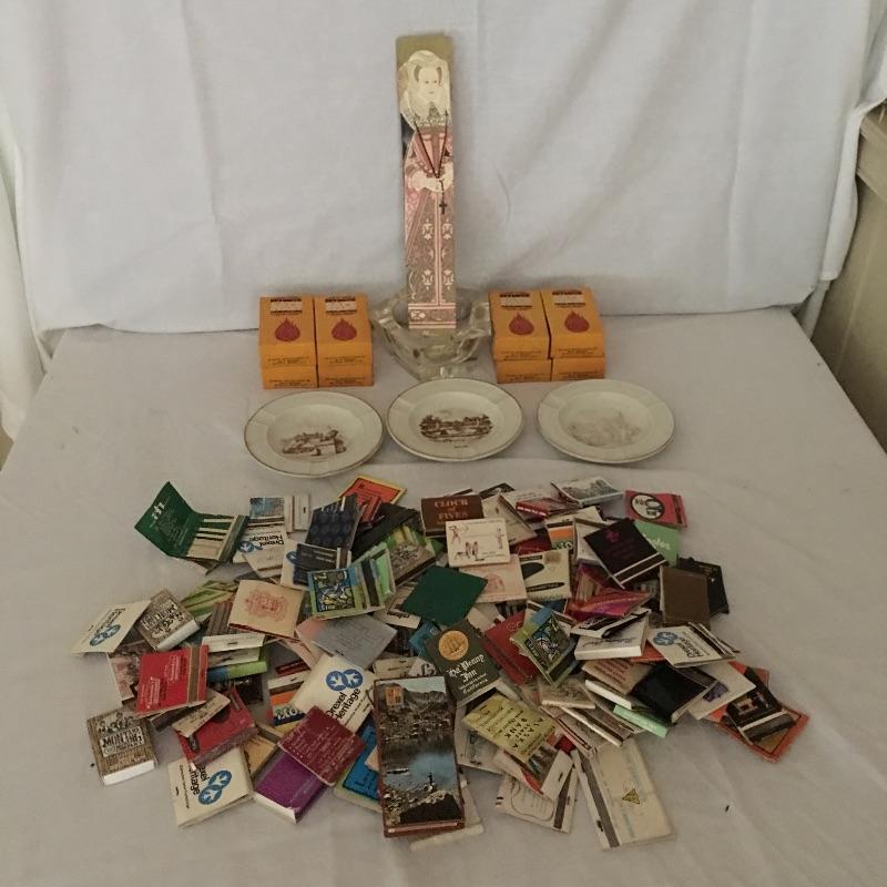 Trio of Bavarian ashtrays comes with additional glass ashtray, vintage fire starters and a large collection of matchbooks from a variety of establishments.