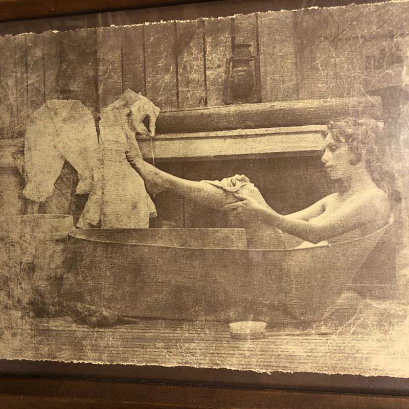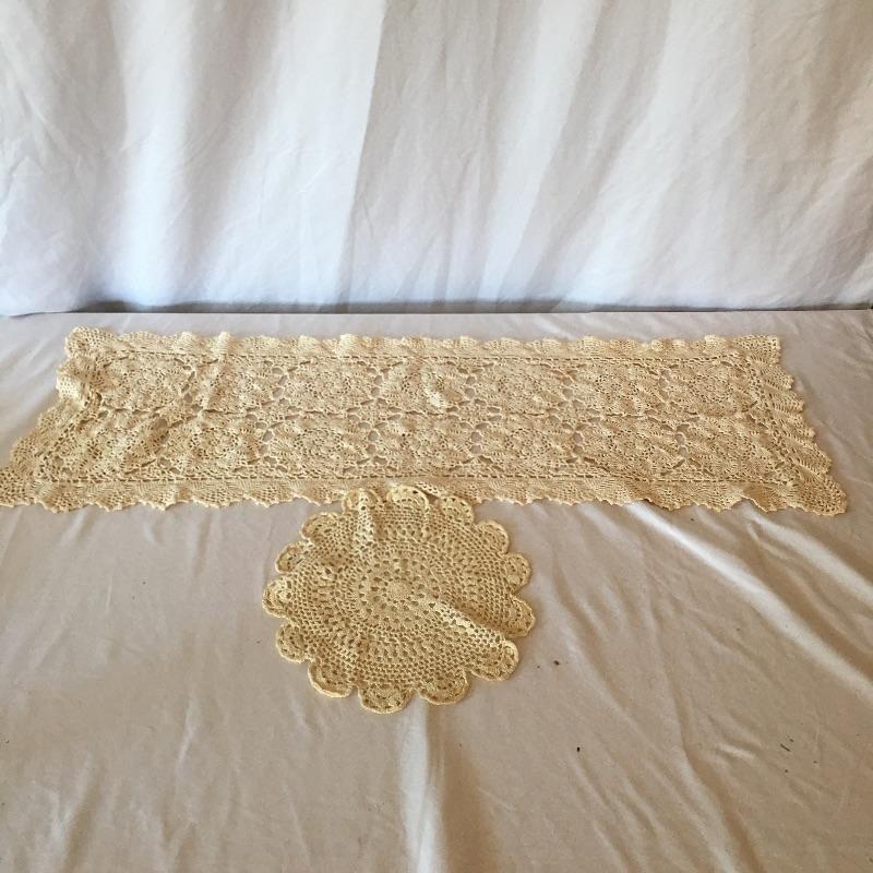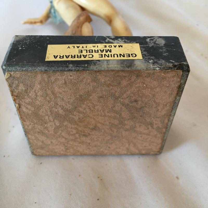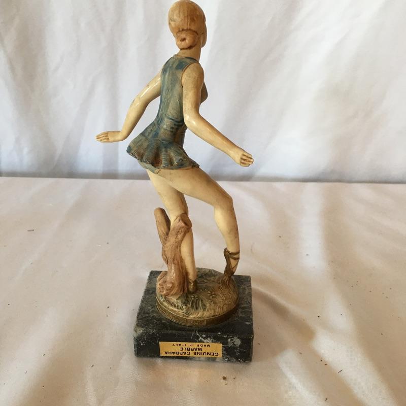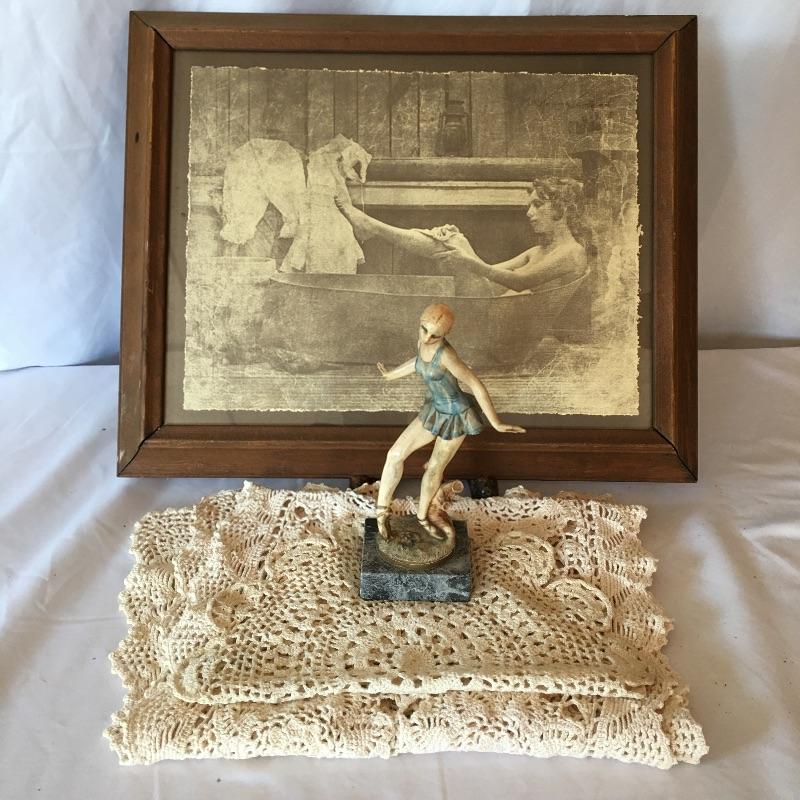 This lovely lot includes a ballerina on a Carrara marble base that was made in Italy. The ballerina appears to be made of an acrylic. This lot also includes a wooden framed print of a woman bathing in an iron tub and a doily with table runner. Frame measures 13.5” x 16.5”.