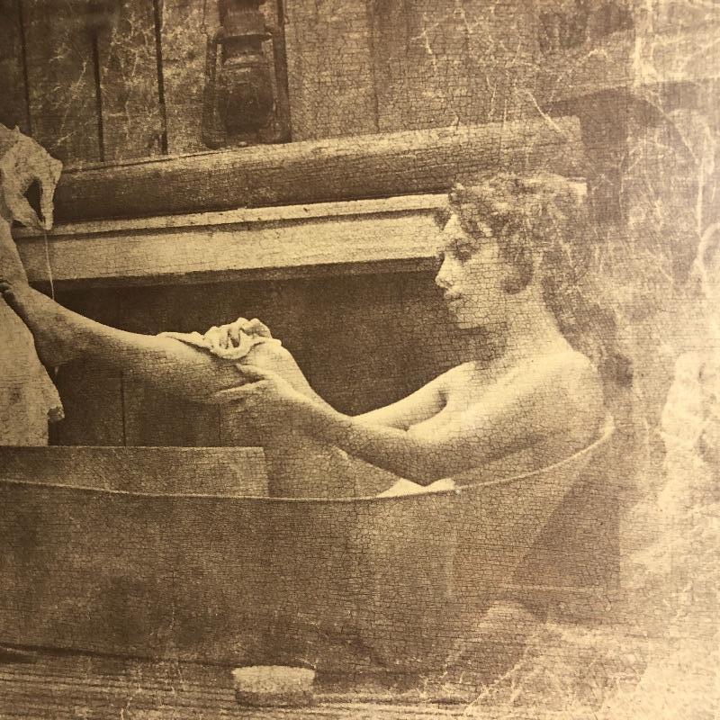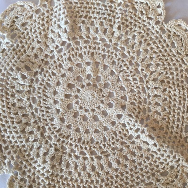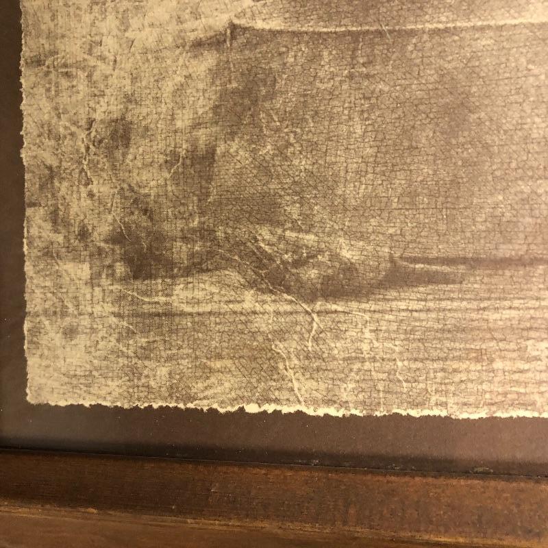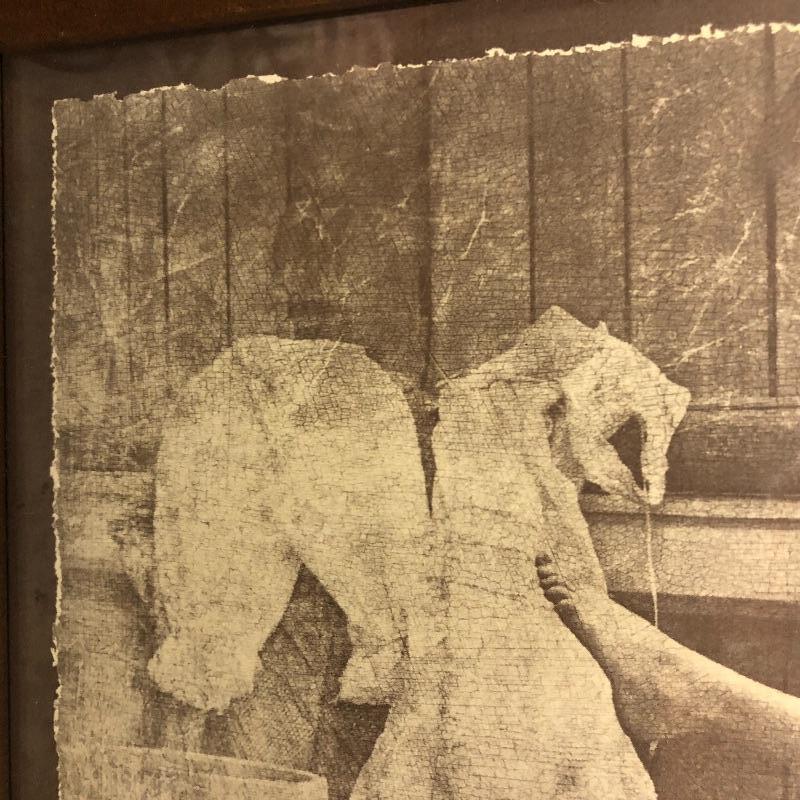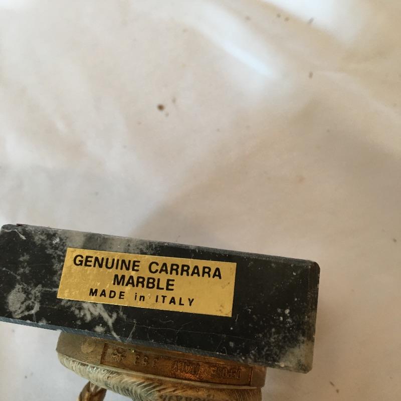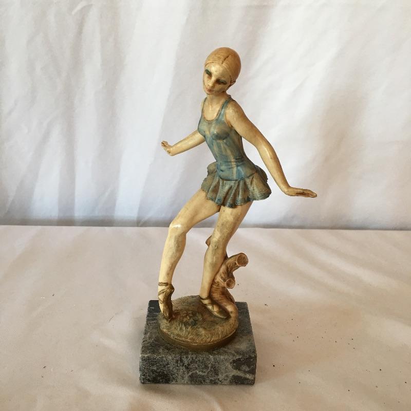 This lovely lot includes a ballerina on a Carrara marble base that was made in Italy. The ballerina appears to be made of an acrylic. This lot also includes a wooden framed print of a woman bathing in an iron tub and a doily with table runner. Frame measures 13.5” x 16.5”.