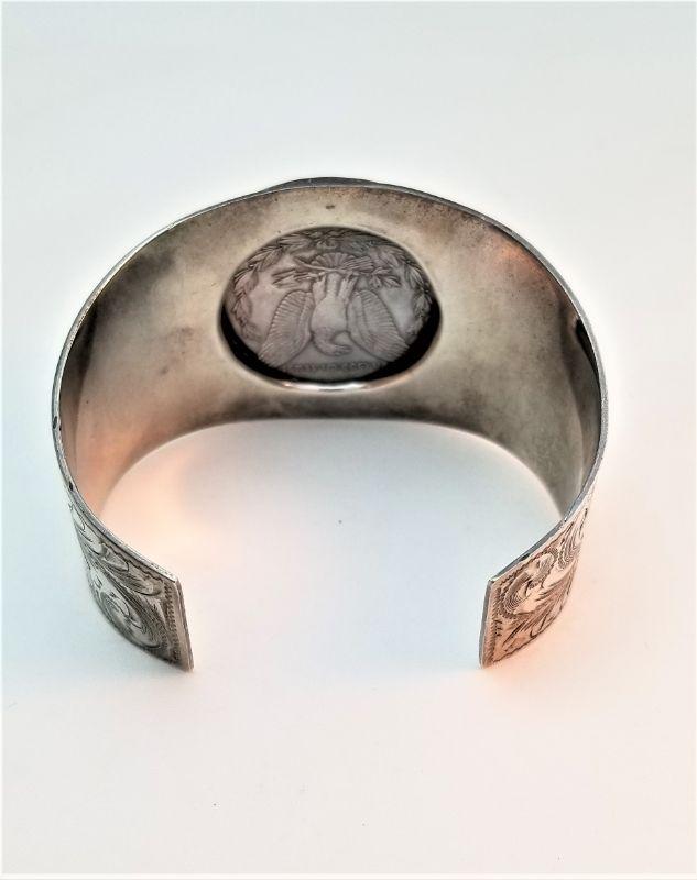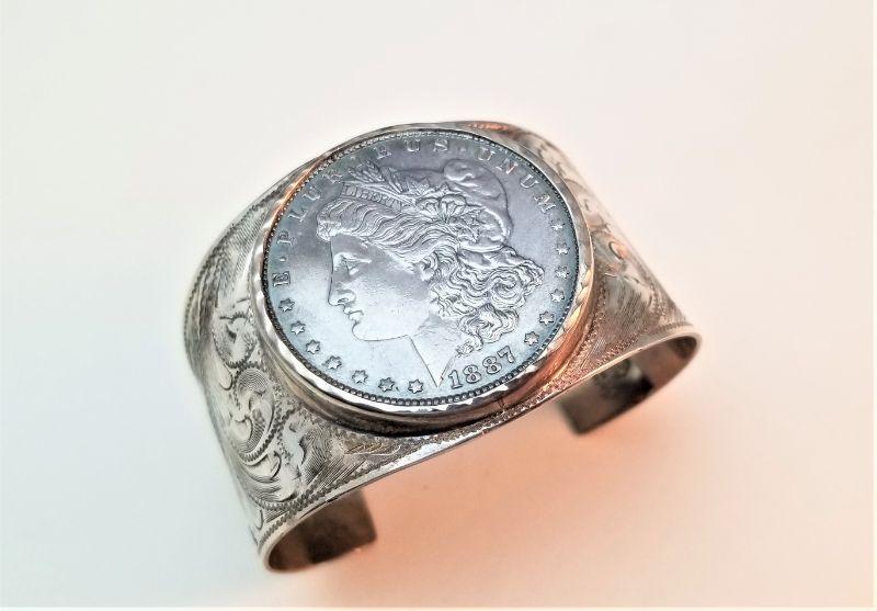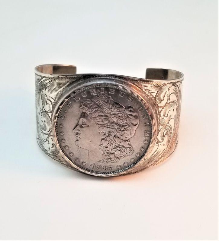Etched Sterling open Cuff Bracelet - Morgan Silver Dollar, 1887, from the Philadelphia mint. Heavy. Measures 1.75" wide at widest point, 6.5" long. Cuff has lovely etched design. A signature piece you would be proud to own.