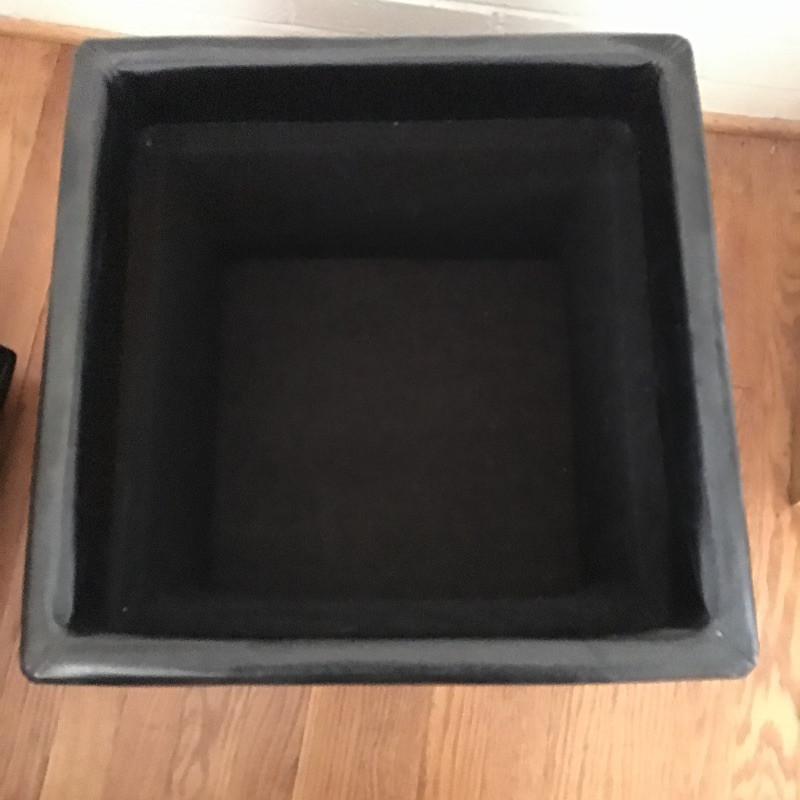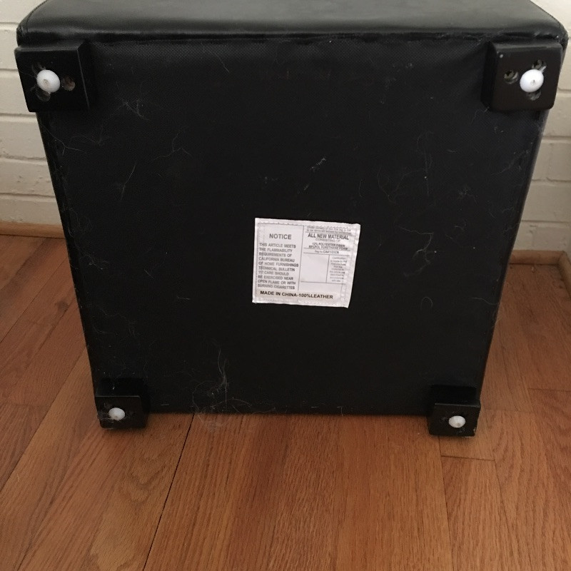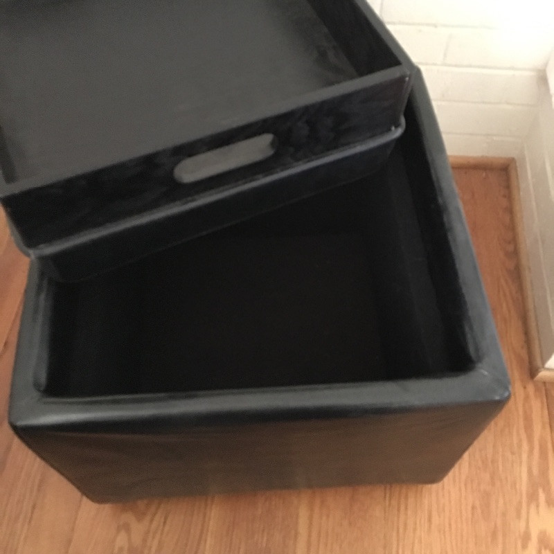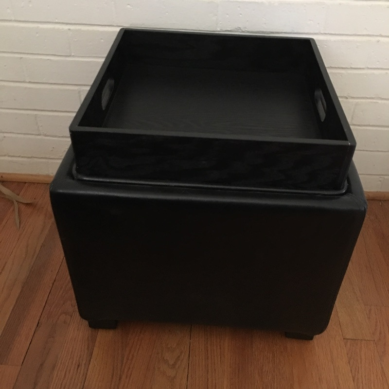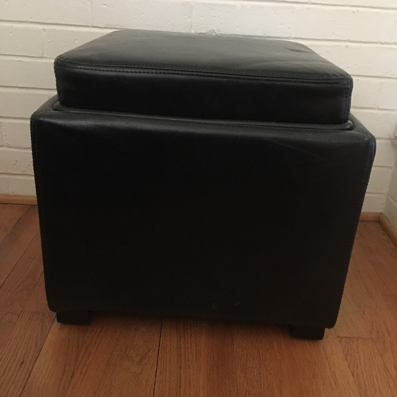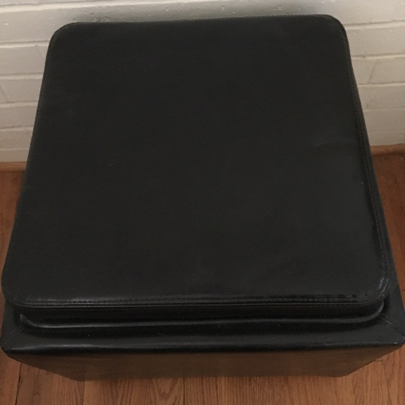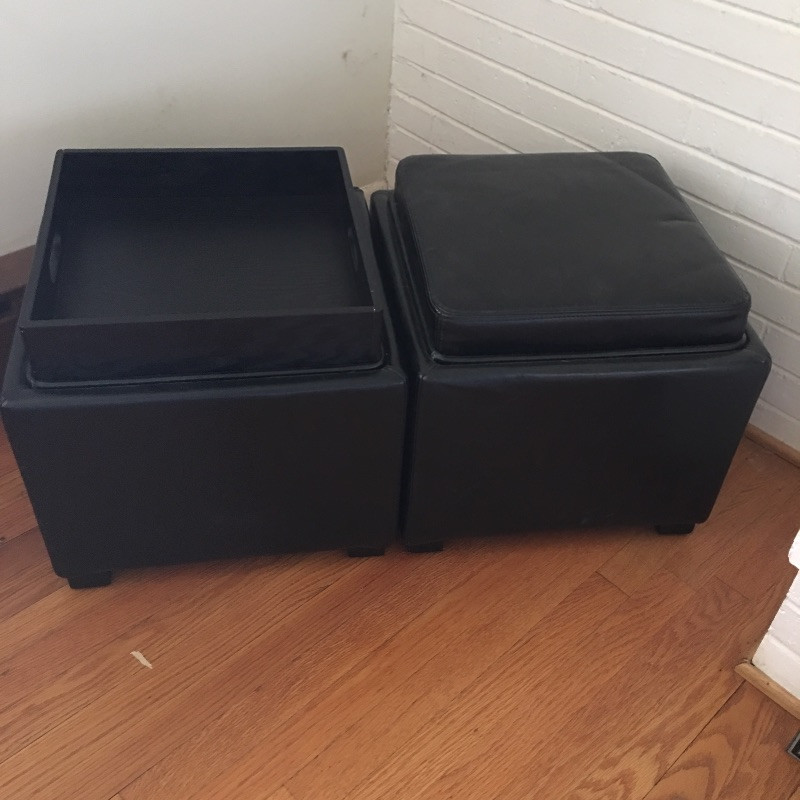 Pair of matching black leather storage ottomans with reversible tops. These handy versatile pieces are great storage options. Both have padding on one side and a table on other side. Ottomans measure 18” x 18” x 17”.