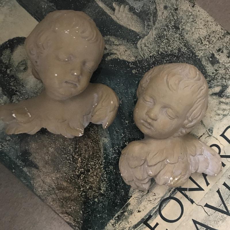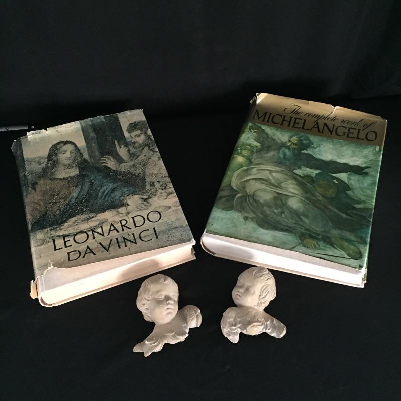 Pair of Coffee Table art books. Davinci (1956 c) and Michelangelo. Also includes a pair of hanging angel art that look like they are hallow ceramic. Books measure 11” x 15” x 2.25” and covers are worn but books are in good shape. Shipping available