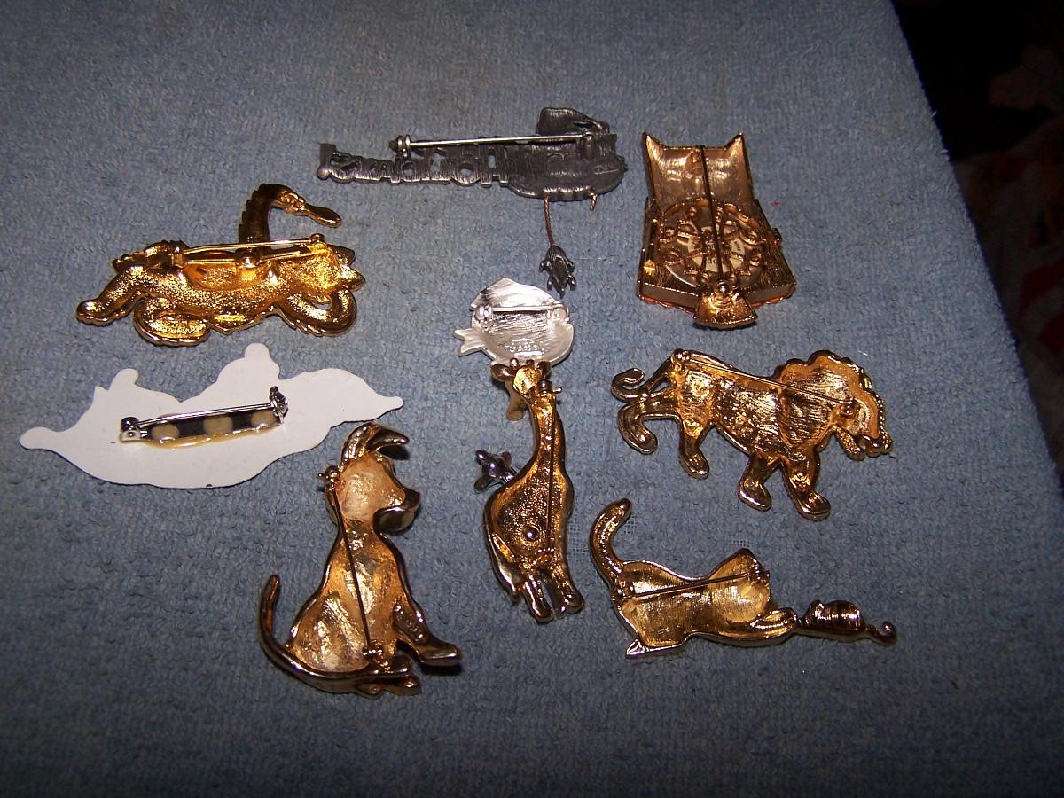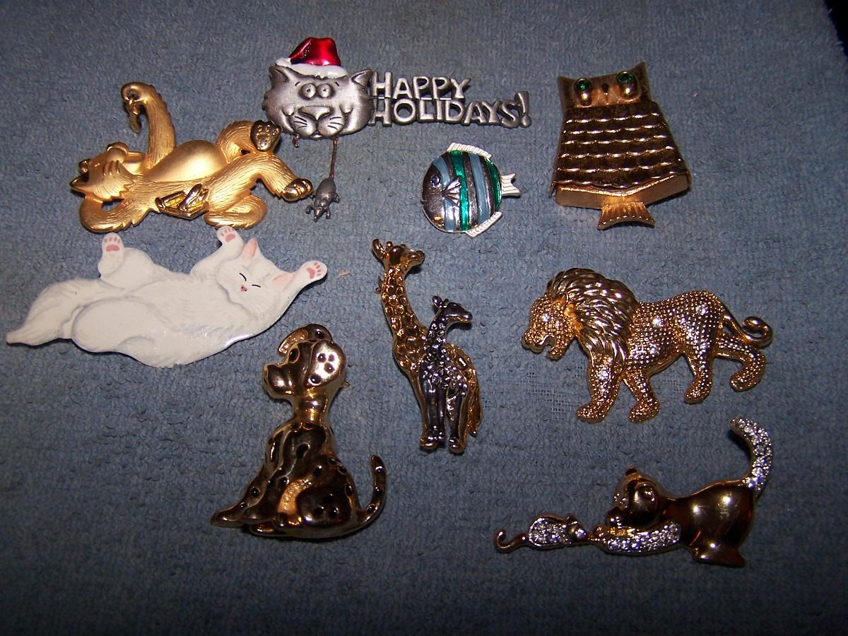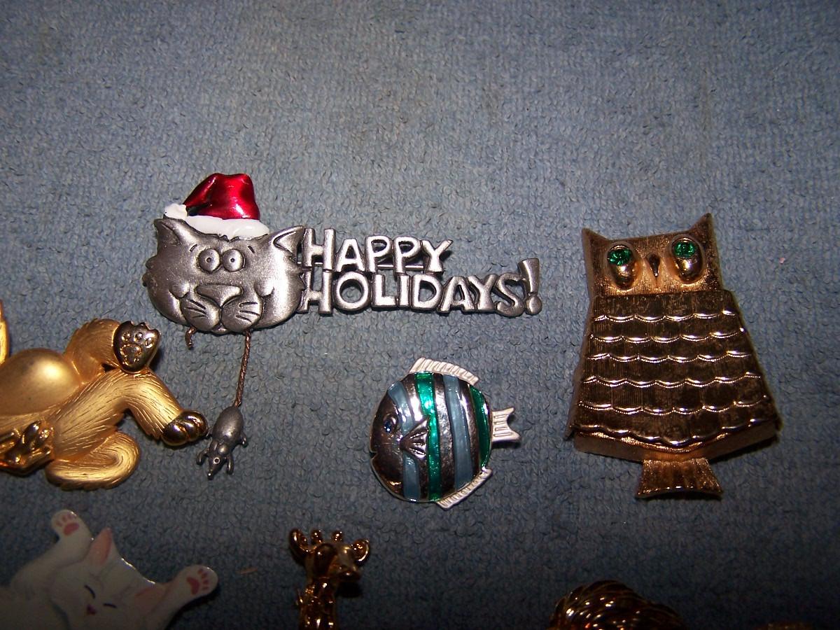 9 METAL COLLECTIBLE FASHION PINS... THE OWL IS AVON, AND STILL HAS PERFUME IN IT....