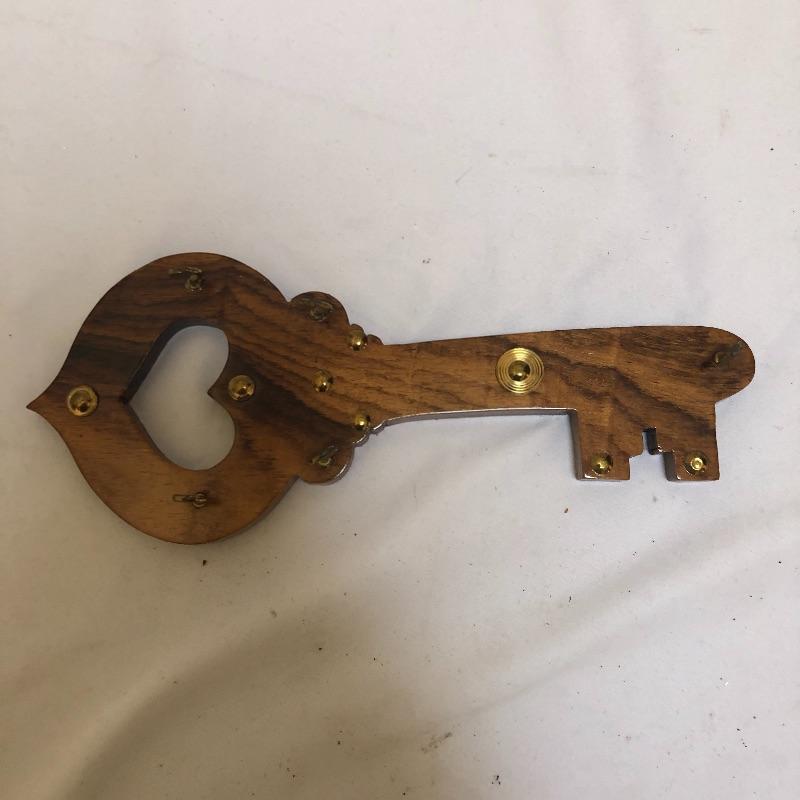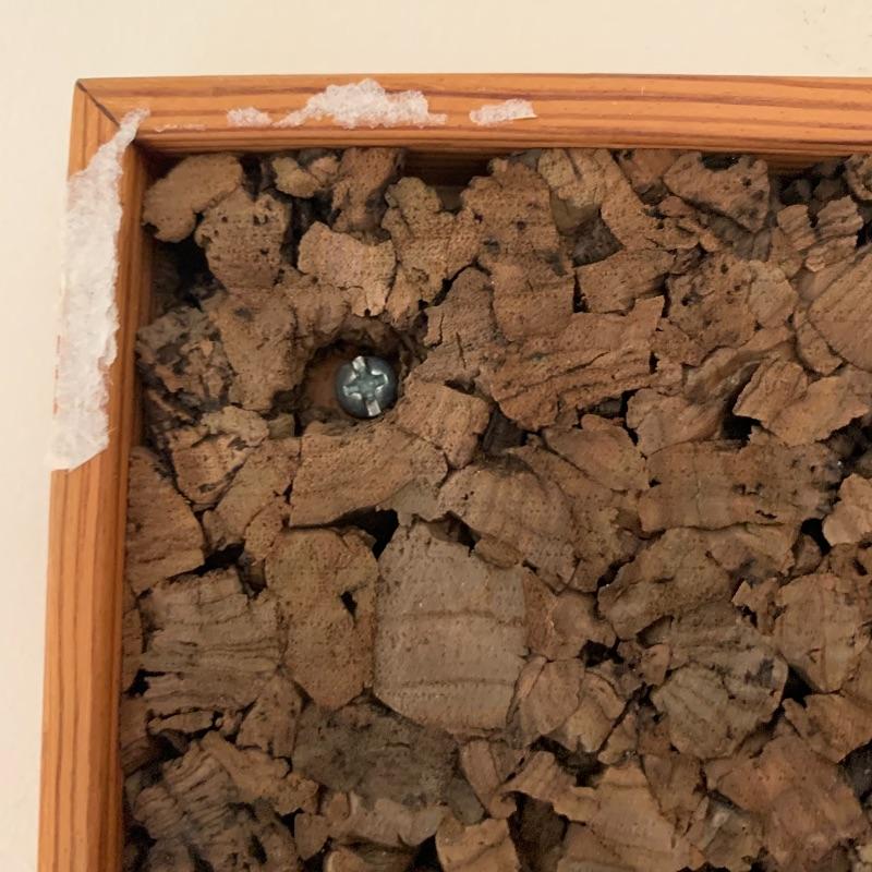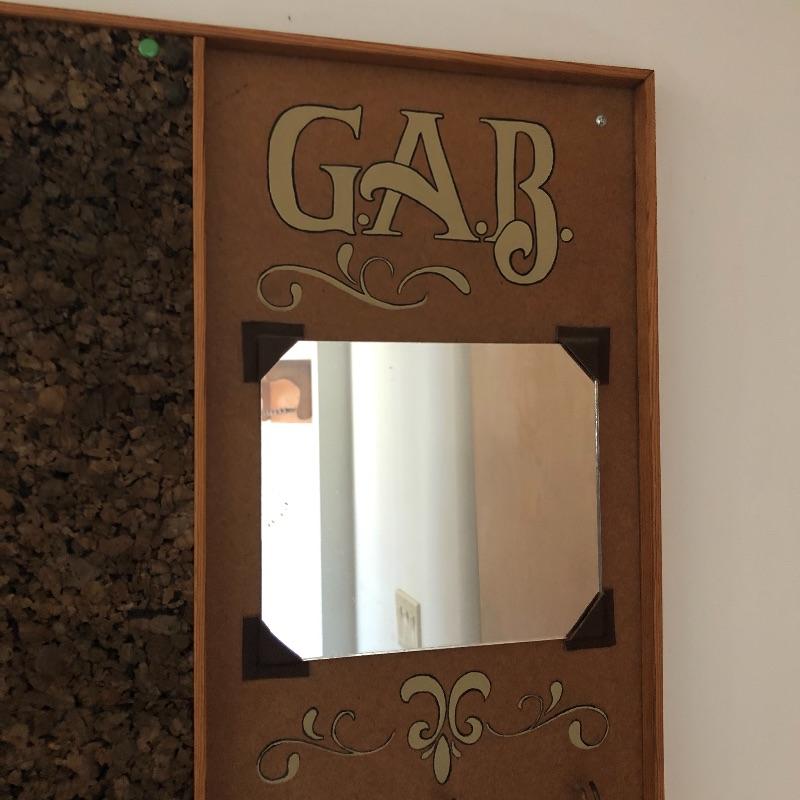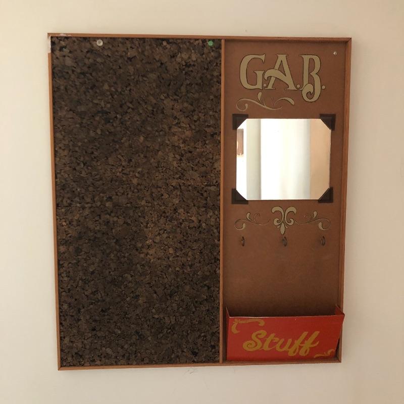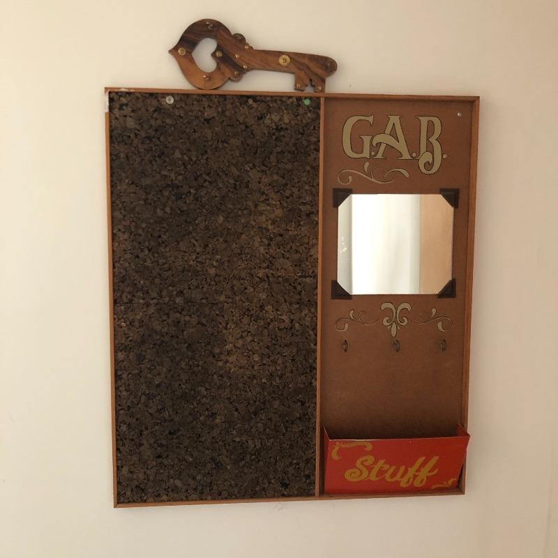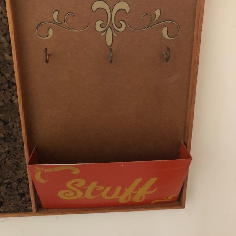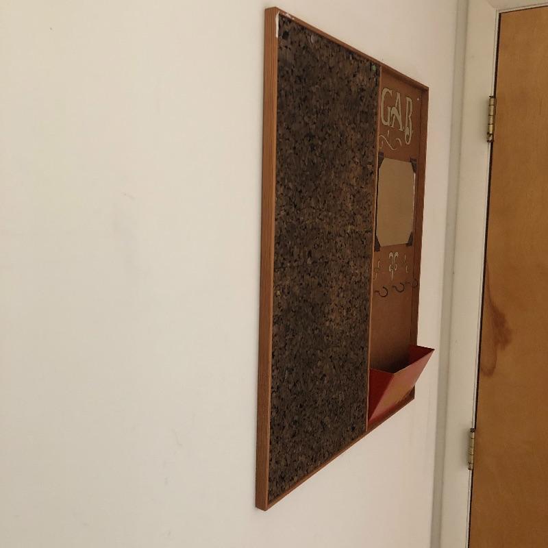 Keep organized with this cork board that has three hooks, mirror and paper holder. Also includes wooden mountable key shaped key holder. The board is mounted onto the wall with screws and can be taken off easily (see photo).